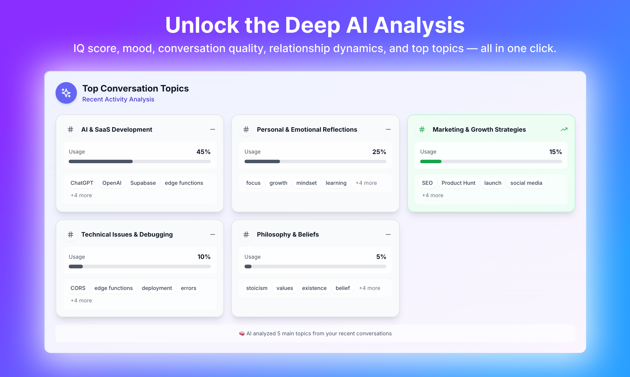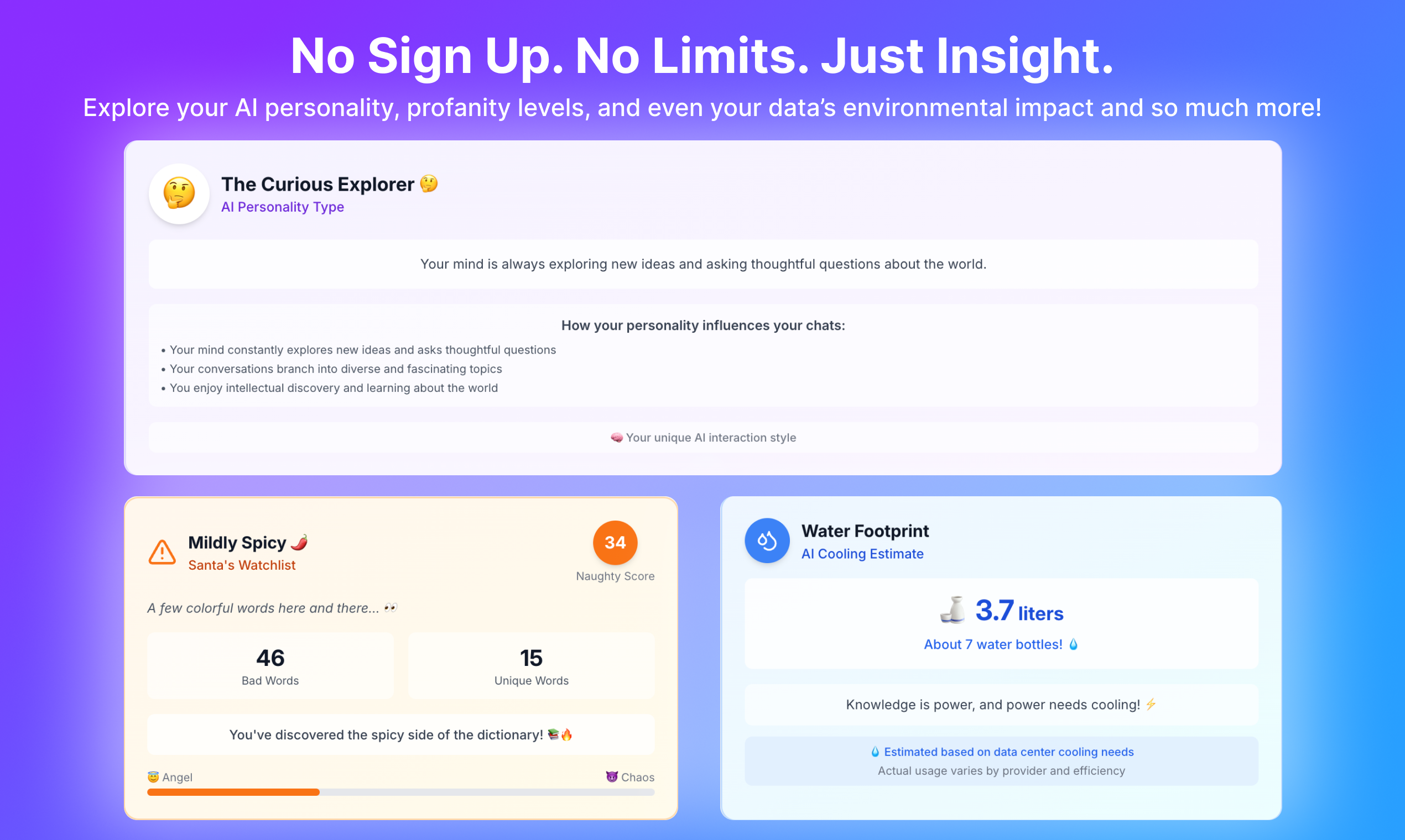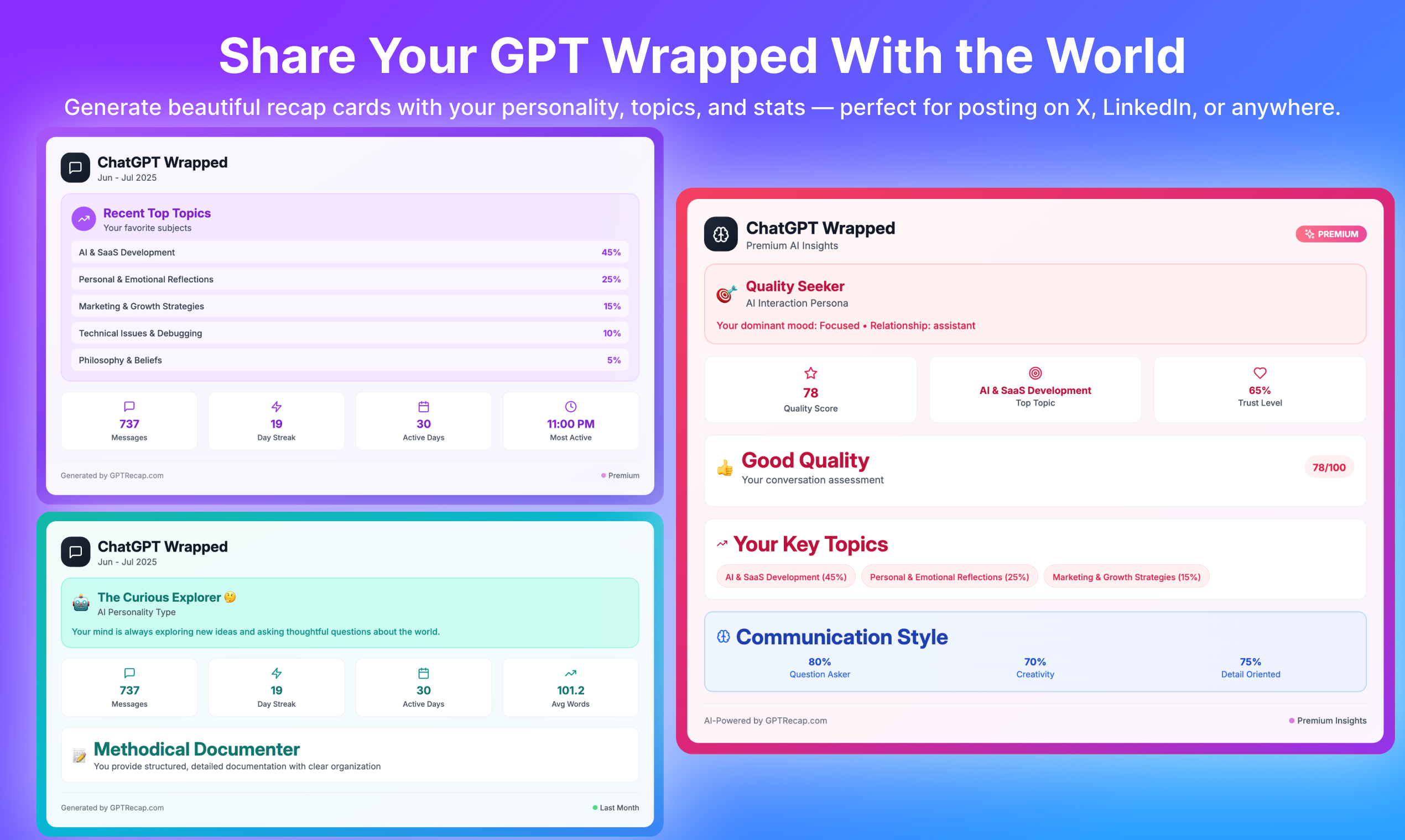 See your ChatGPT Wrapped. Upload your data.zip orjson to reveal your top topics, IQ score, personality traits, profanity usage, AI relationship dynamics, and more. No sign-up. Runs in-browser. Private by default. Like Spotify Wrapped – for your chats.