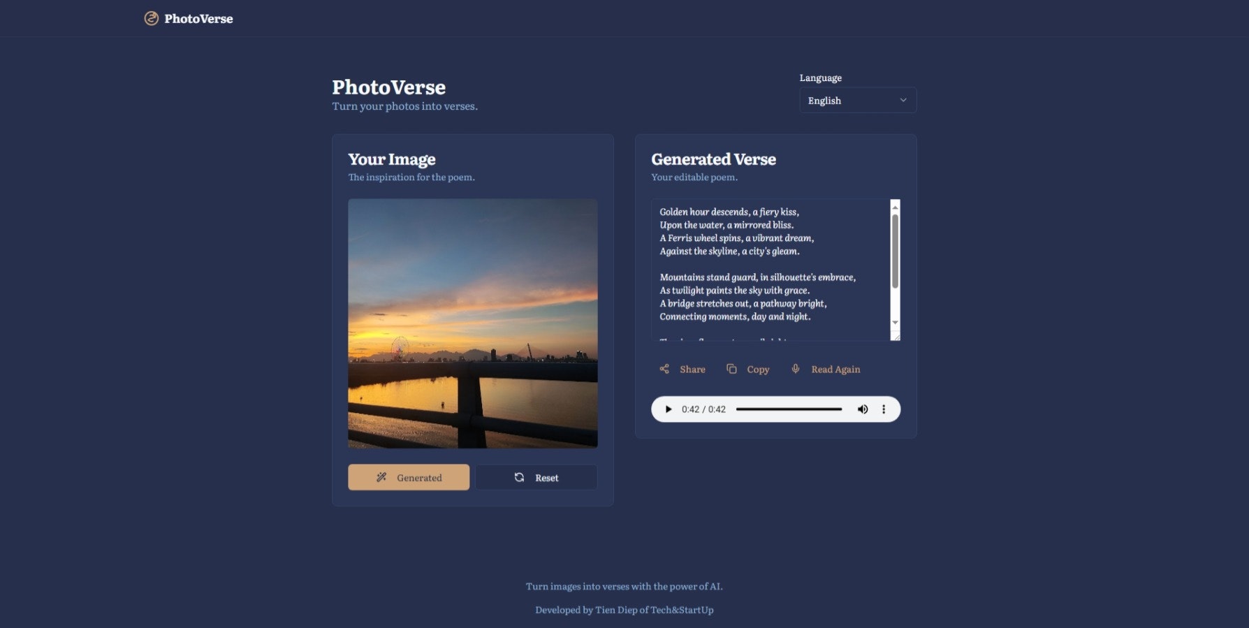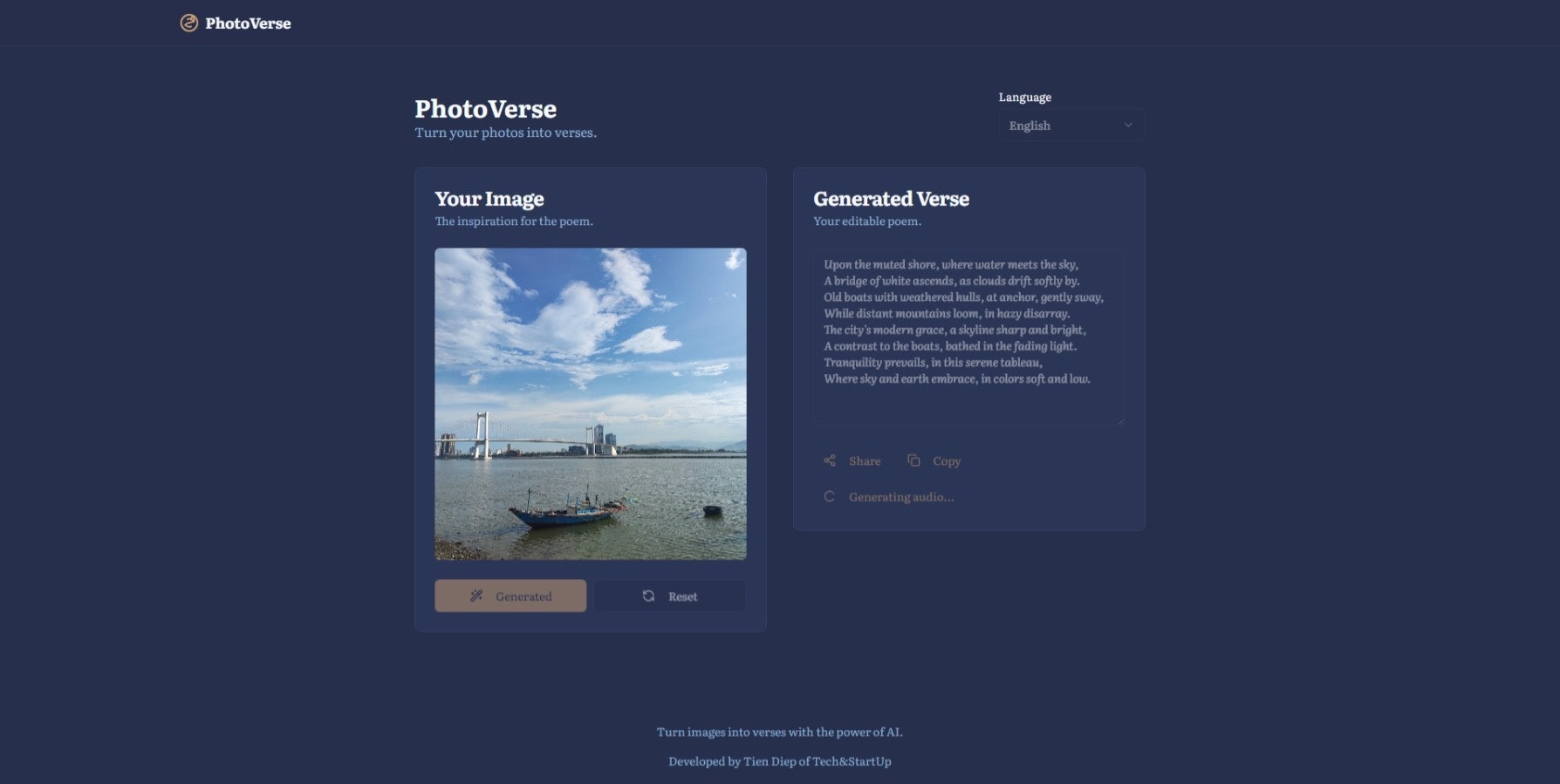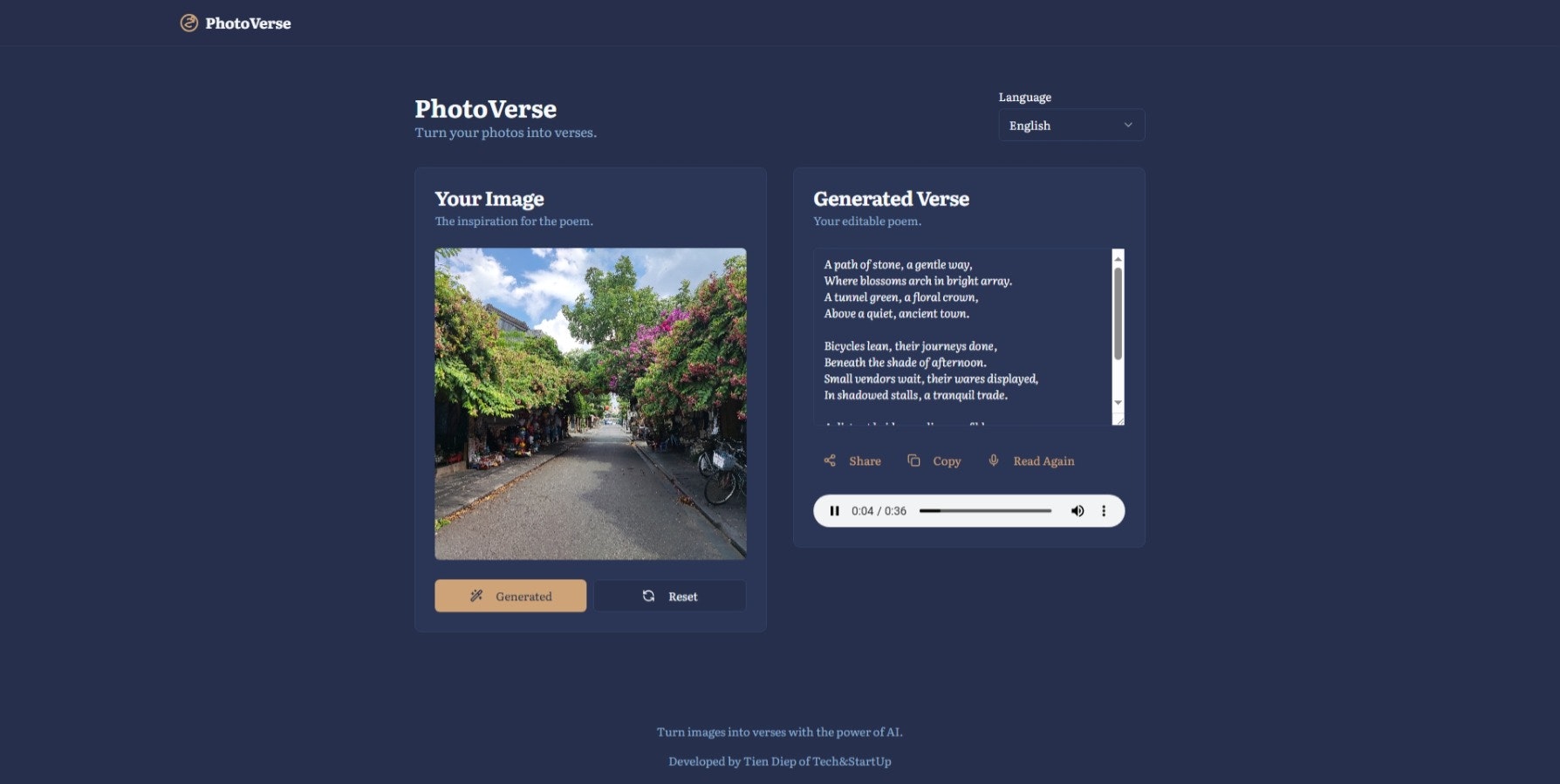 PhotoVerse 📸✍️ uses AI to transform your images into beautiful, one-of-a-kind poems. Just upload a picture, select a language (English, Vietnamese, or Japanese), and watch as it inspires a unique verse. You can even hear your poem read aloud!