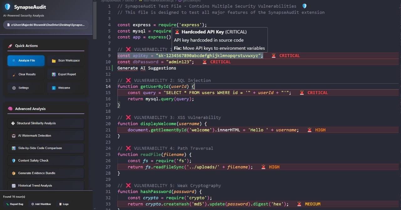 SynapseAudit is an AI-powered security tool for developers, detecting 50+ code vulnerabilities across 20+ languages using LLMs like GPT-4. It offers inline fixes, test case generation, and full local analysis—privacy-first, seamless, and GitHub-integrated.