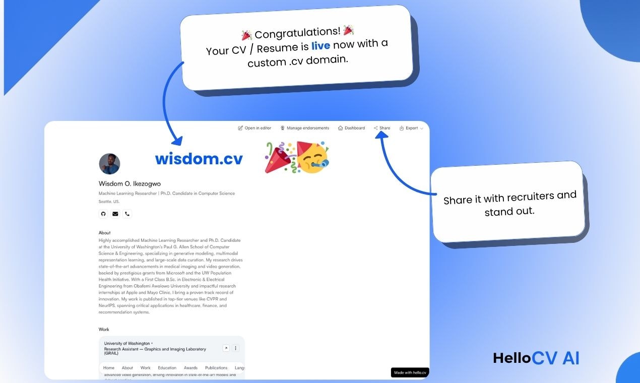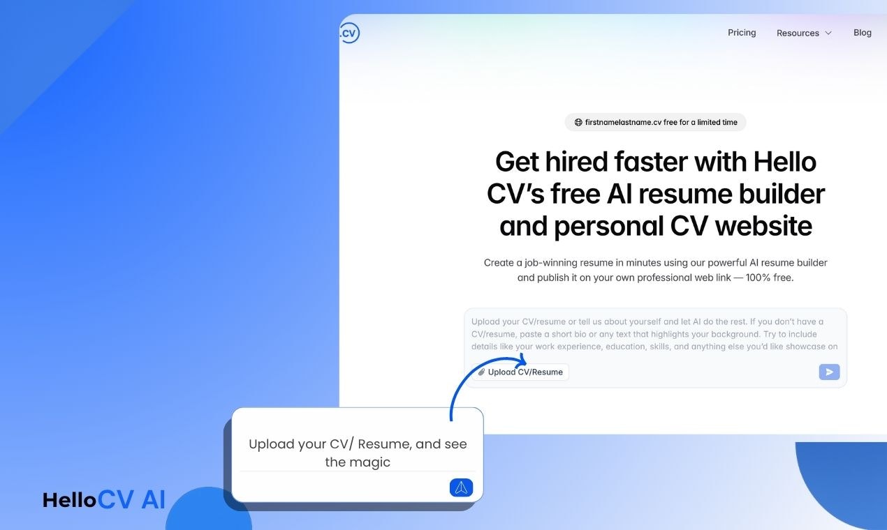 Create a Notion style personal site from your CV or Resume using AI — no code or design skills needed. HelloCV AI helps you stand out, showcase your work, and land more interviews in seconds. Your personal site gets hosted on your FREE custom cv domain.