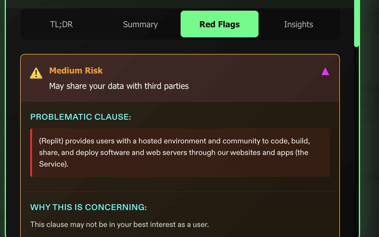扫描服务条款(ToS),识别其中任何有风险的条款,并提供风险等级评估
