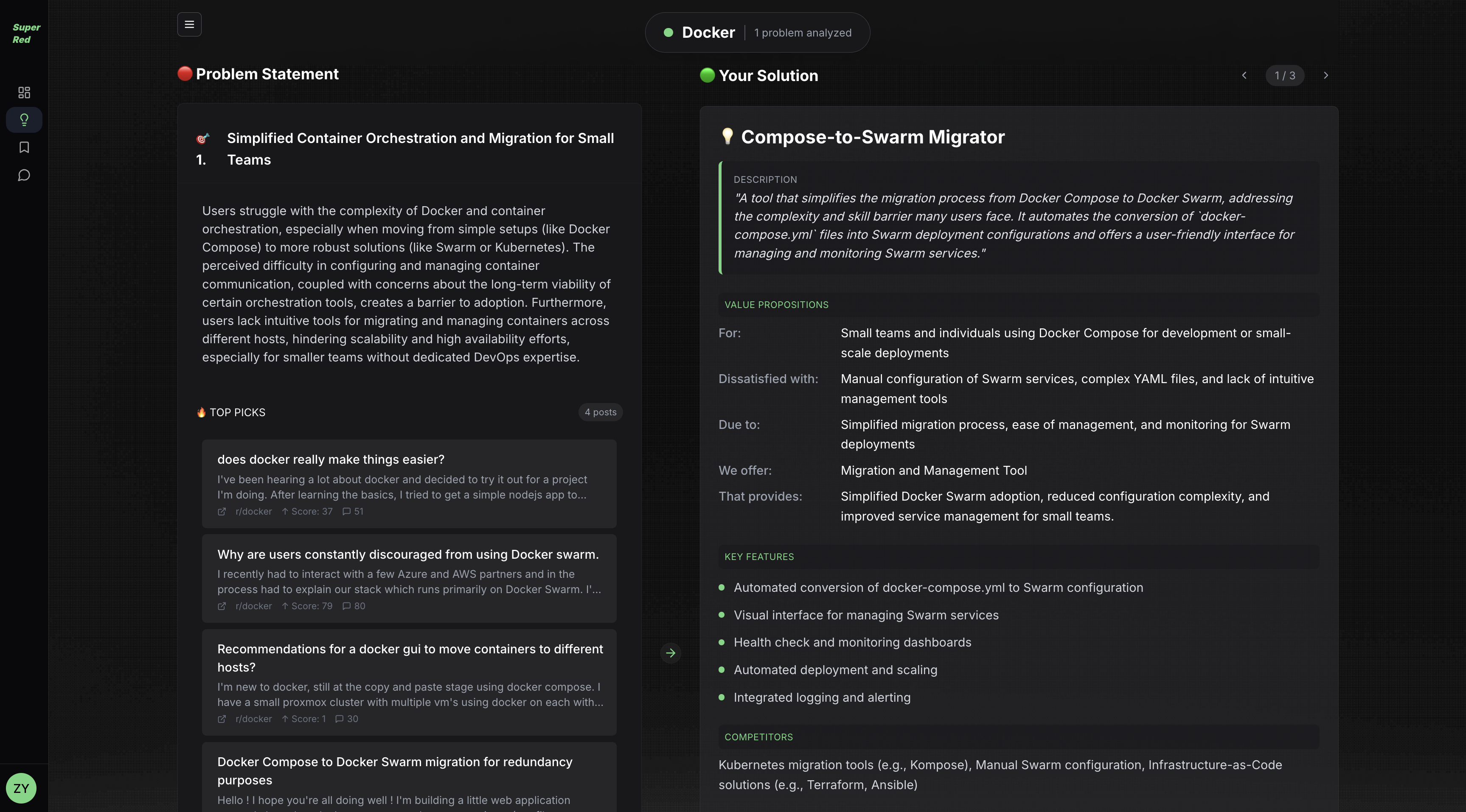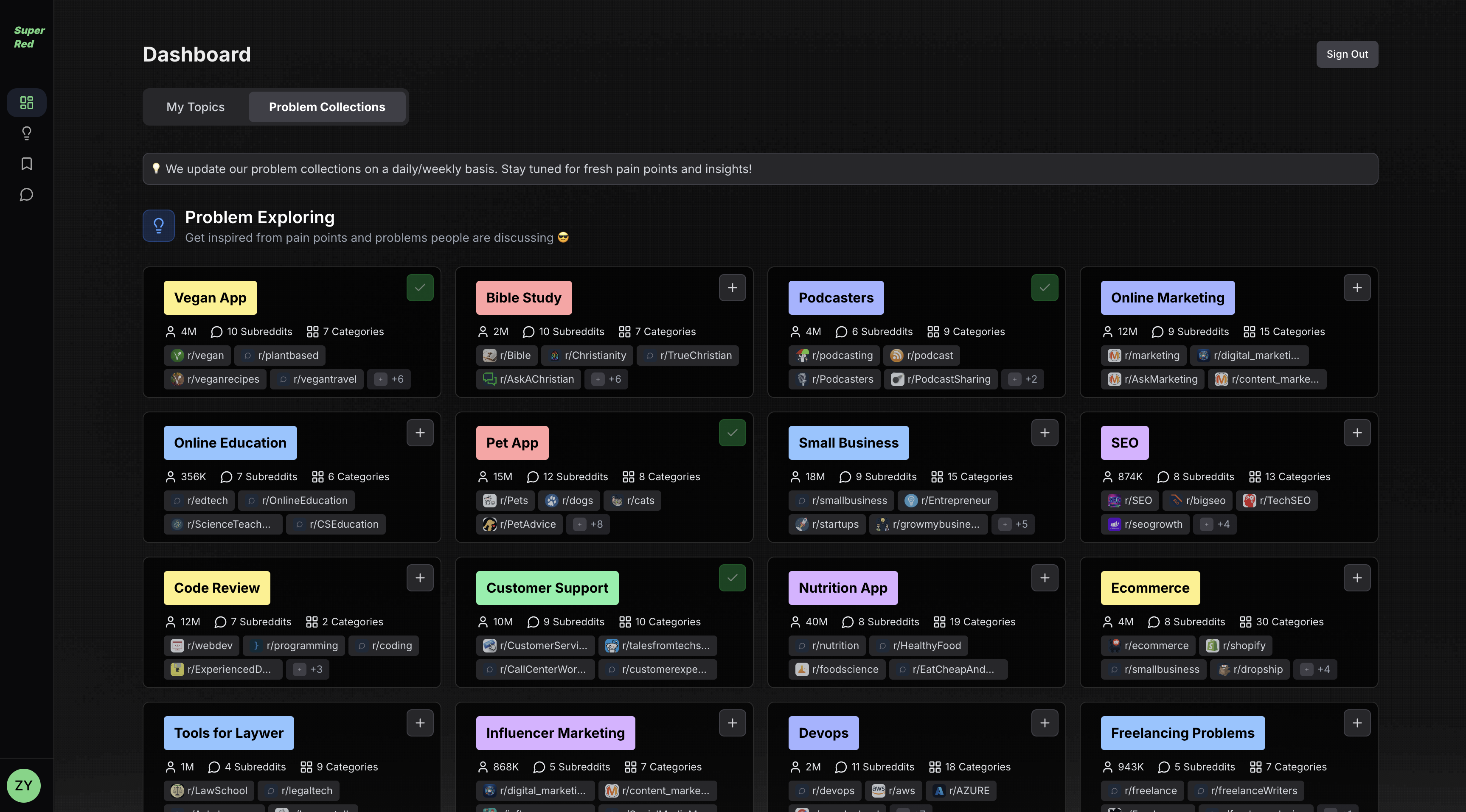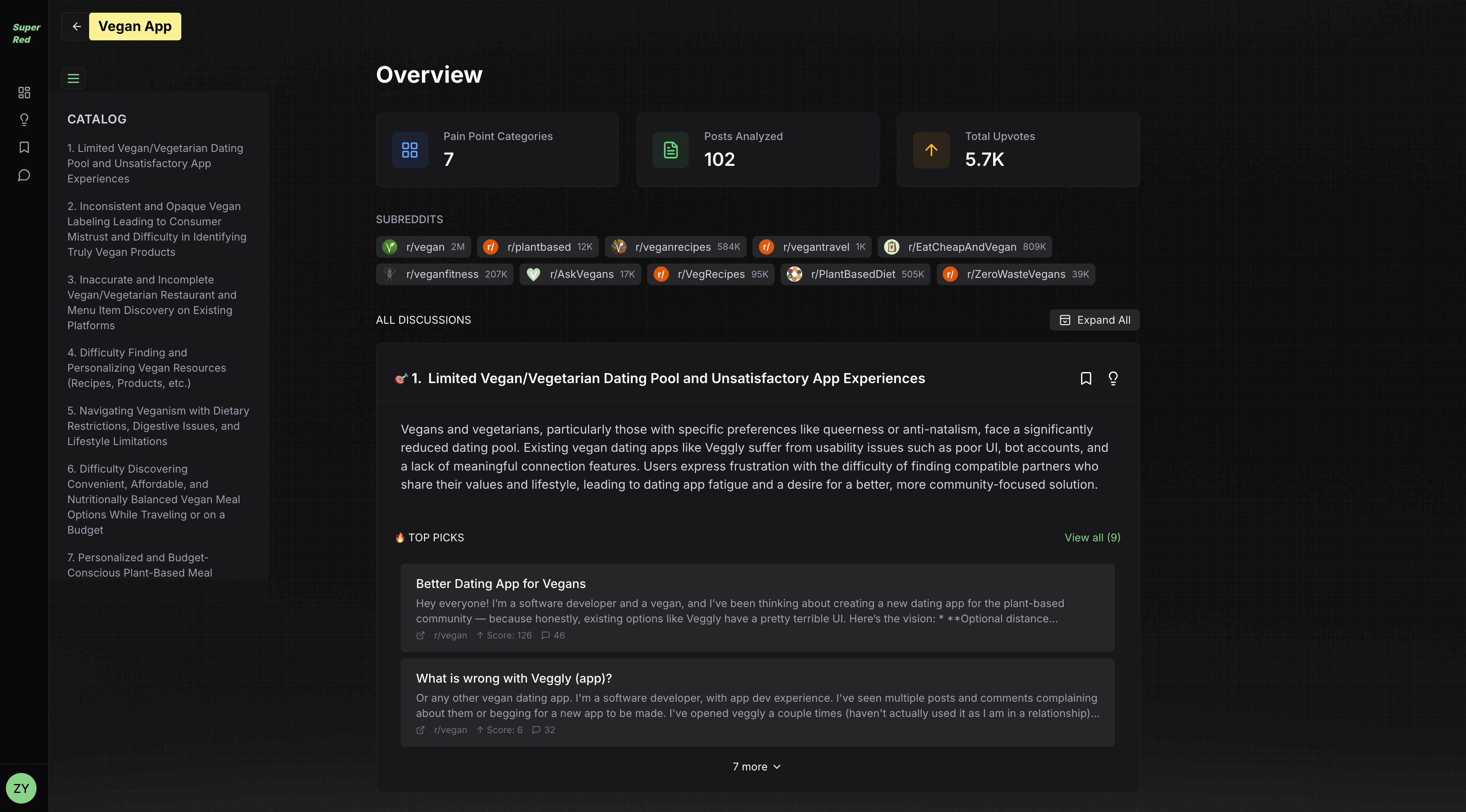 A tool that identifies pain points from Reddit to help discover startup ideas You can: - See what people dislike about existing products - Explore pain point summaries by topic - Get structured ideas with pain point, value prop, competitors, market size etc.