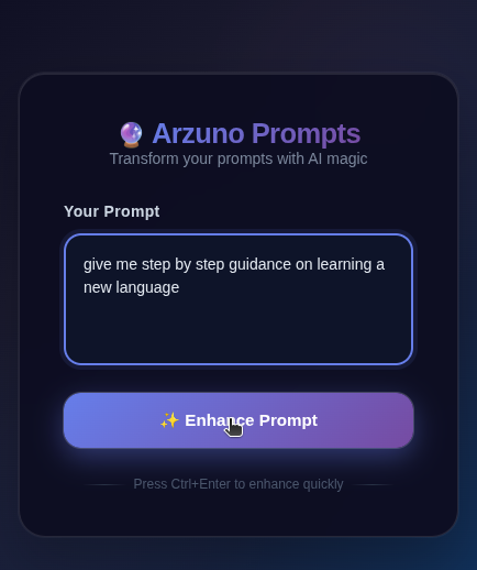 Arzuno Prompts helps you turn any text into a clear, detailed prompt in one click. Just highlight, click, and watch it improve. Great for writing, AI, or ideas. Works on any site. Easy, fast, and saves hours. Try it and boost your content today!