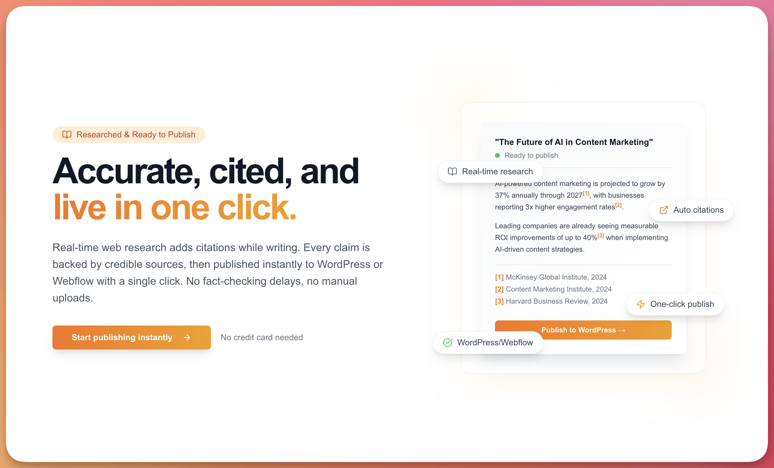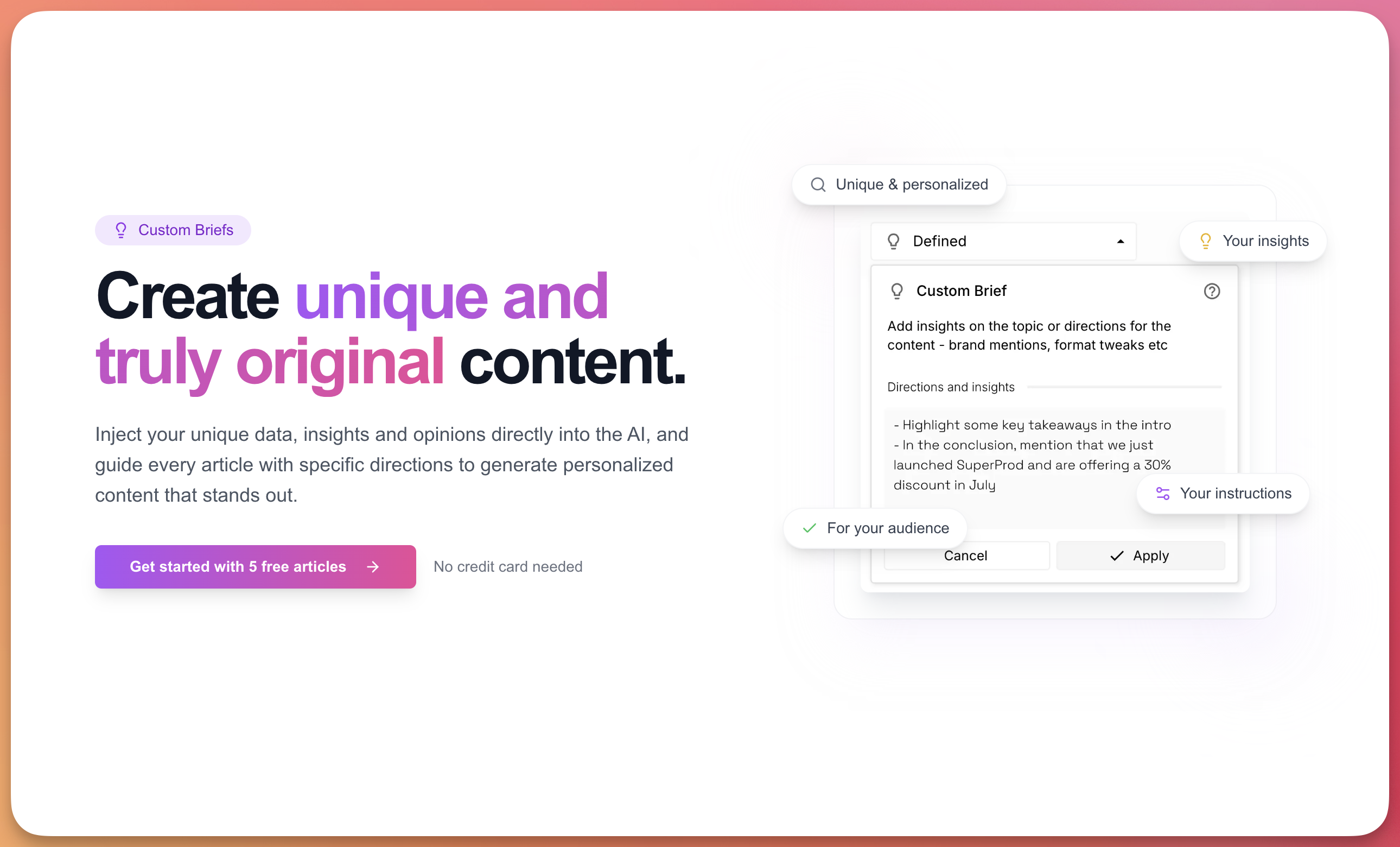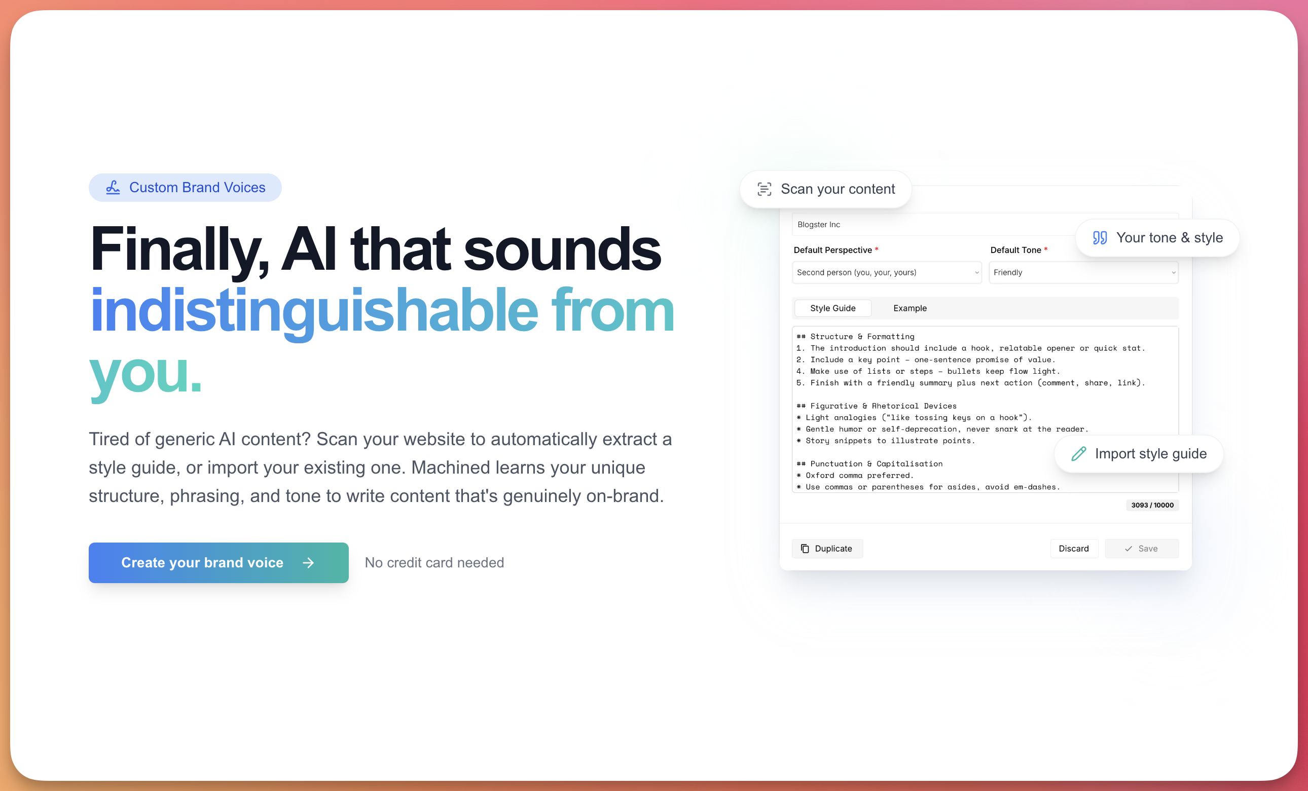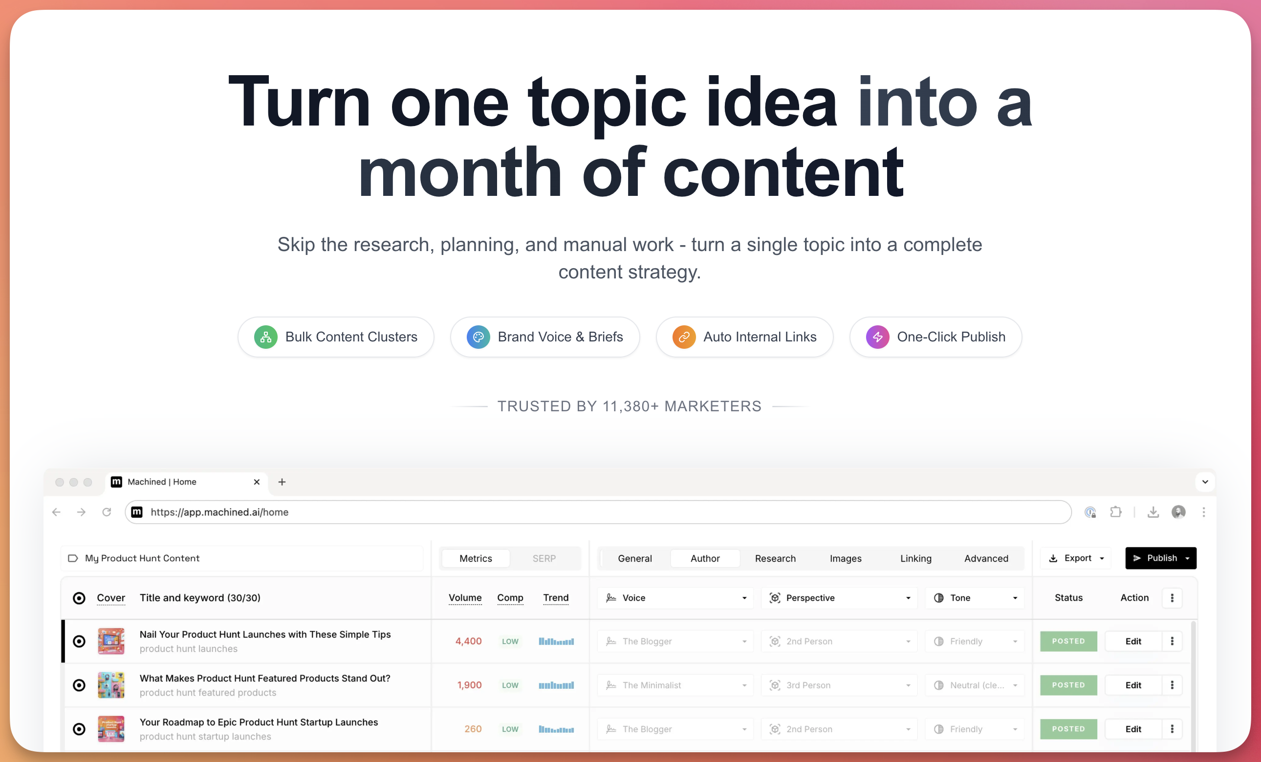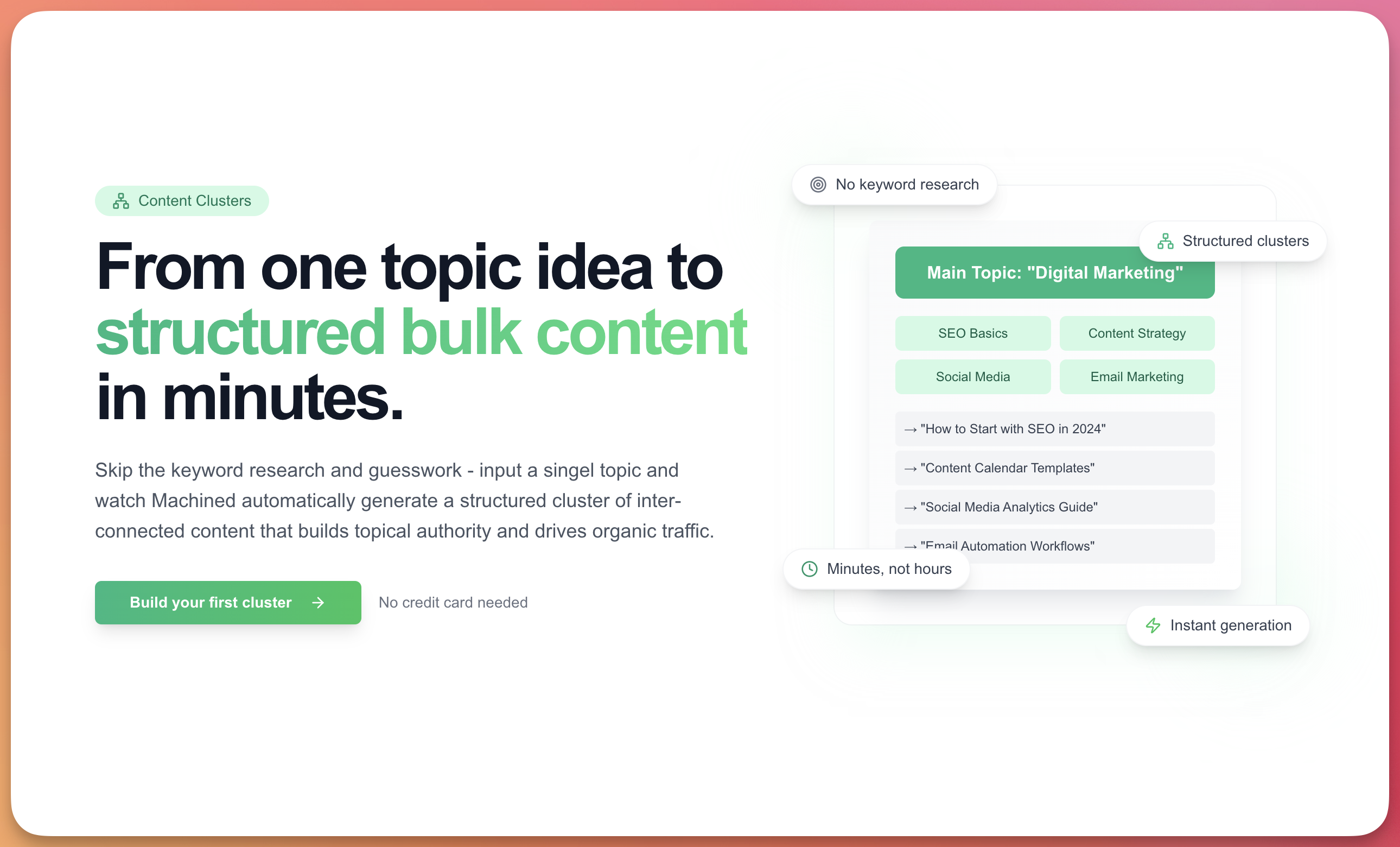 SEO is changing - generic-sounding content doesn’t rank any more. Machined writes structured bulk content in your authentic voice, using your unique insights. Go from one topic idea to 30 ready-to-rank articles in minutes. Your voice, your insights - at scale