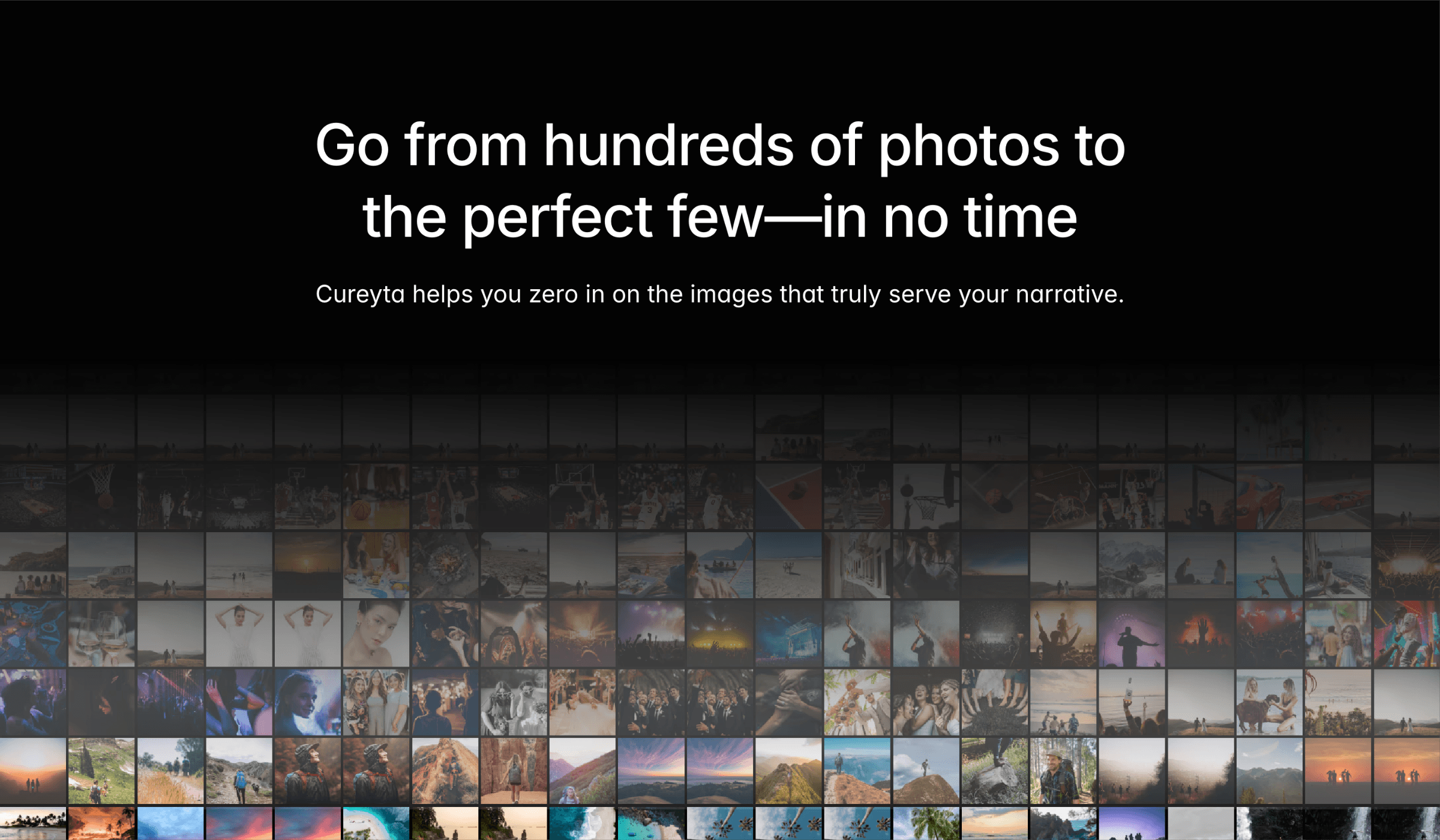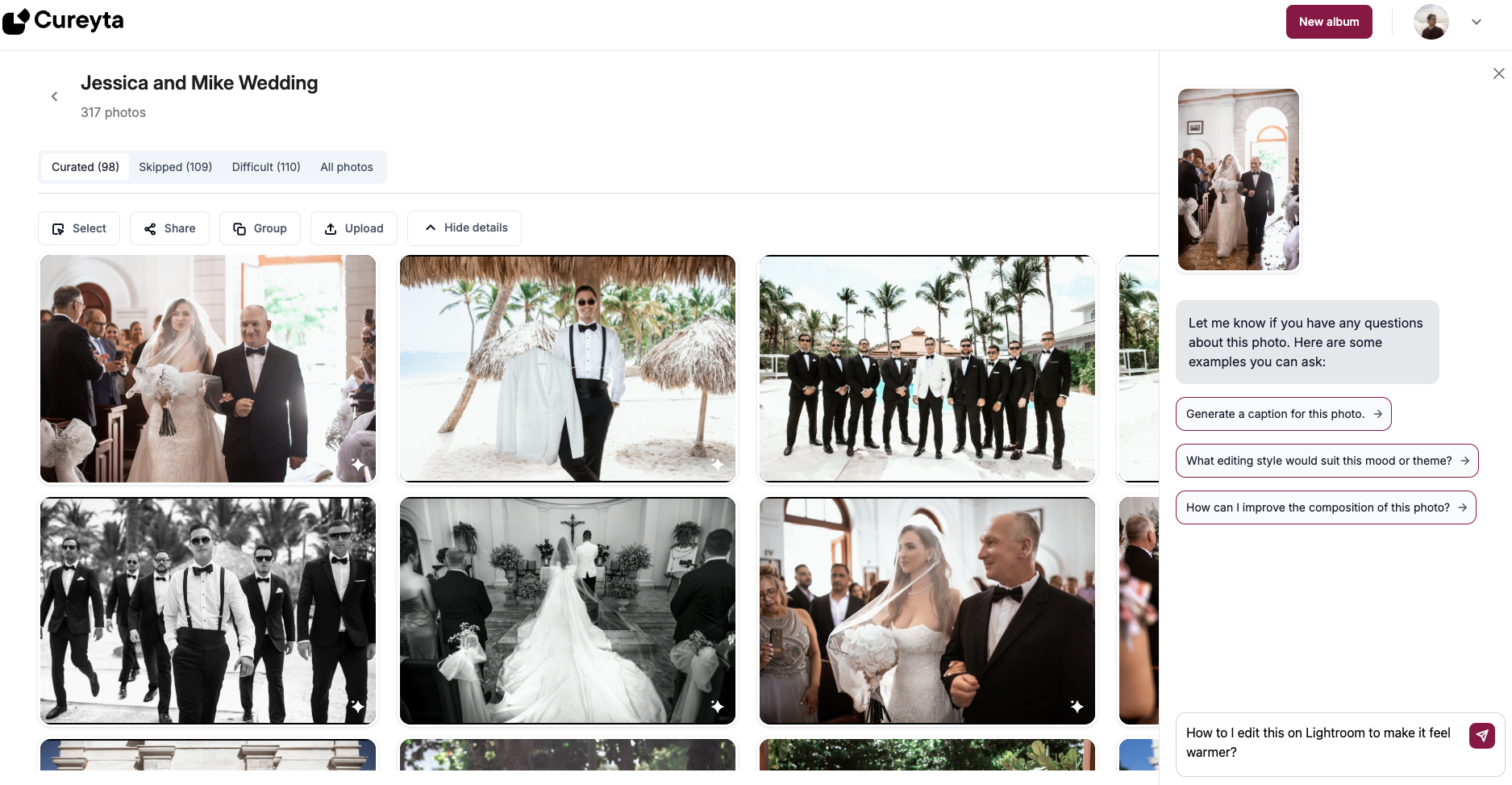 Cureyta lets you upload, organize, and cull thousands of photos—including RAW files—at lightning speed. Instantly find shots by face, location, or similarity, then share curated albums with clients via a simple link. Your photo workflow, reimagined.