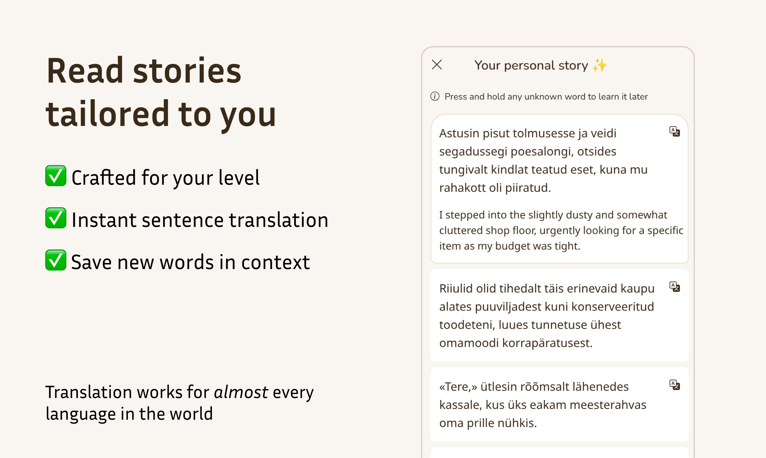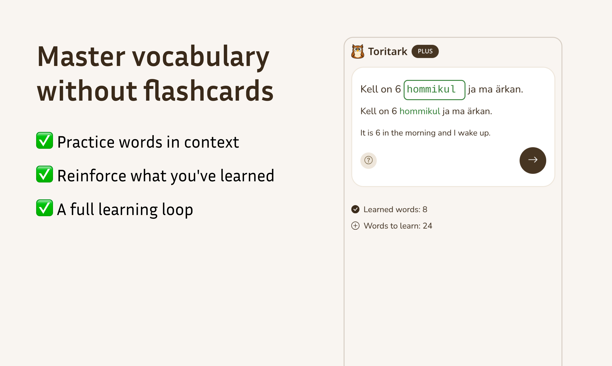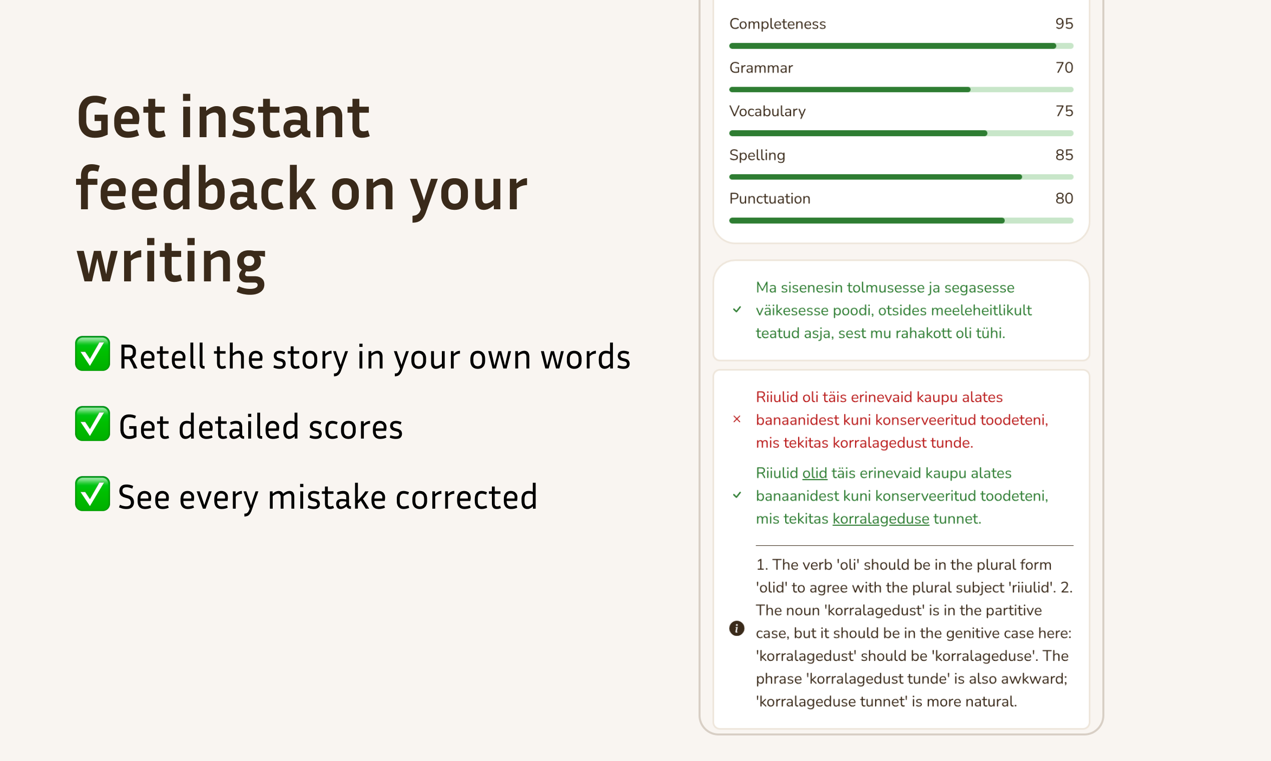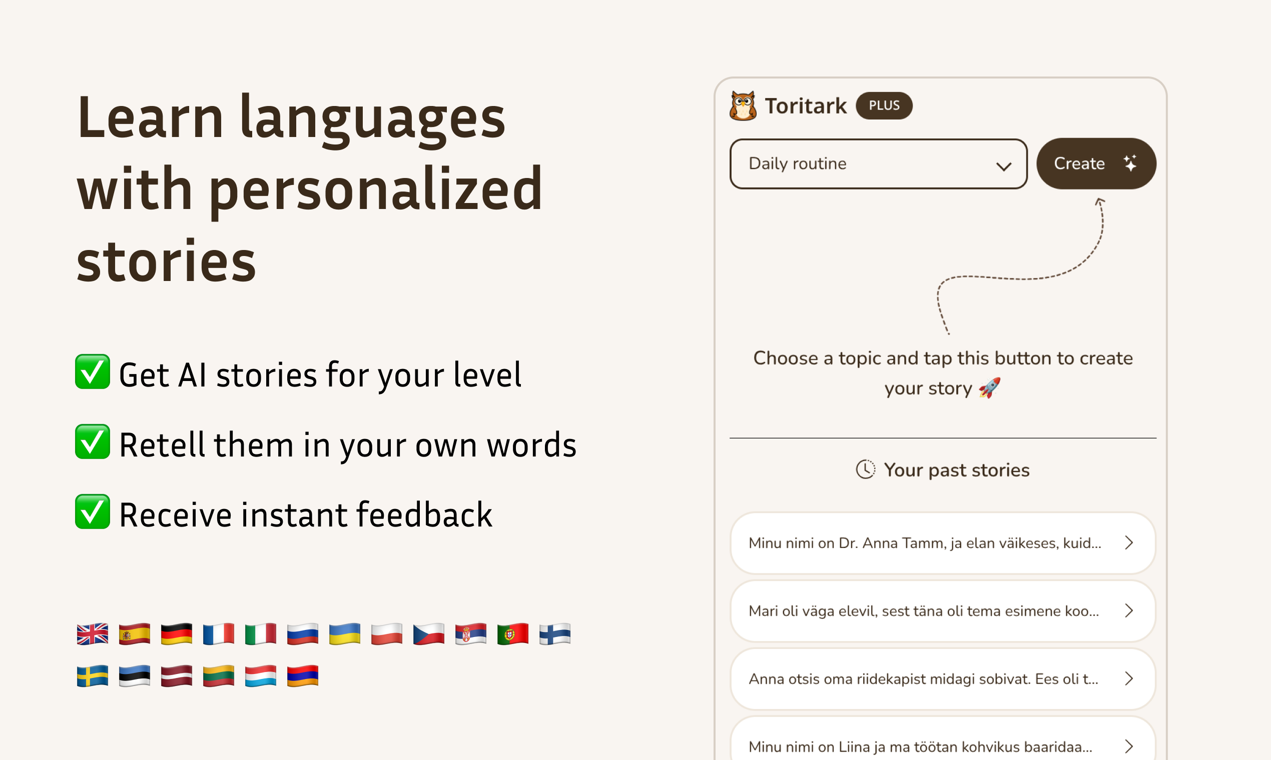 Tired of flashcards? Toritark generates personalized stories for your language level. Read the story, take a quiz, then retell it. The app analyzes your retelling and gives instant, detailed feedback on your grammar, vocabulary, and spelling. Learn by doing.