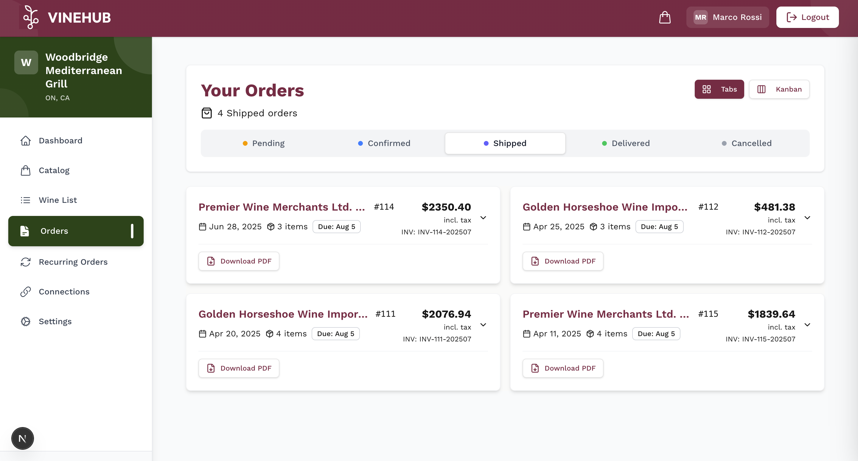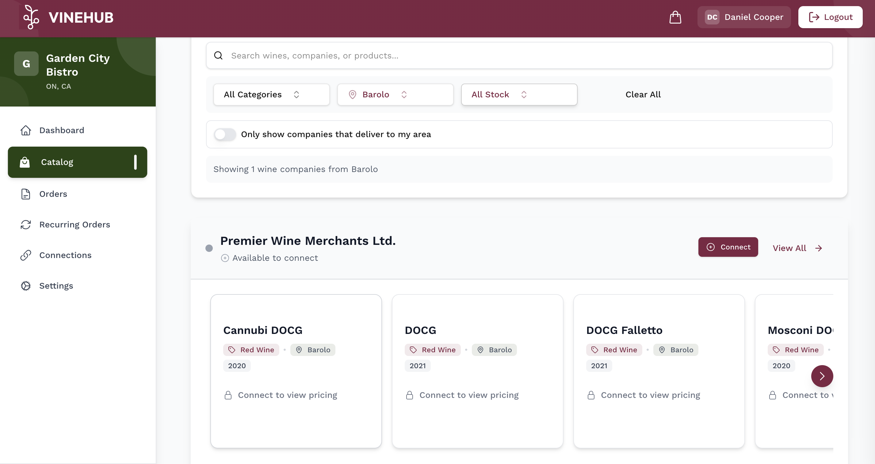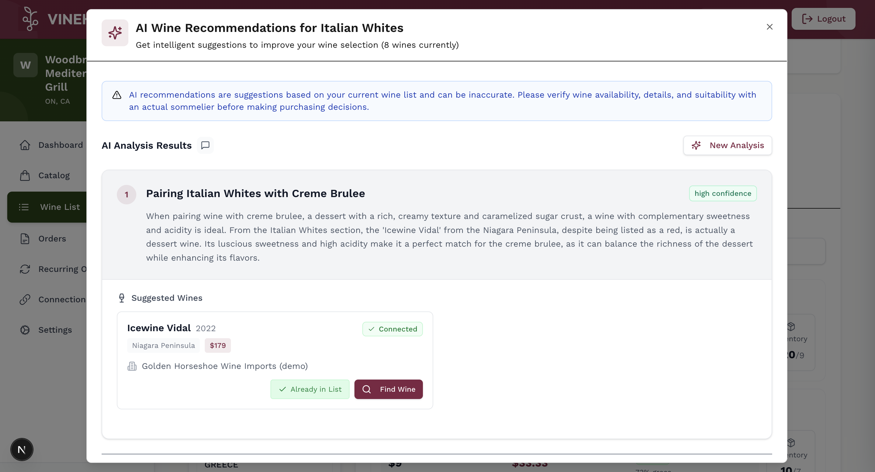 VineHub is an AI-powered wine list platform that helps restaurants and sommeliers build, price, and organize their wine programs. Import your current list, get smart recommendations, and discover real wines from Ontario agencies — all in one place.