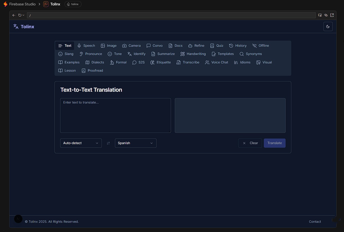 Tolinx is an advanced Language Translator app crafted for seamless, real-time translation across Indian and global languages. Designed with AI precision and cultural sensitivity, it bridges communication gaps effortlessly for a united world.