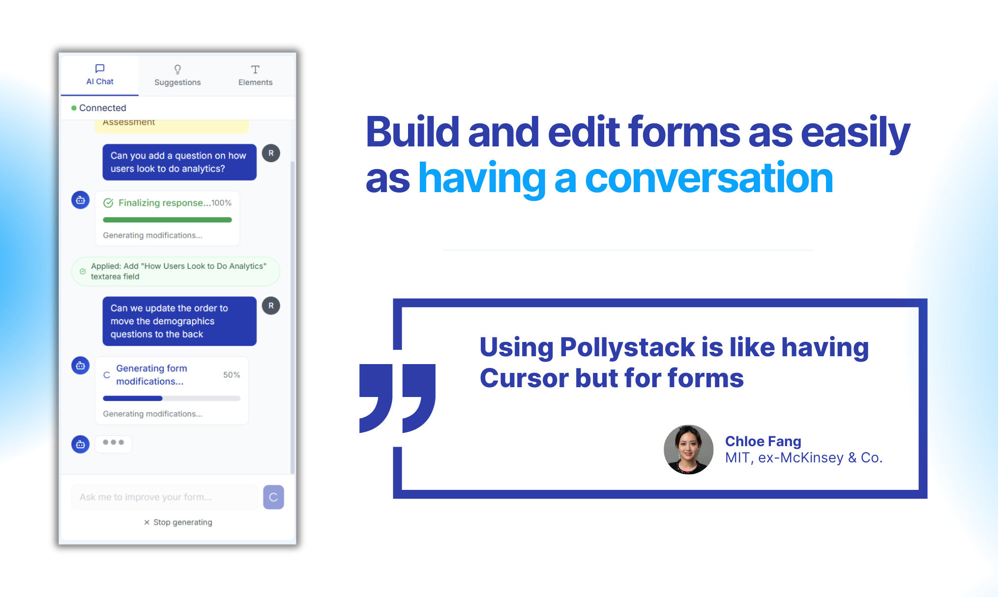Pollystack lets you create on-brand surveys, quizzes, feedback forms, and registration pages through a Cursor-like AI chat or an intuitive drag-and-drop builder. It comes fully loaded with customizable designs and clean charts & graphs for easy analysis.