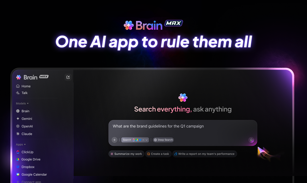 Brain MAX is ClickUp’s fully-native desktop app that maximizes productivity by killing AI Sprawl. Use all AI models, including premium reasoning models for just $9/month. Plus Talk to Text, AI connected to your apps, complete tasks using AI, and much more.