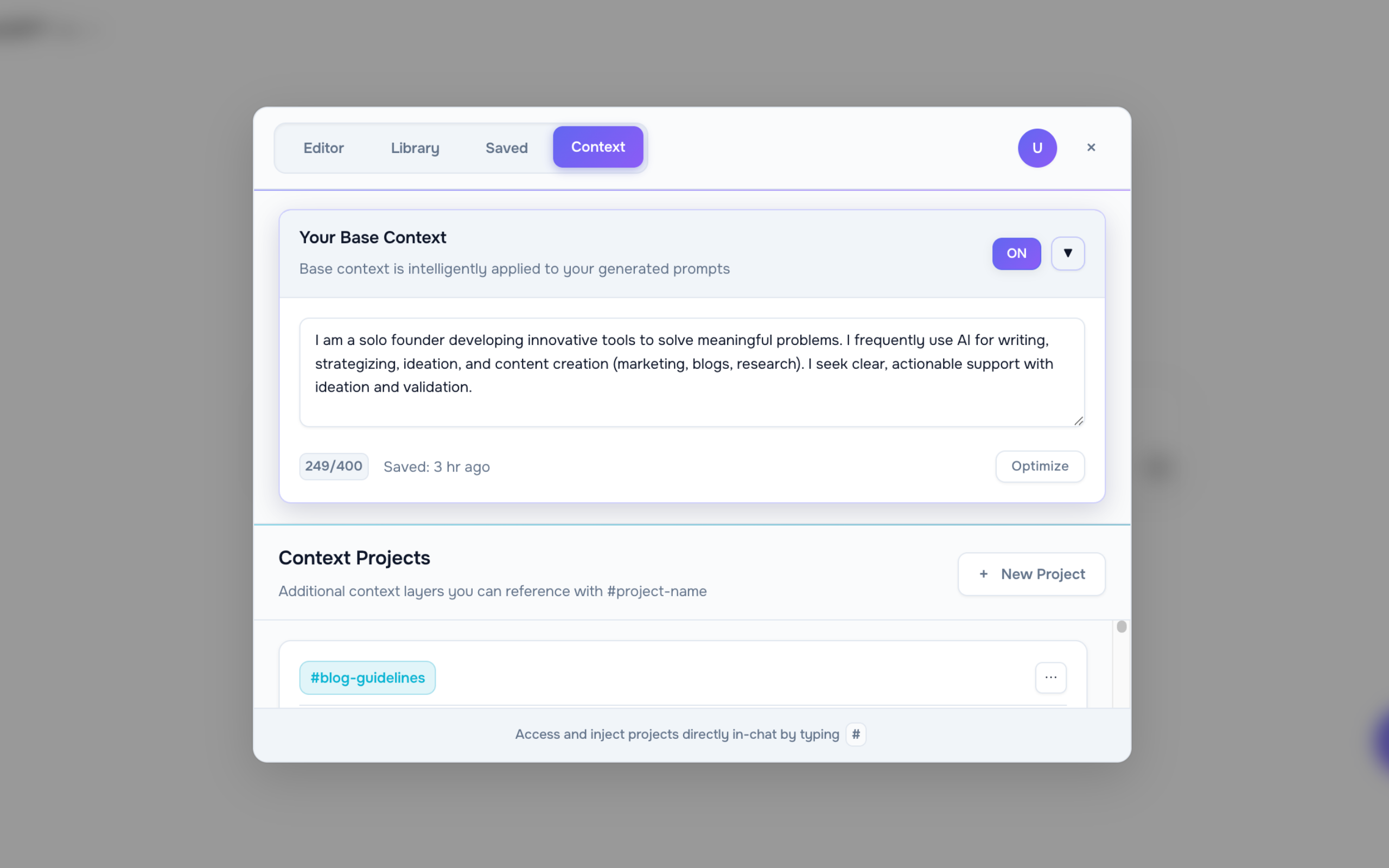 Prompter is a browser extension that rewrites your prompts with your goals, tone, and project details baked in. Instantly turn rough ideas into context rich prompts that deliver actionable results from ChatGPT, Claude, Perplexity and more.