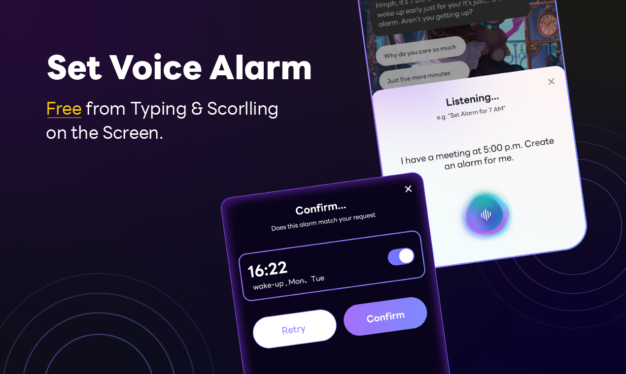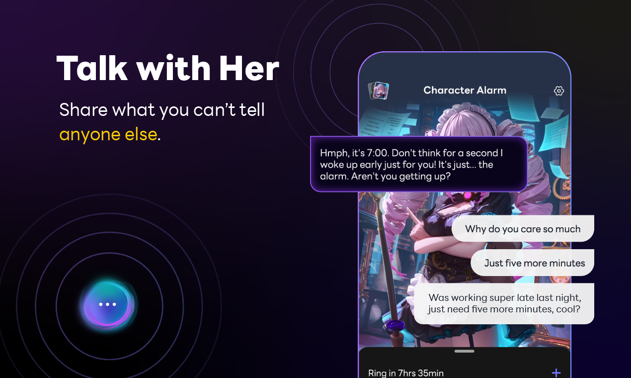 Character Alarm provides countless AI characters, explore an infinite number of wake-up styles that alarm you. It lets you choose from sweet BFFs, anime crushes, quirky roommates & more. It's more than an alarm — it’s your daily AI companion.
