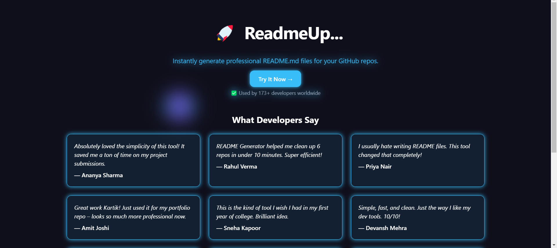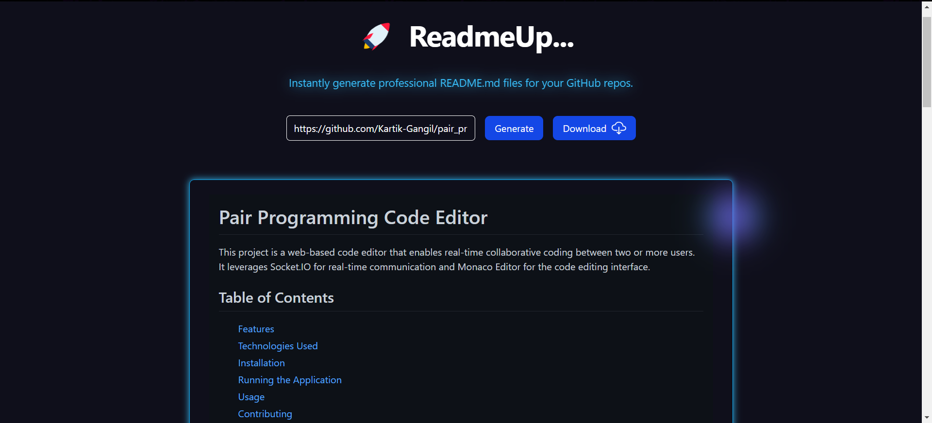 🚀 Readmeup helps you instantly create clean, professional, and structured README files for your projects. Add features, tech stack, guides & more — with live preview and markdown export. Perfect for devs, students & indie hackers. Try it now!