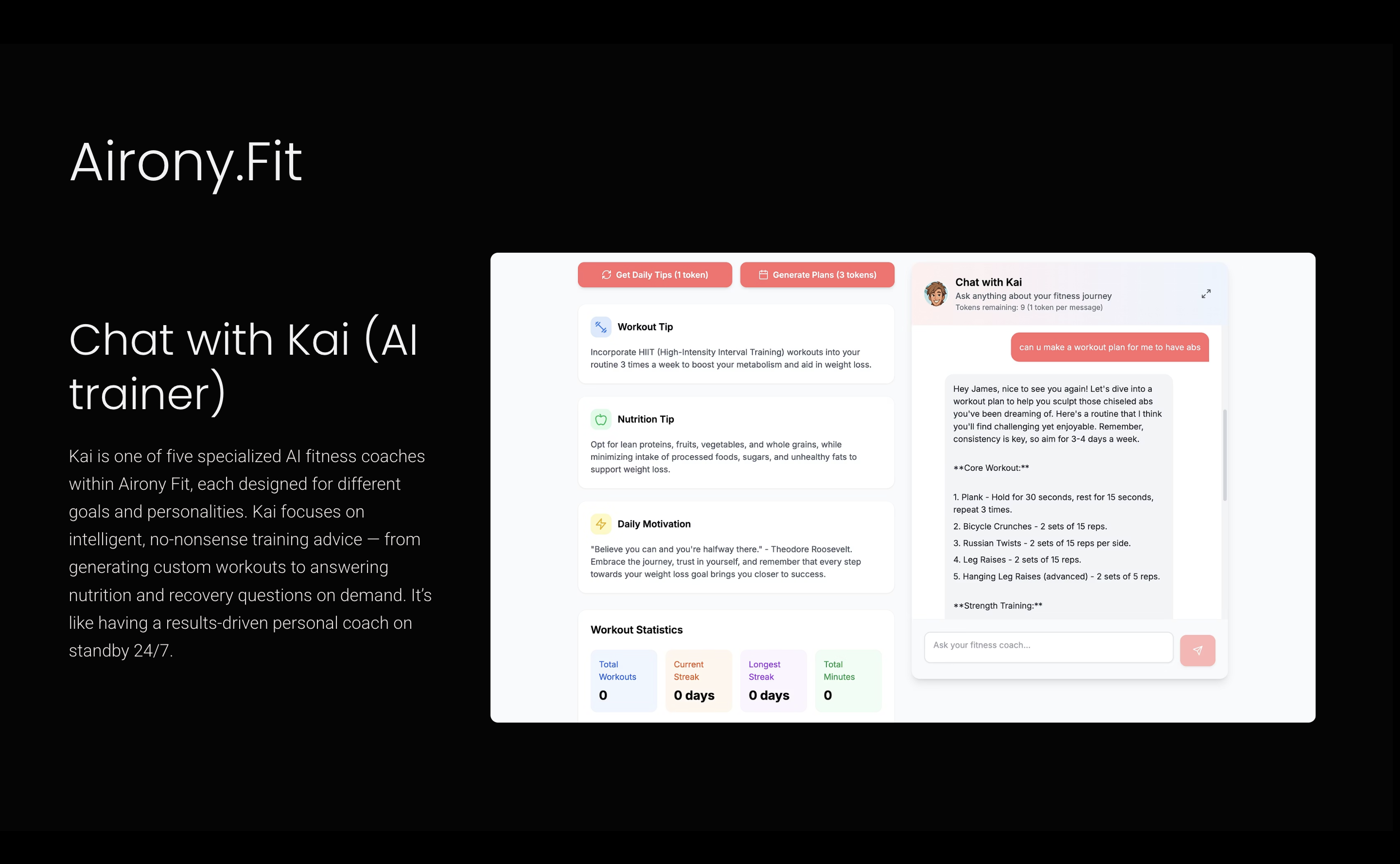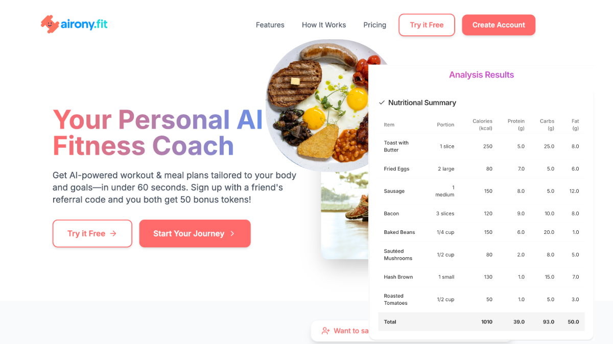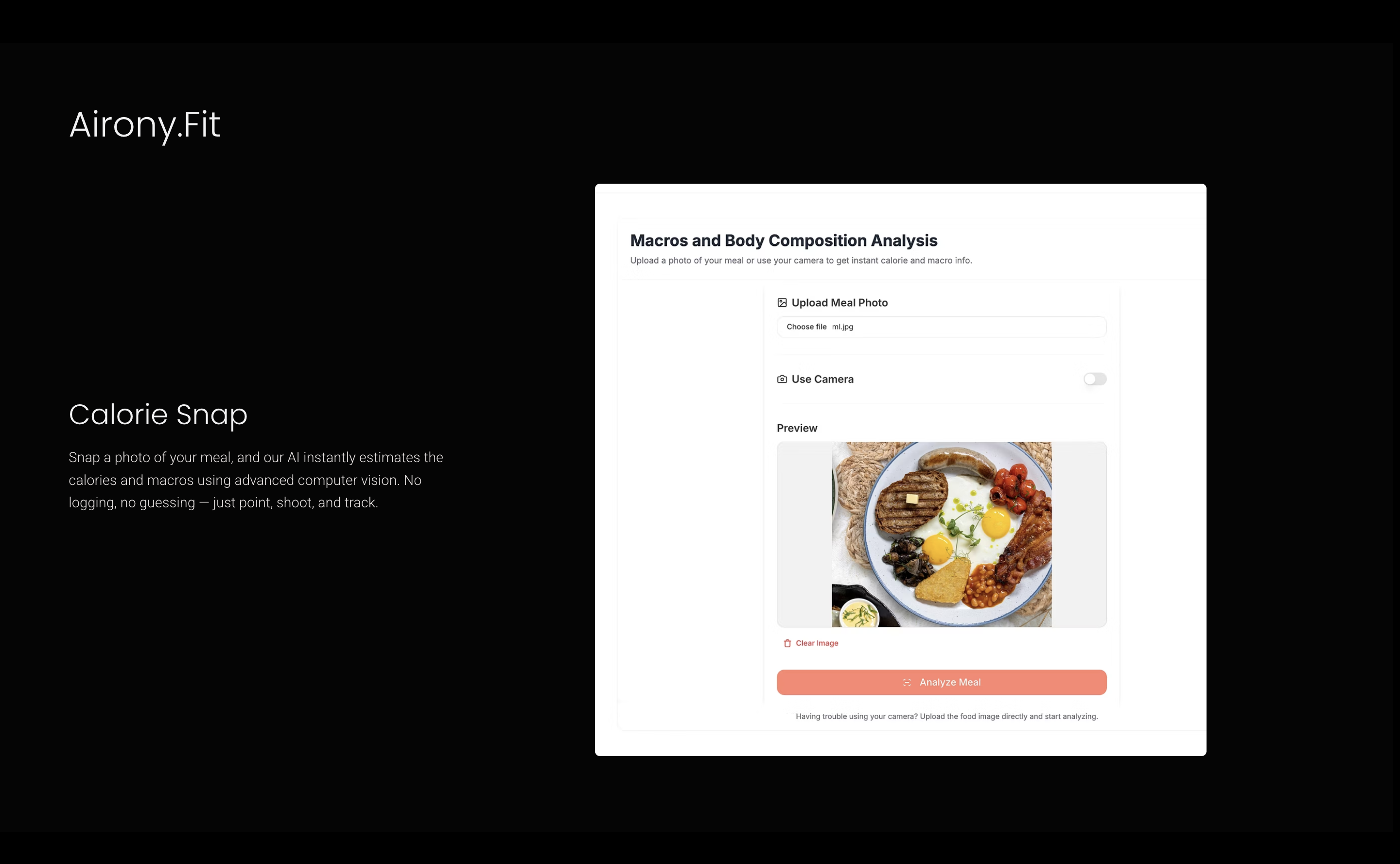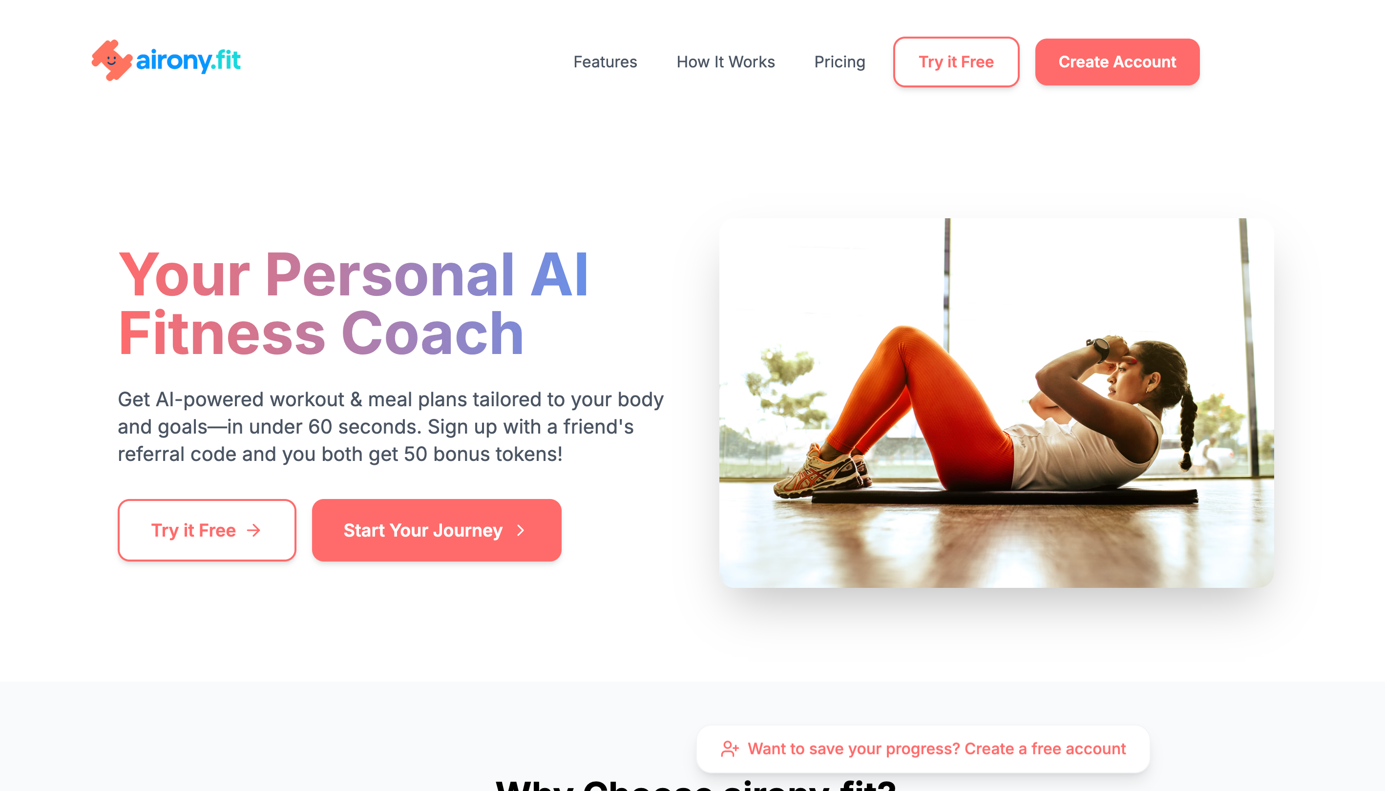 airony.fit is your free, personalised AI fitness coach. Build healthy habits with workouts, nutrition, and motivation that adapt to you. You can also scan your food images to count calories, and scan your body images to check your muscle and fat percentage.
