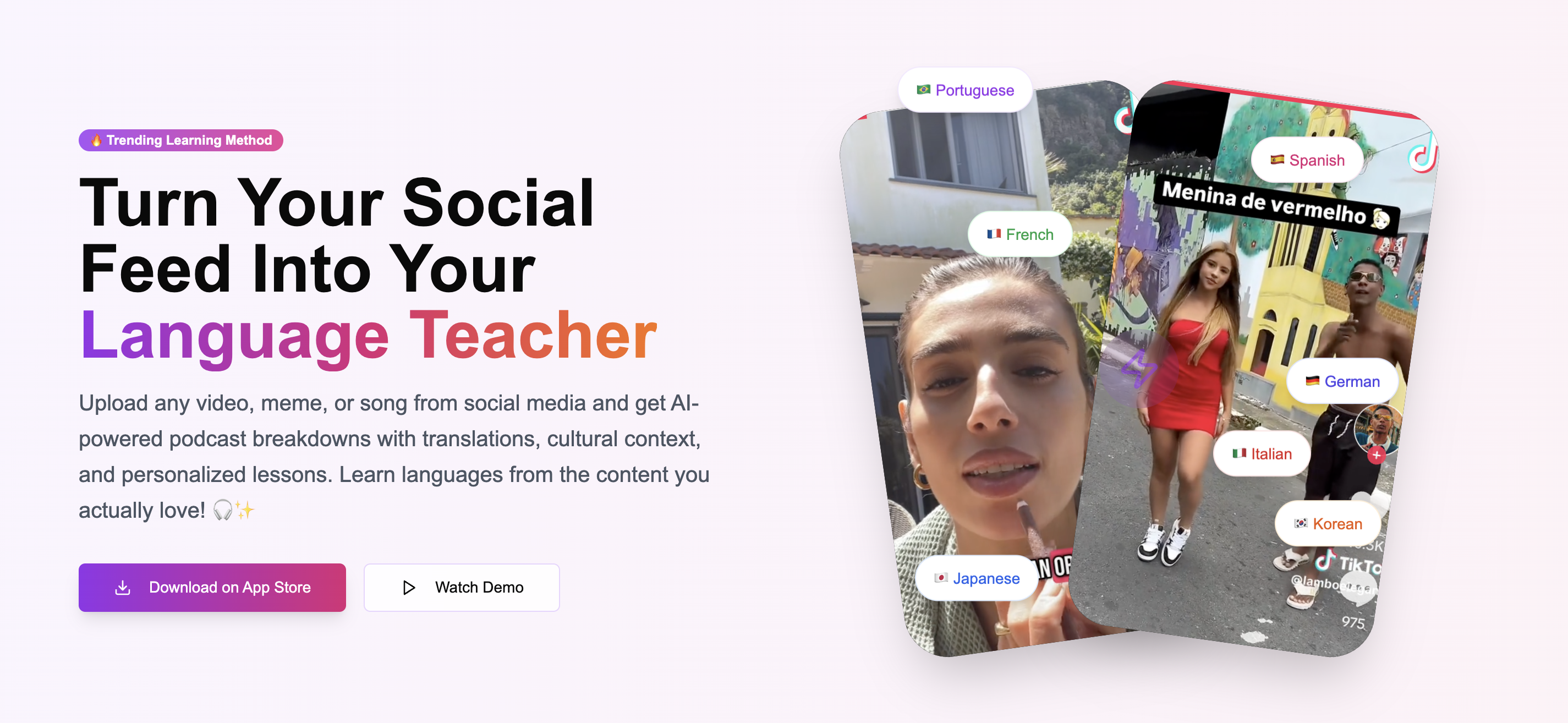 After becoming fluent in 3 languages, I learned what works: comprehensible input + spaced repetition. LangFeed combines both - upload TikToks, memes, or videos and get AI podcasts + smart flashcards. We're a small team in beta. DM @langfeed for premium!