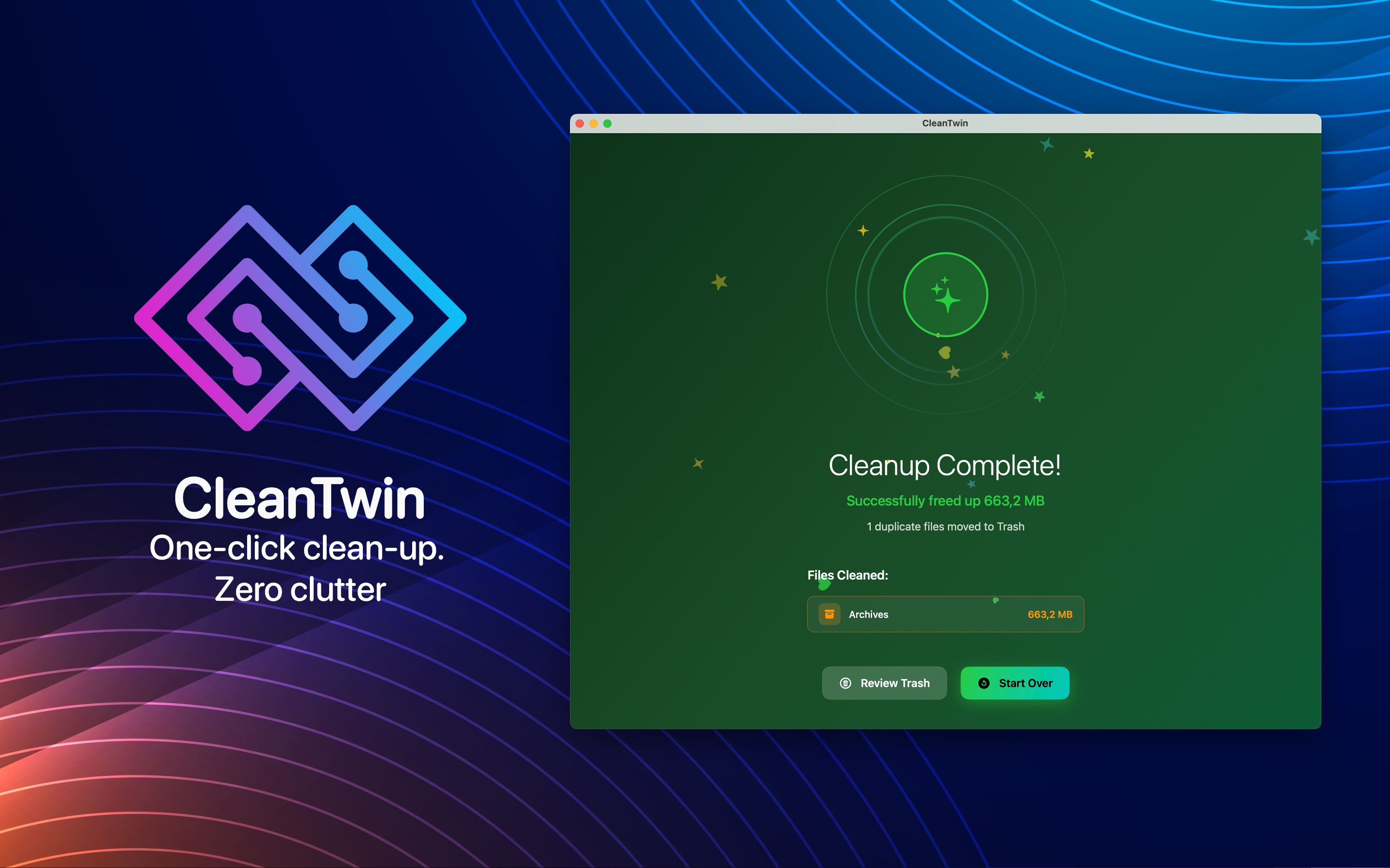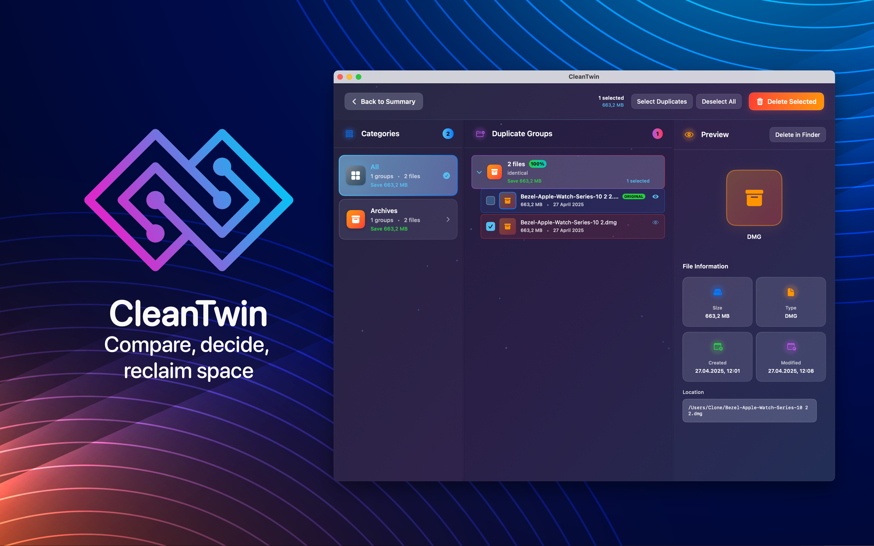 CleanTwin is a Mac app that finds both exact and visually similar duplicates using on-device AI. Clean up cluttered folders, external drives, and burst photos — all without uploading a single file. Fast, private, and fully offline.
