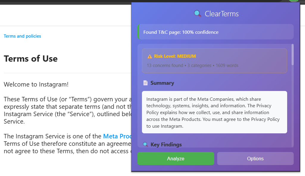 ClearTerms is a Chrome extension that reads and summarizes Terms & Conditions in plain English. It highlights privacy risks, flags shady clauses, auto-detects T&C pages, and saves past analyses — so you know what you’re agreeing to, instantly.