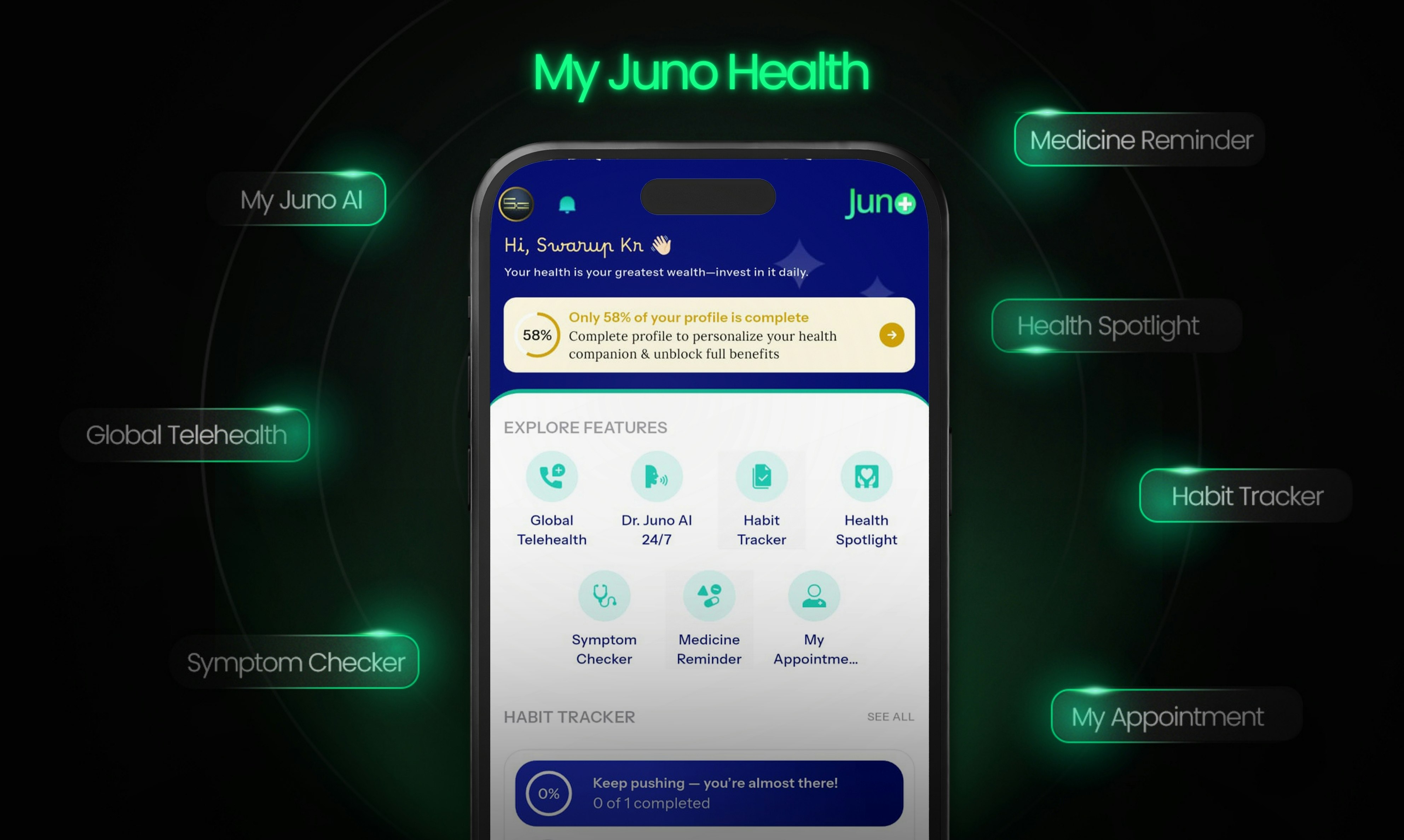 My Juno Health is an AI-powered, preventive-first health app that combines telehealth, medication tracking, symptom checking, mental wellness, and habit-building in one seamless experience. Whether you're managing your health or supporting a remote team,