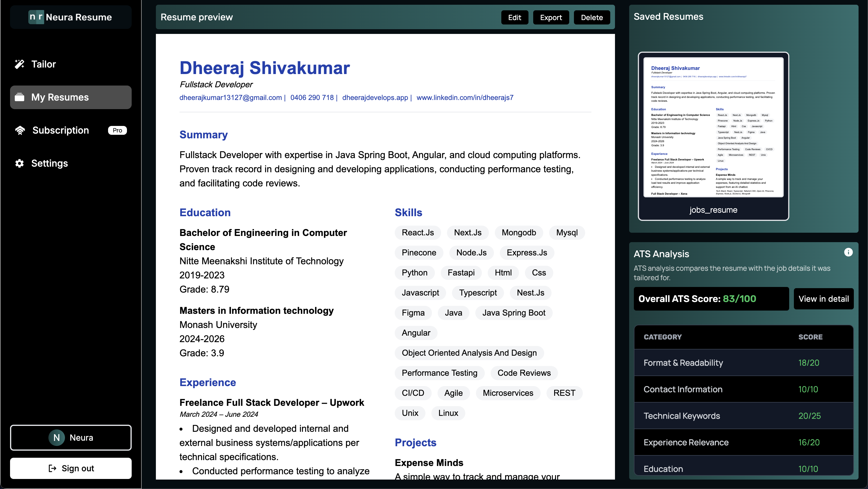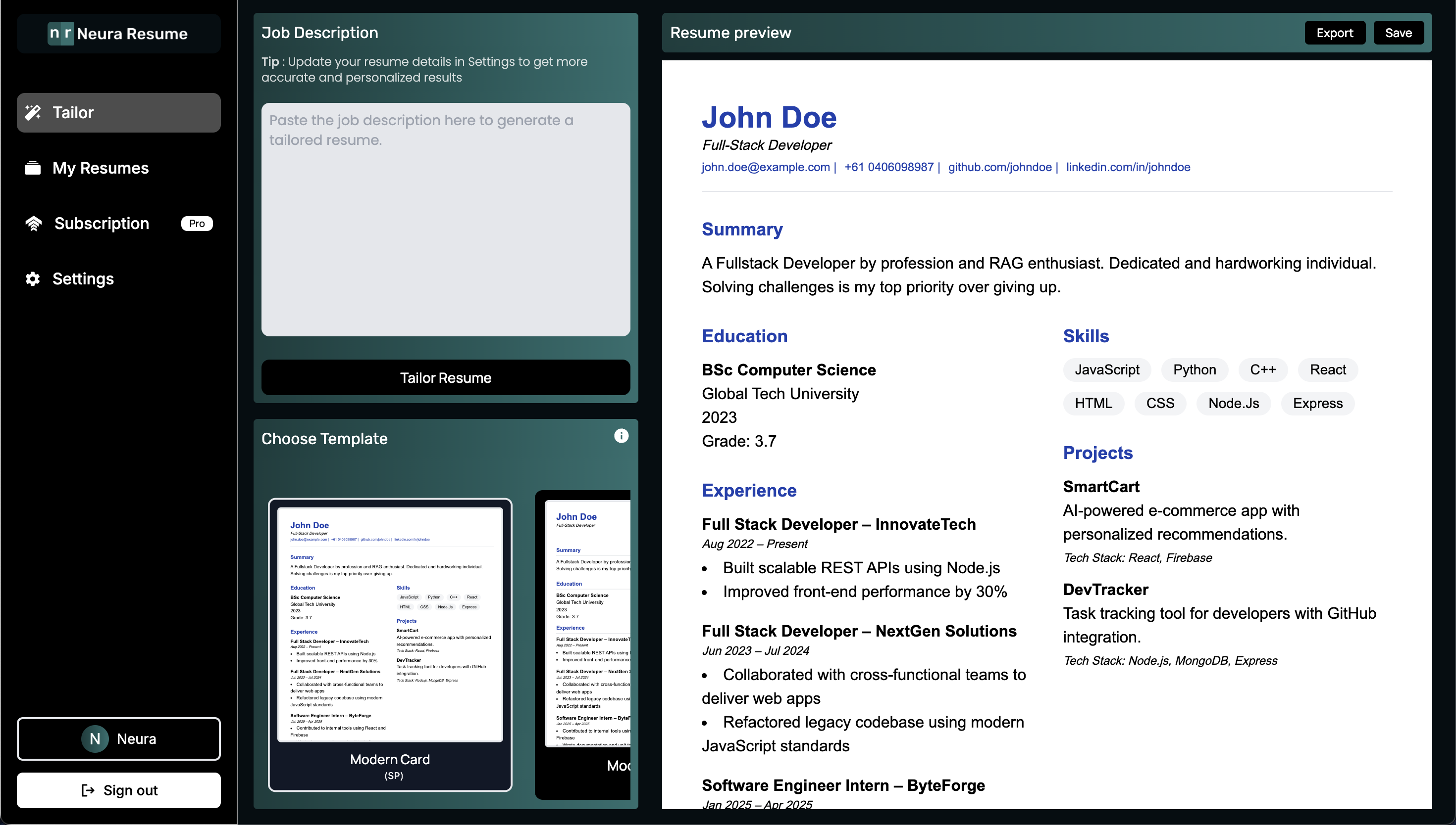 NeuraResume is an AI-powered platform that helps you create professional, ATS-friendly resumes in minutes. Get tailored content, modern templates, and real-time editing—no design or writing skills needed. Elevate your job search instantly!