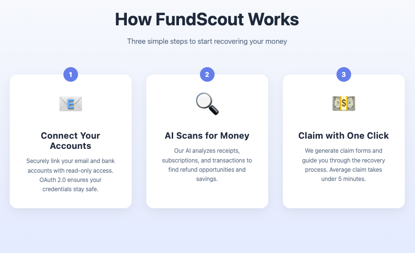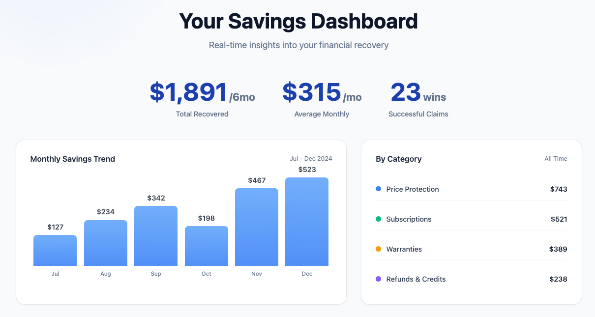 FundScout's AI monitors your email and bank accounts to find money you're missing. We detect price drops for refunds, track warranties, identify forgotten subscriptions, and alert you to unclaimed money. The average user recovers $347/month.