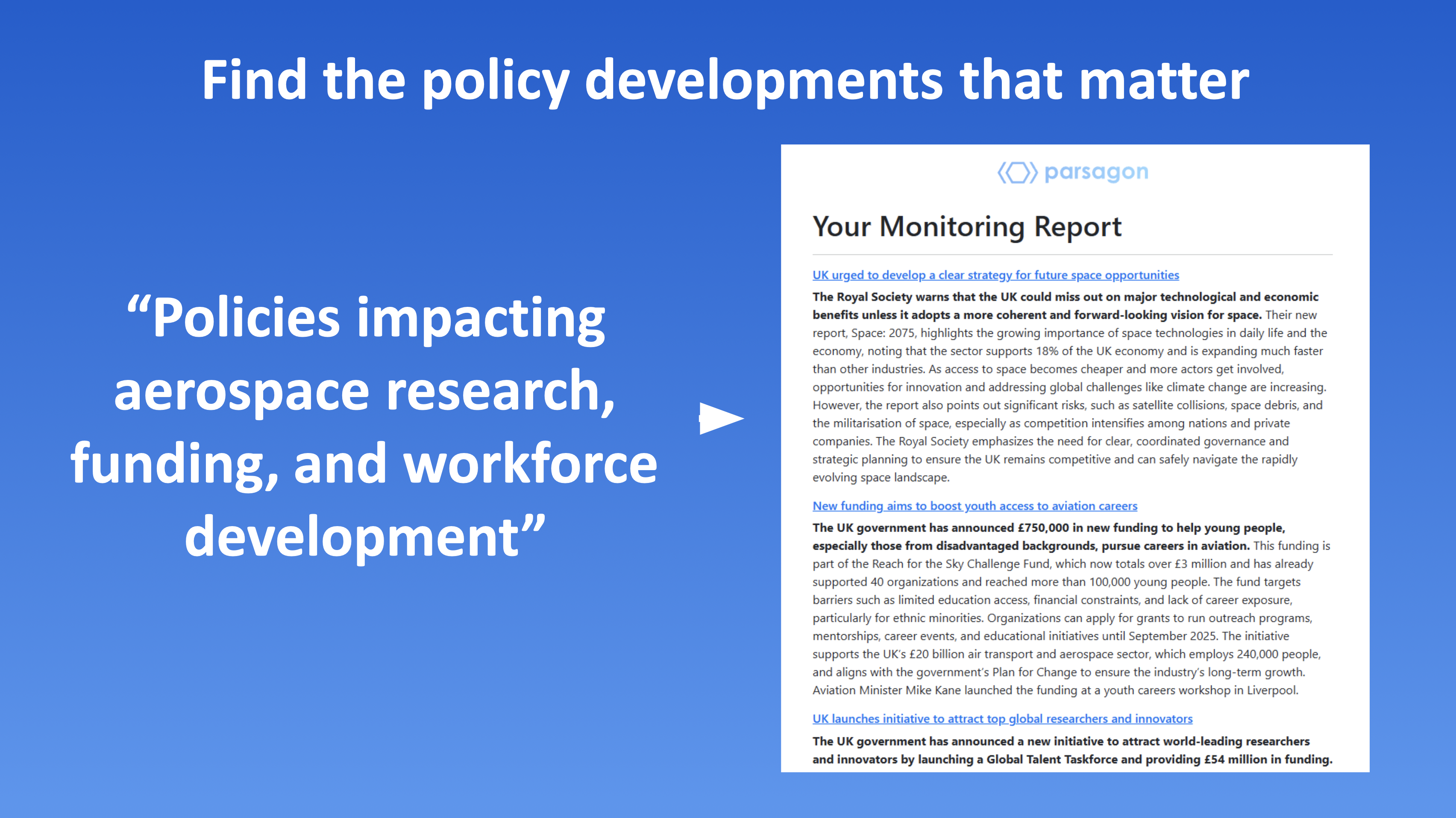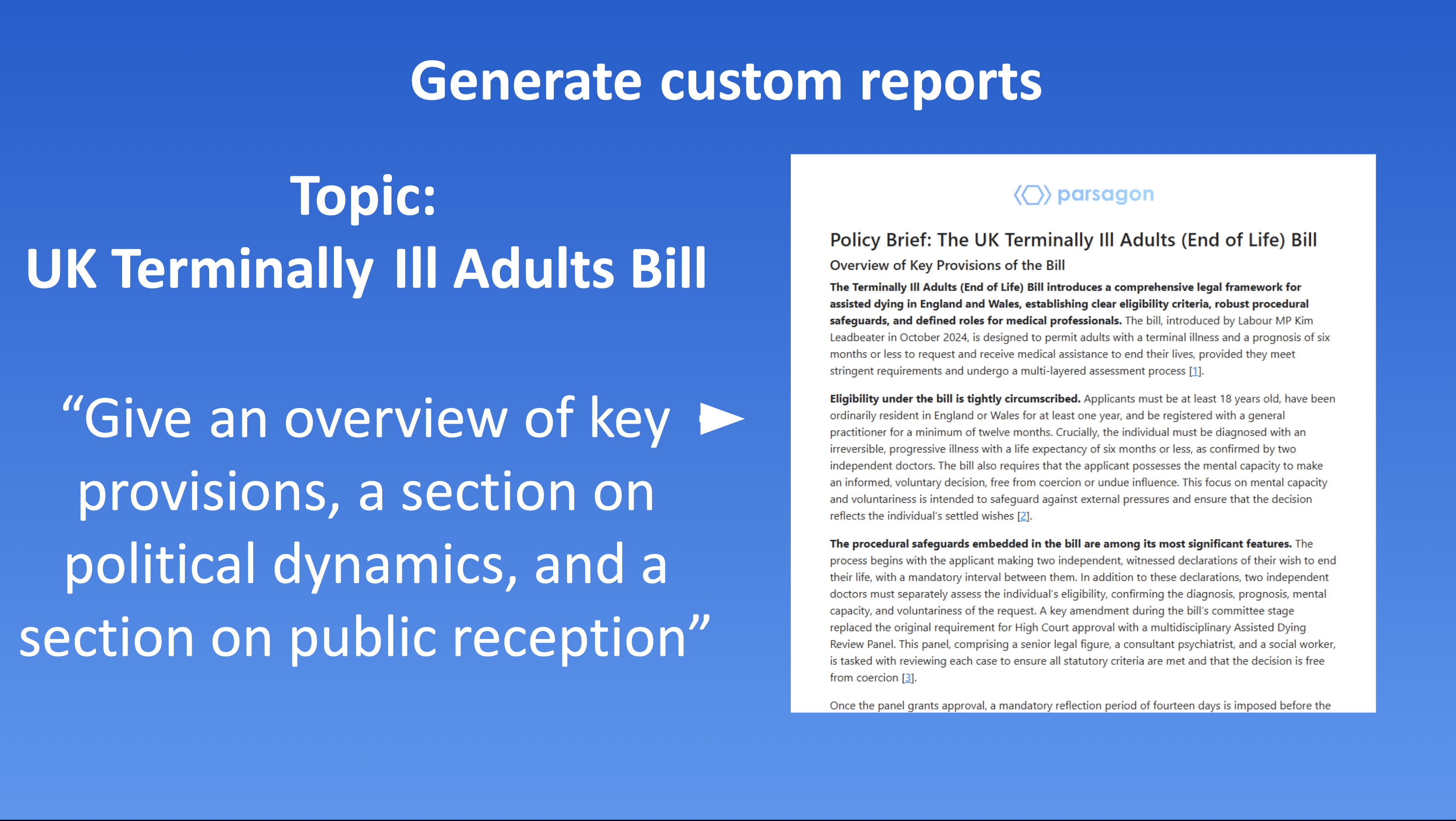 Discover unique insights and generate custom reports on public policy in any jurisdiction. Customers use us to analyze changes in US state education policy, generate reports on UK financial regulations, monitor vaccine policies across the EU, and much more!