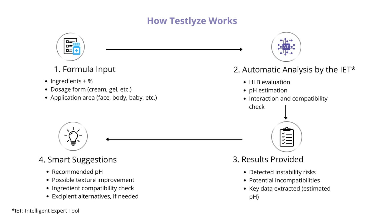 Testlyze is an intelligent platform that helps cosmetic and pharmaceutical formulators analyze, optimize, and secure their formulas. It uses AI to detect errors, predict stability, and improve formulation outcomes — before lab testing even starts.
