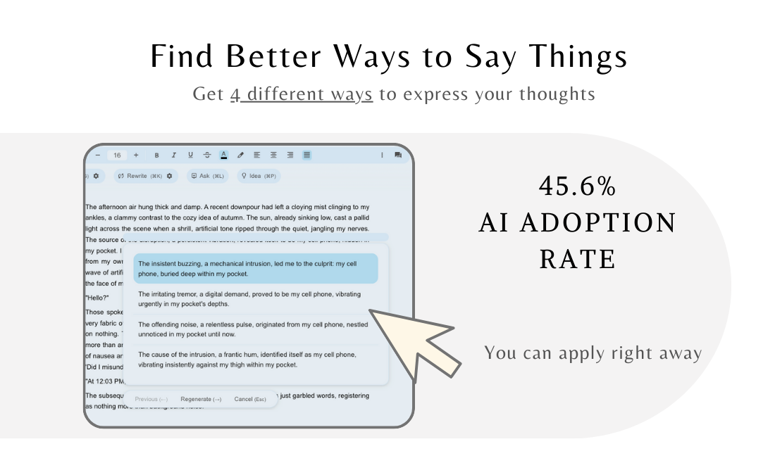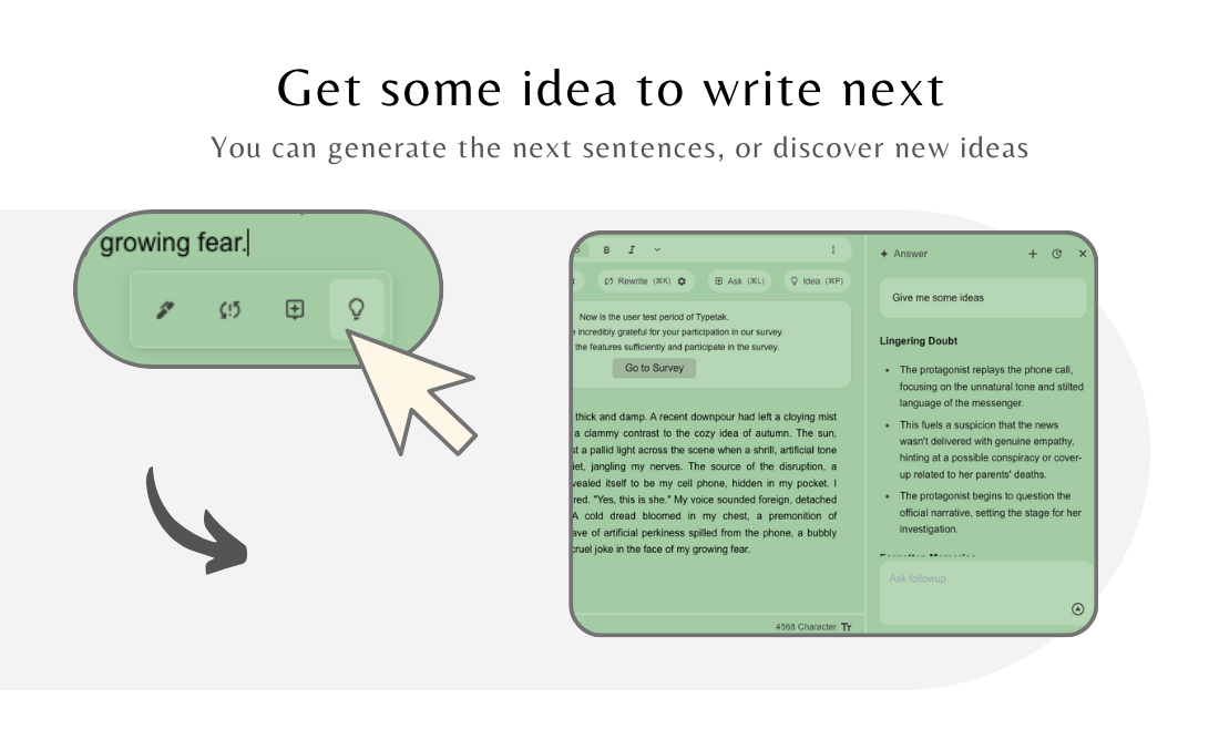 Typetak is an AI-powered text editor offering 4 alternative expressions, seamless writing assistance, and a context-aware chatbot. It provides a seamless one-screen UX for an effective writing experience. You can set reference data for personalized AI help.