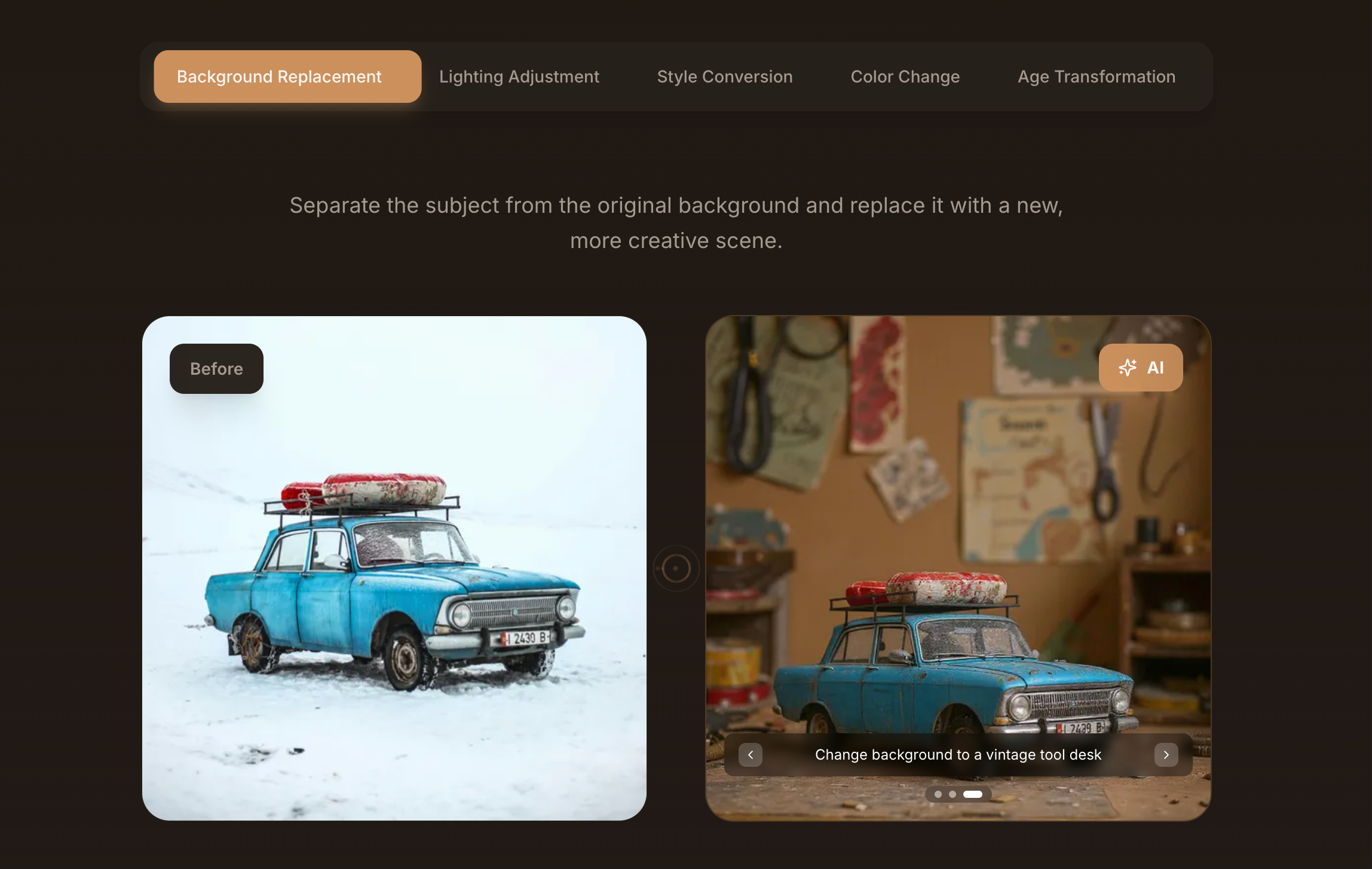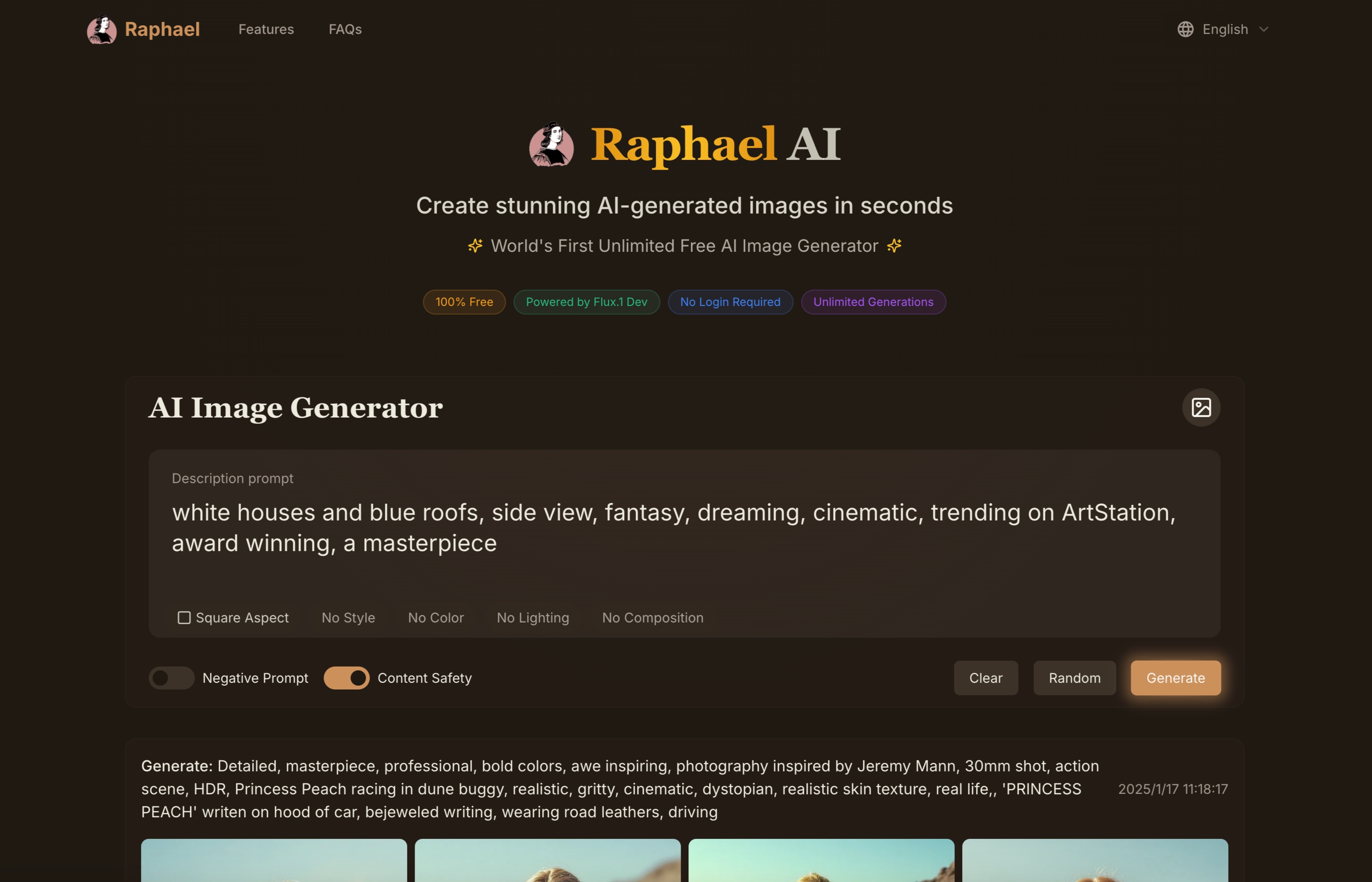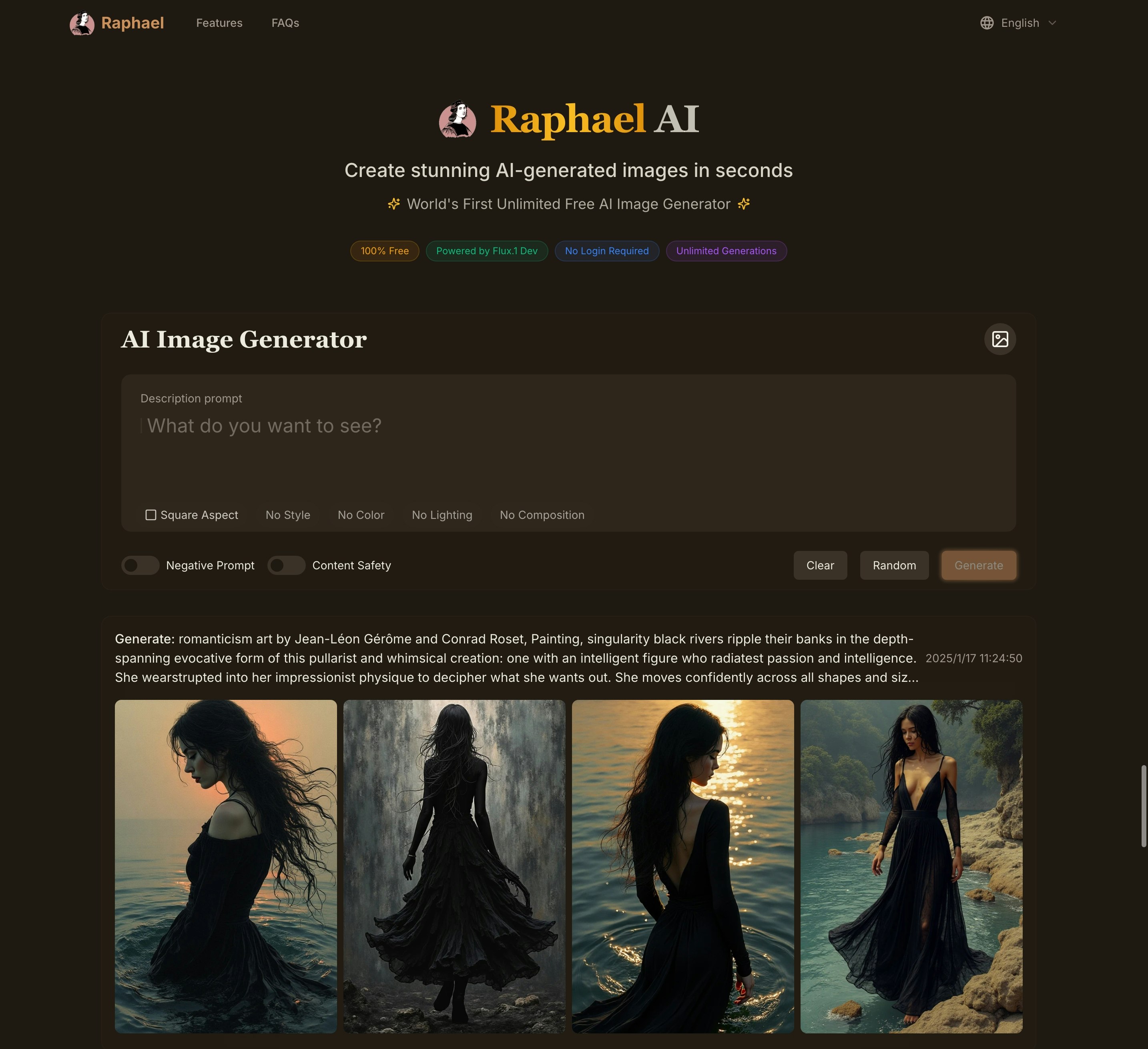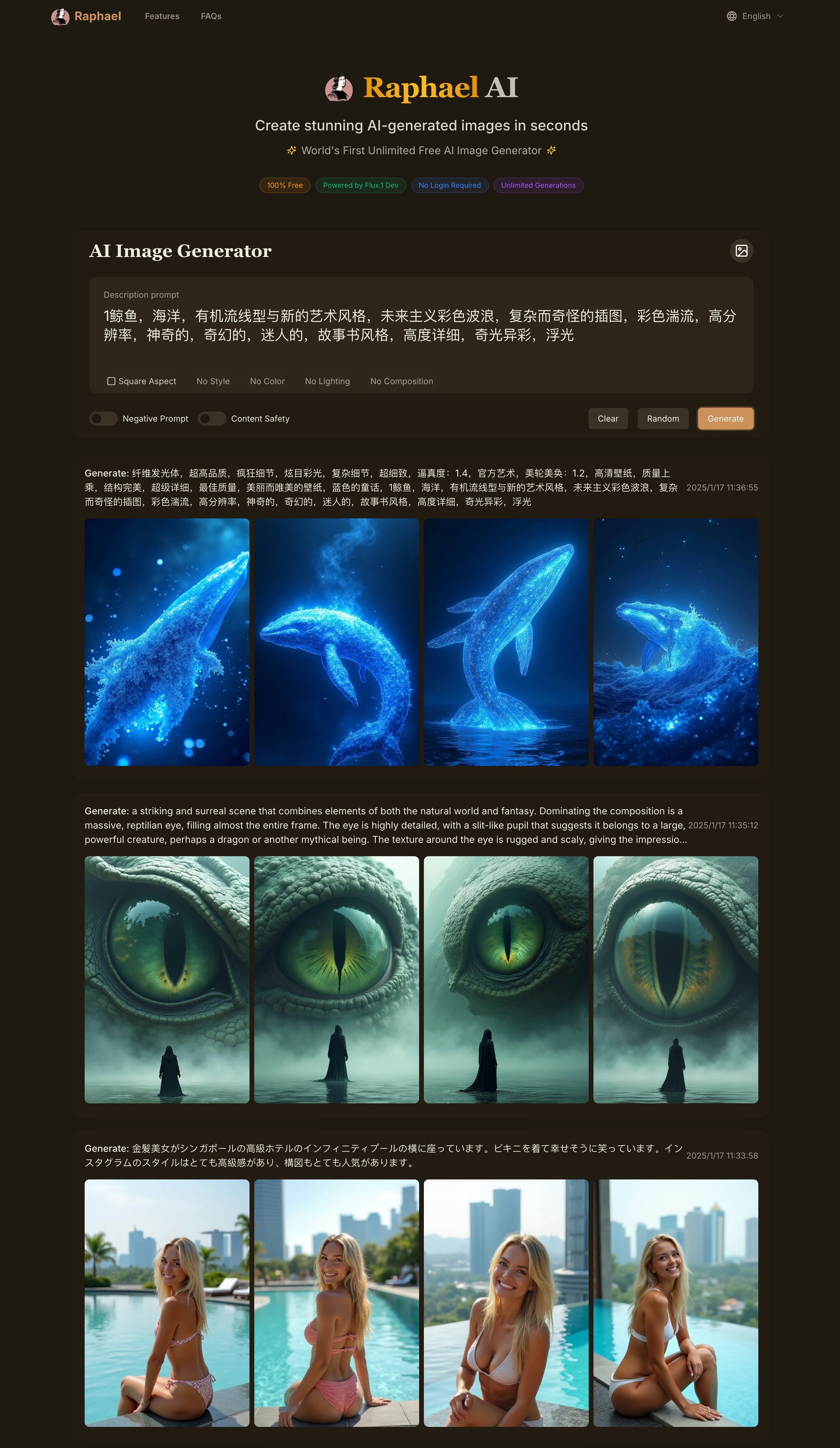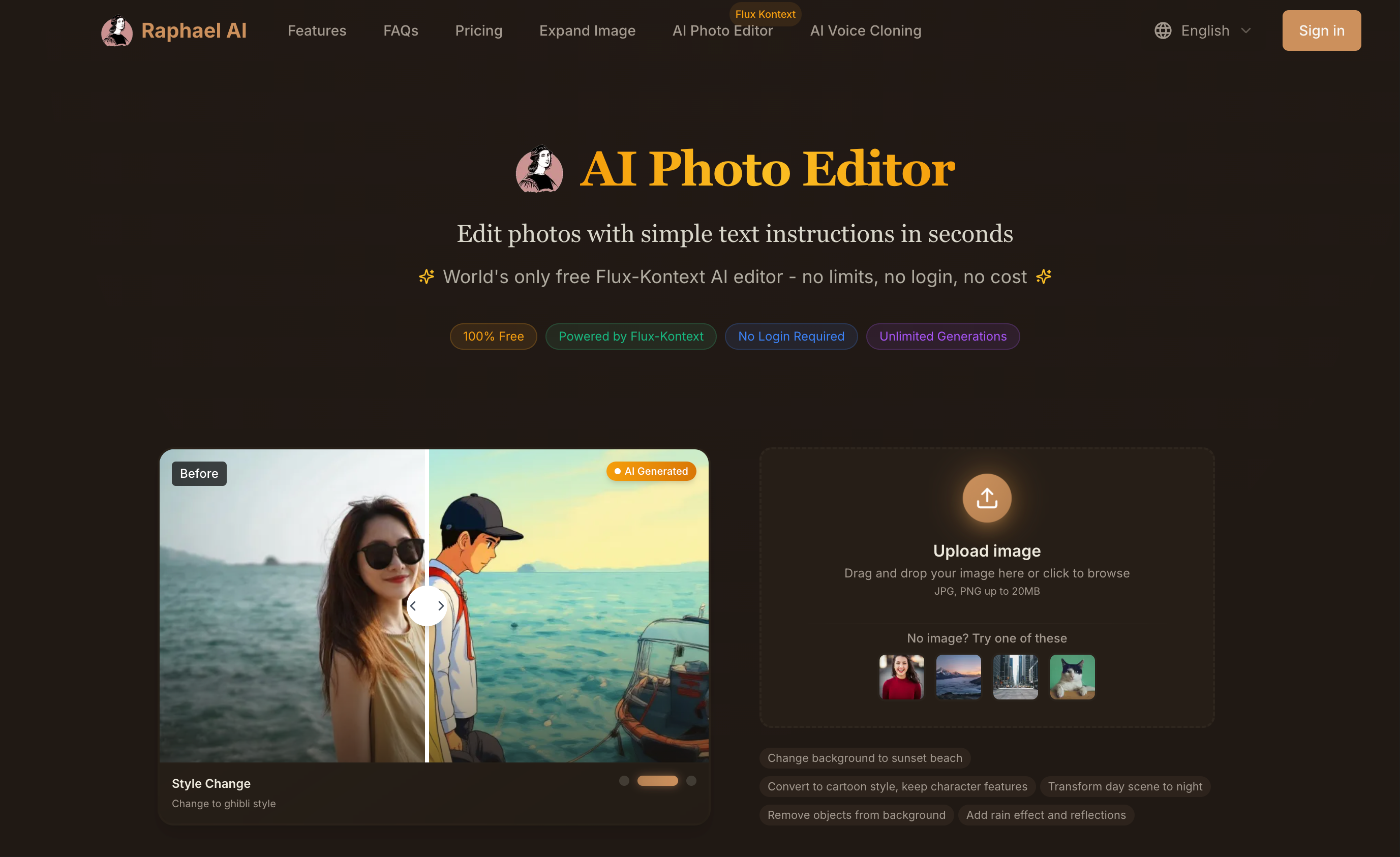 我们荣幸地宣布推出Raphael AI 2.0——这是一款专为创作者打造的强大照片编辑器,基于Flux-Kontext模型的尖端AI技术,助您轻松提升图像品质。无需注册,完全免费。