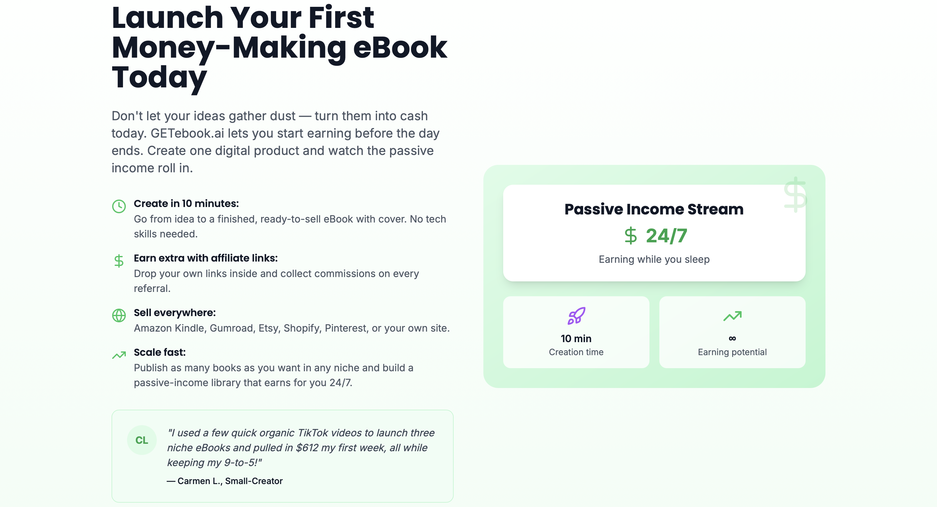 Create and sell eBooks in 10 minutes with GETebook.ai. No writing, design, or tech skills needed. Generate titles, chapters, and covers automatically. Download a ready-to-sell PDF and start earning passive income today. Try it free—no card required.