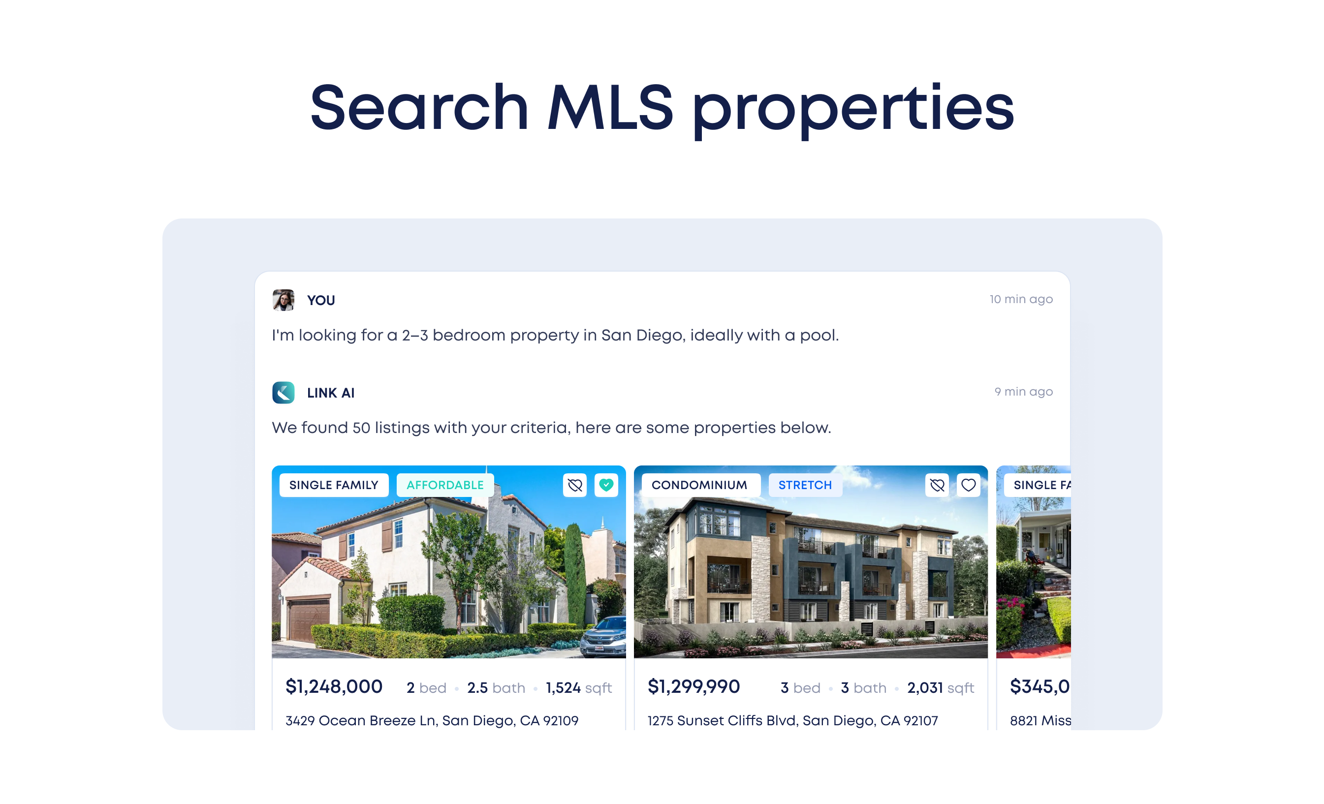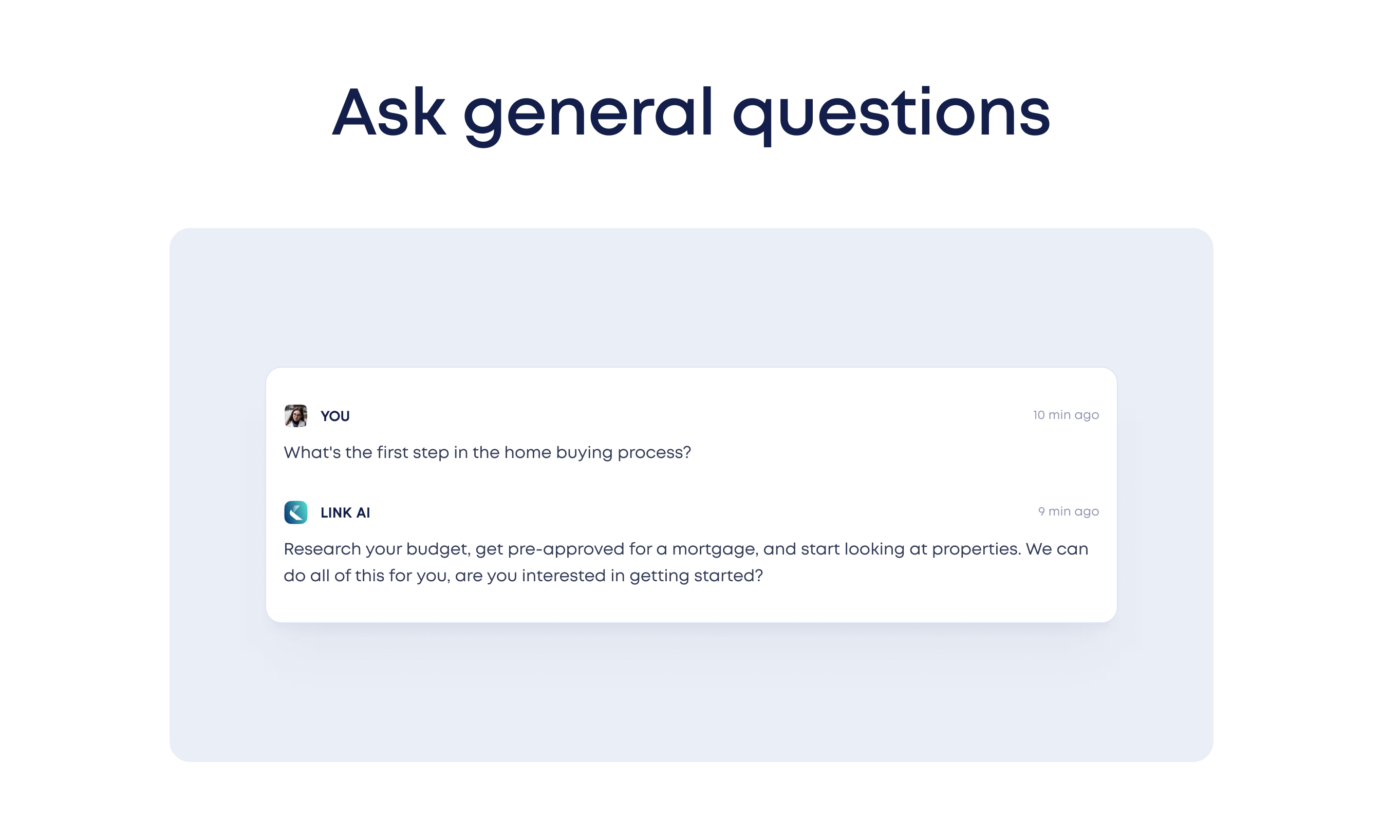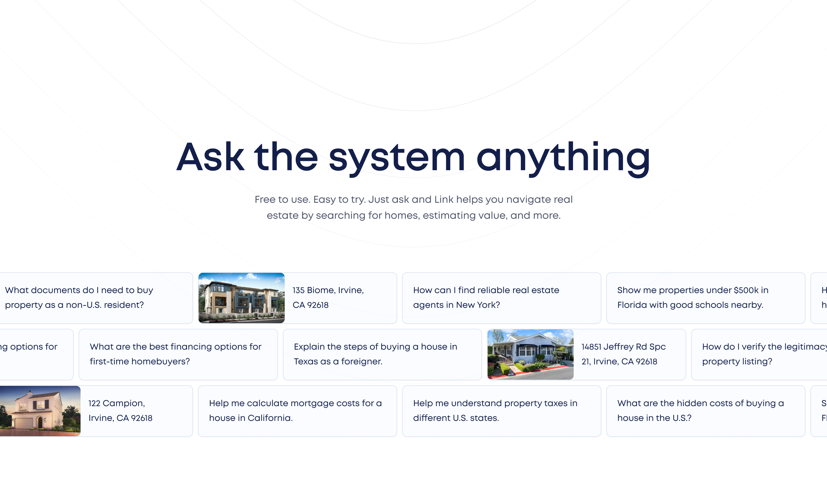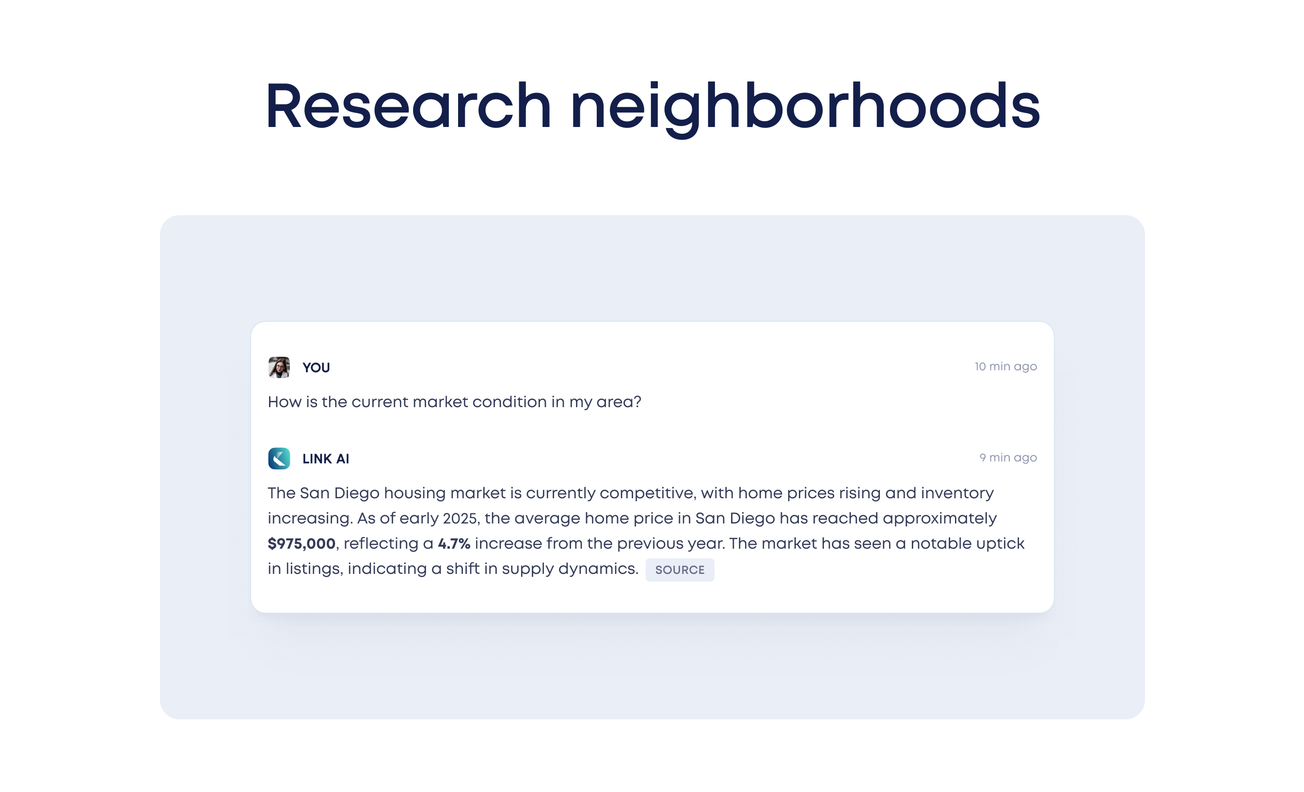 Link is a conversational AI that lets you search properties, compare neighborhoods, and calculate market value — all in real time, for free. [Create your account by August 8 to unlock up to $20K in buyers credits] - Terms on our website