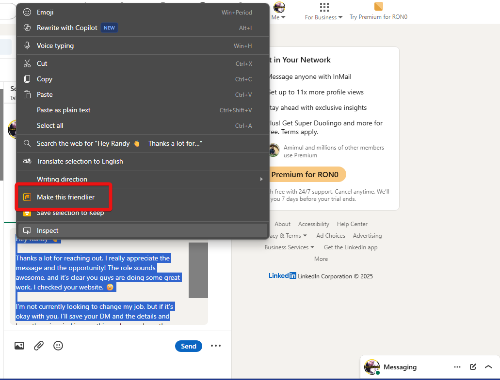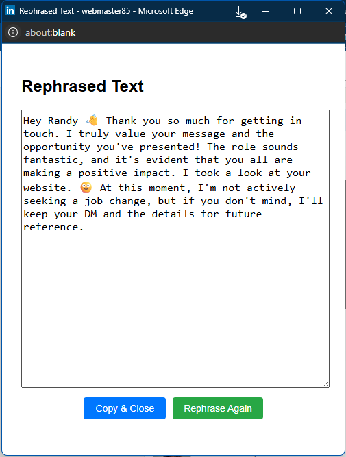 Friendlify is a Chromium extension and Windows App that rewrites your messages to sound warmer, more polite, or more human, without changing your meaning. Highlight the text, click the icon, and rephrase your idea. Your message, reworded, but still you.