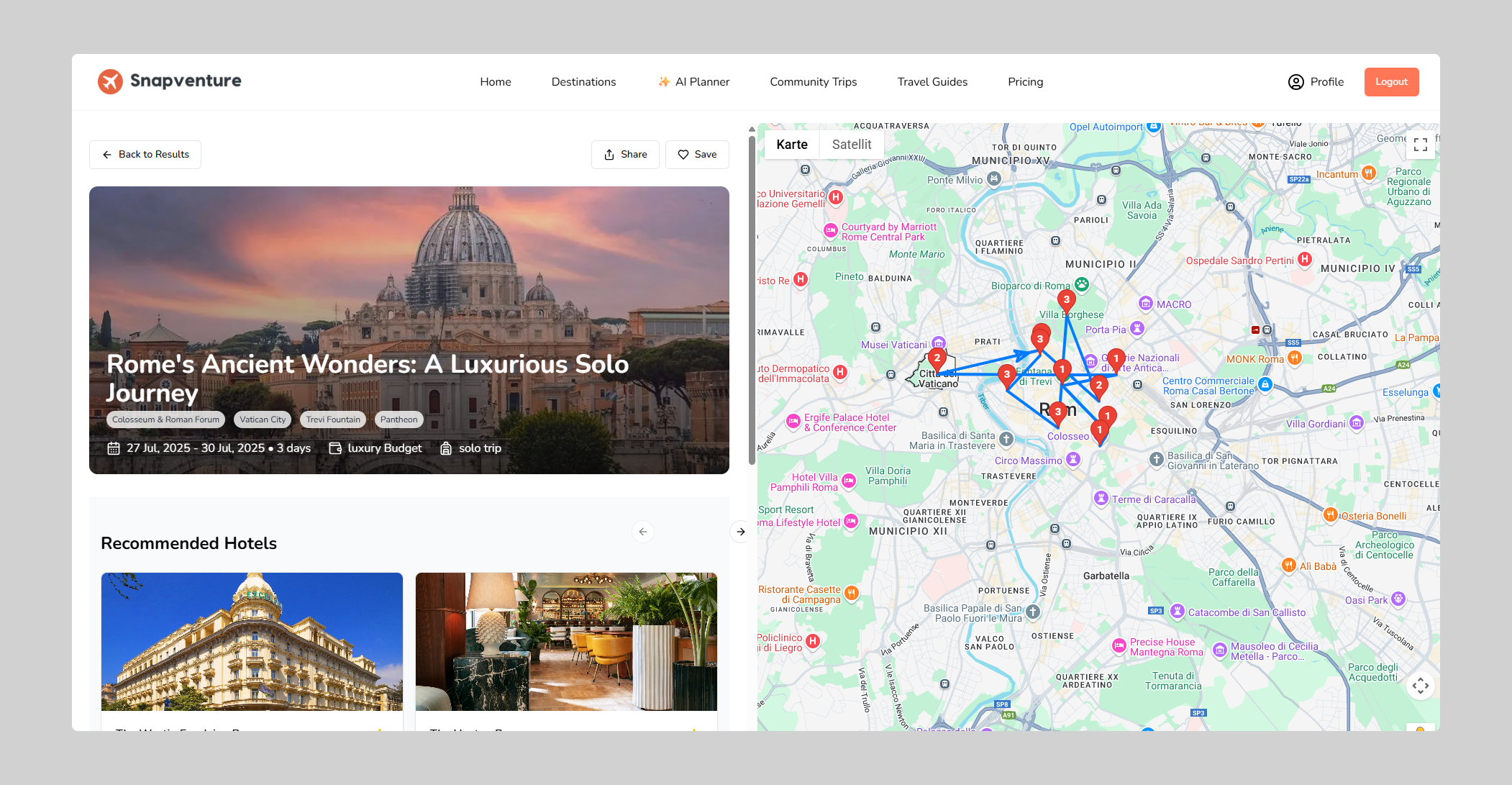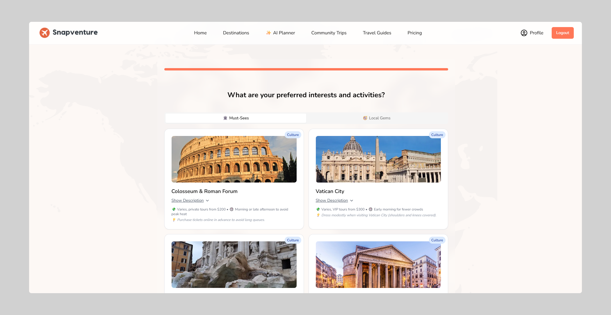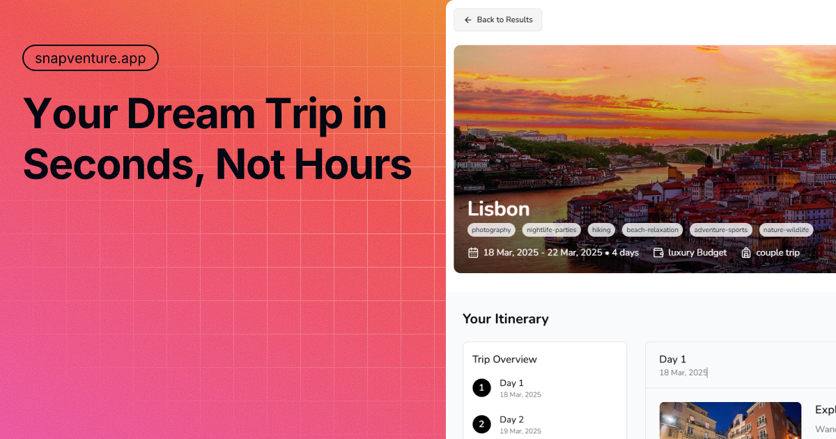 Plan your perfect trip in seconds with Snapventure. Our AI builds personalized itineraries based on your interests, budget, and travel style. Say goodbye to hours of planning and hello to spontaneous, dream vacations. It's time to explore the world your way.