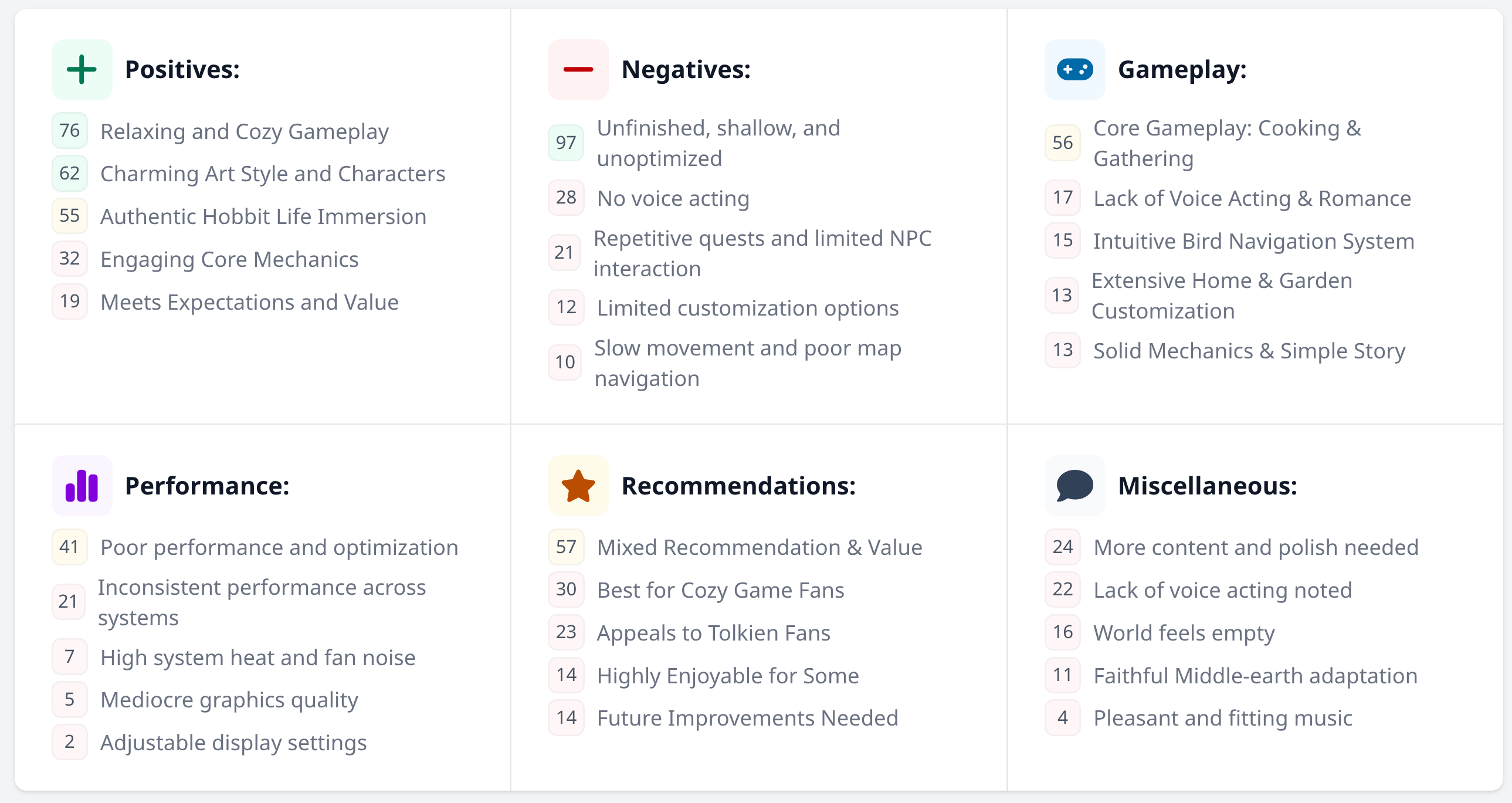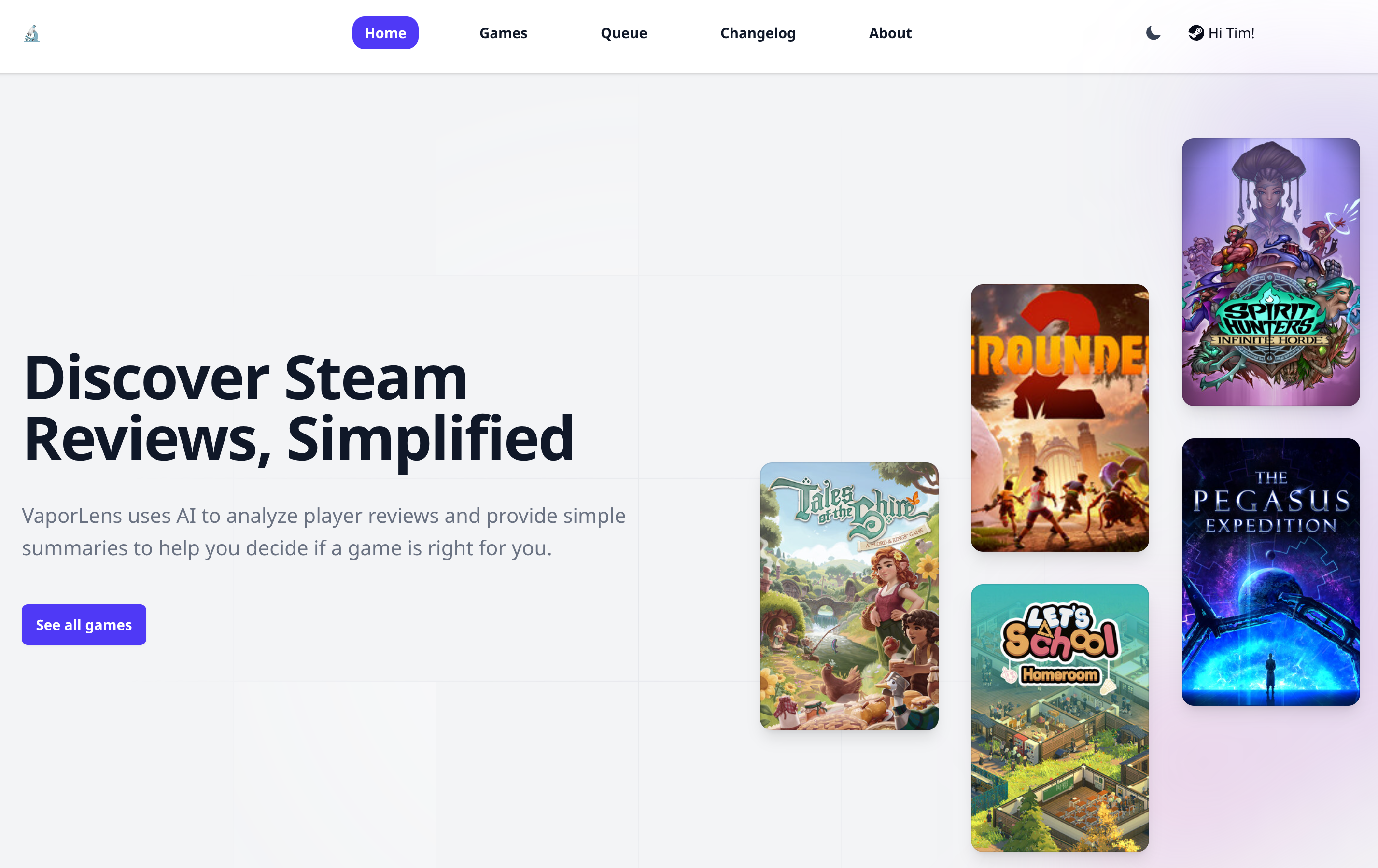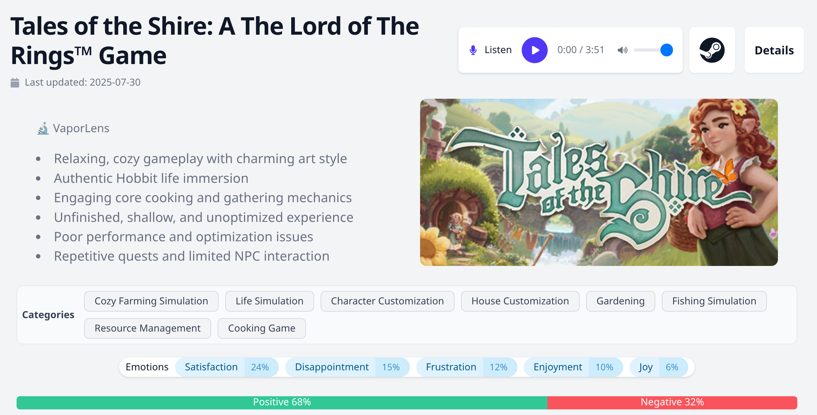 VaporLens processes thousands of Steam reviews with AI, surfacing pros, cons and emotions. One screen gives you an at‑a‑glance summary, similar‑game picks, DLC insights and even a short podcast - everything you need before you hit Buy.
