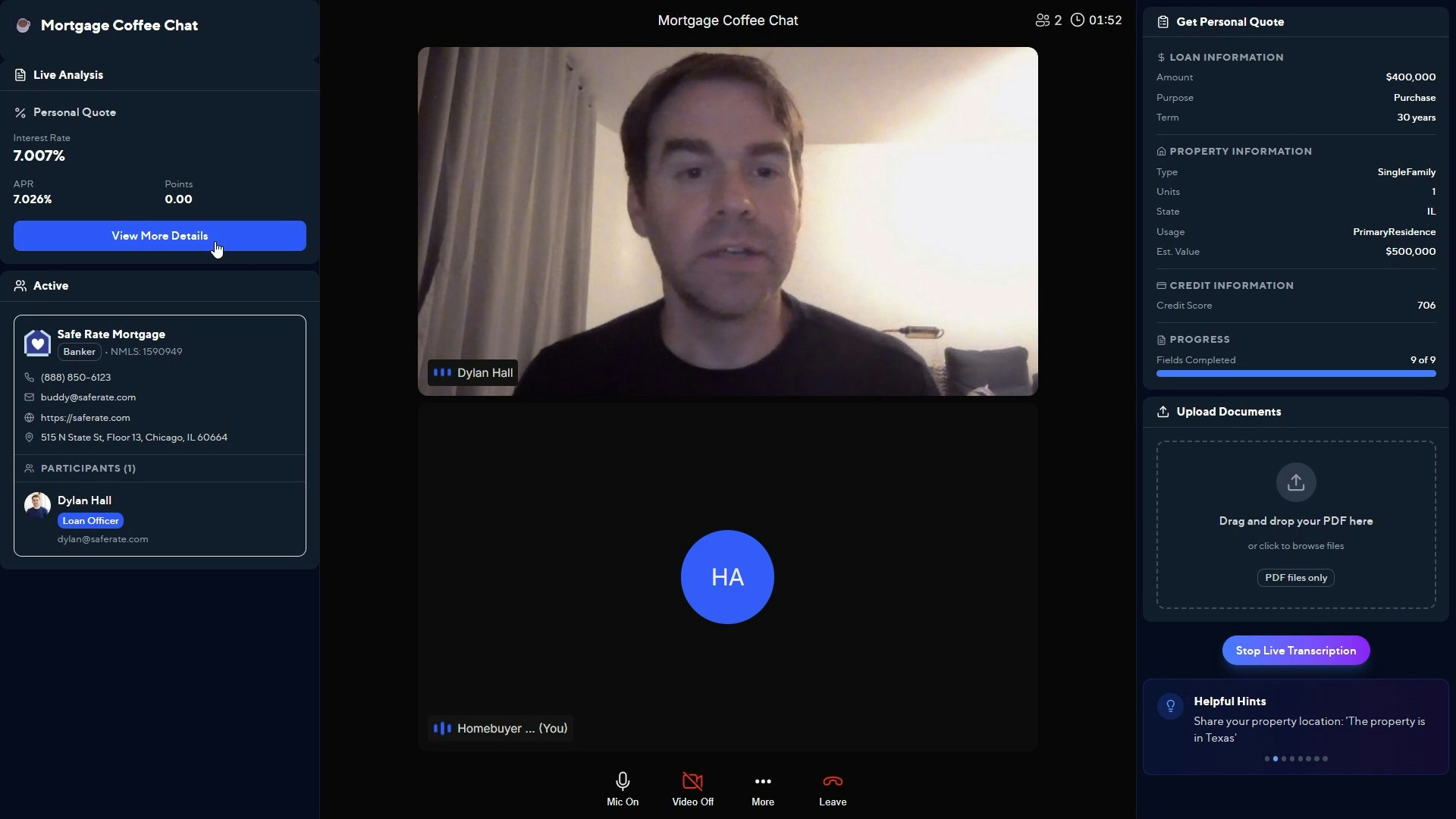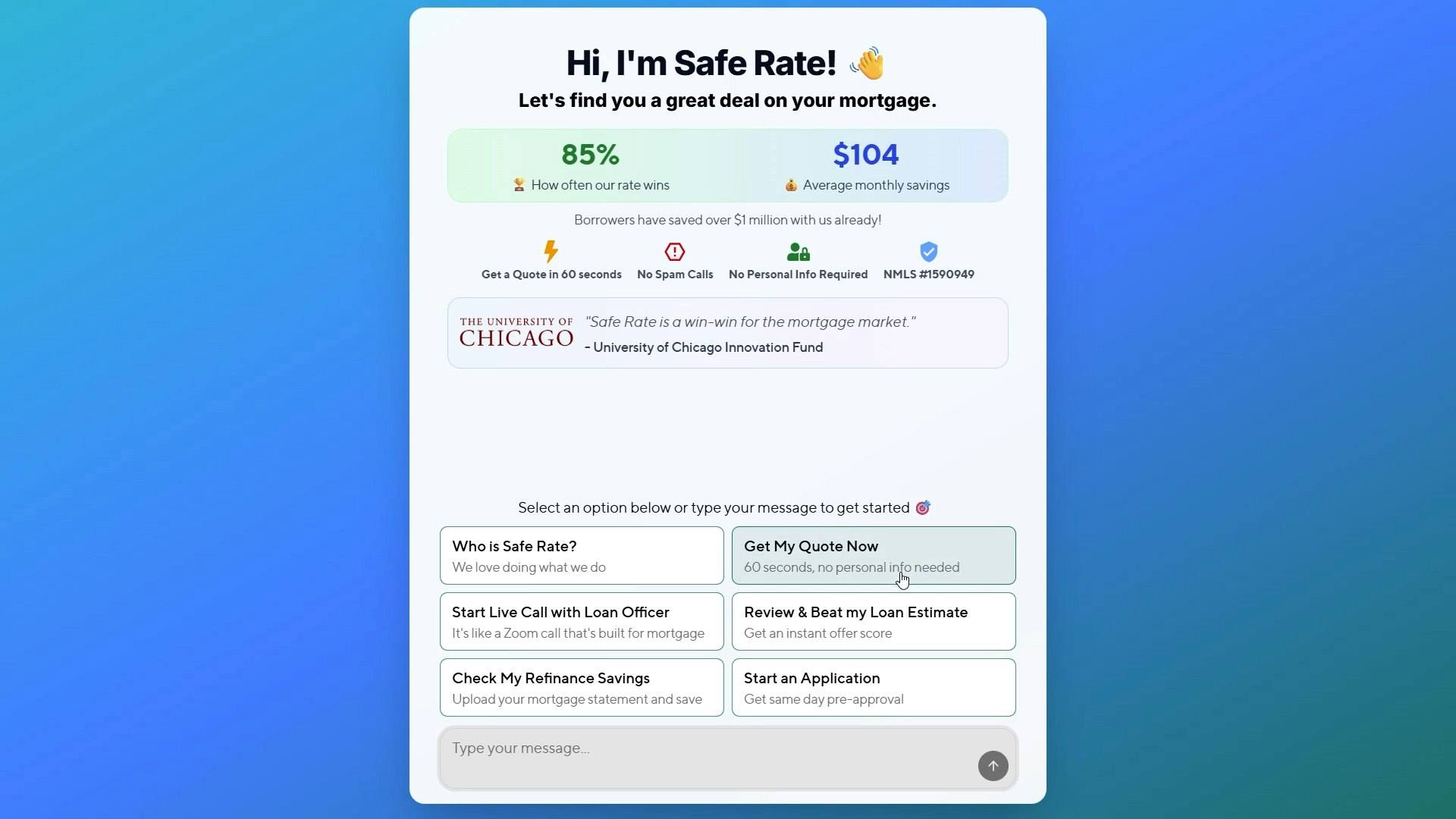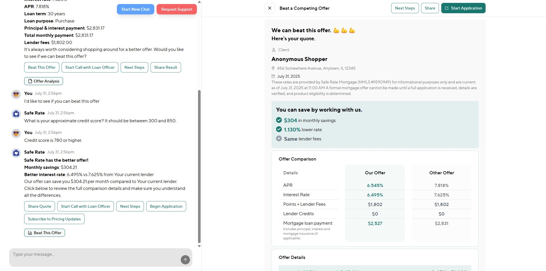 Our AI chat puts mortgage shoppers in control. They can get personalized quotes, easily comparison shop, score any lender's offer, see whether it makes sense to refinance, setup a tracker to follow interest rates, and instantly connect to a loan officer.