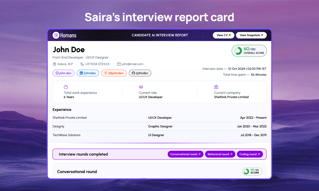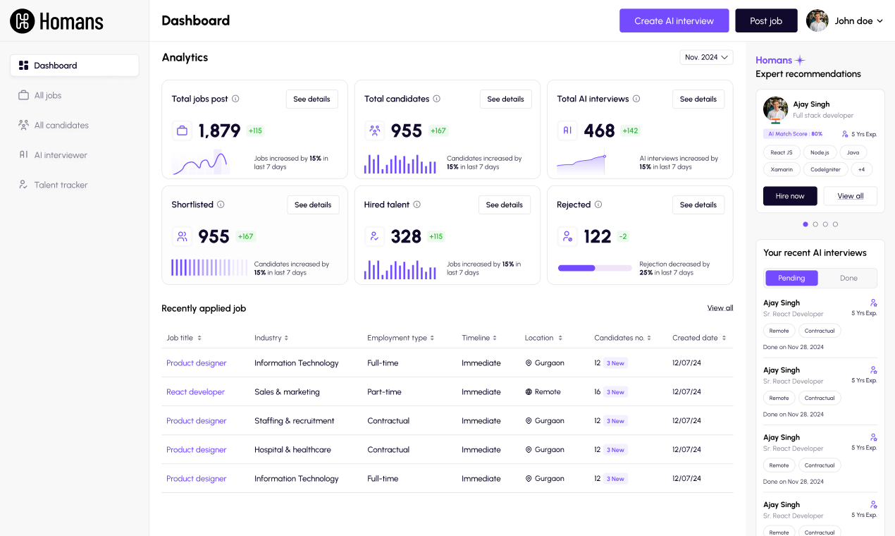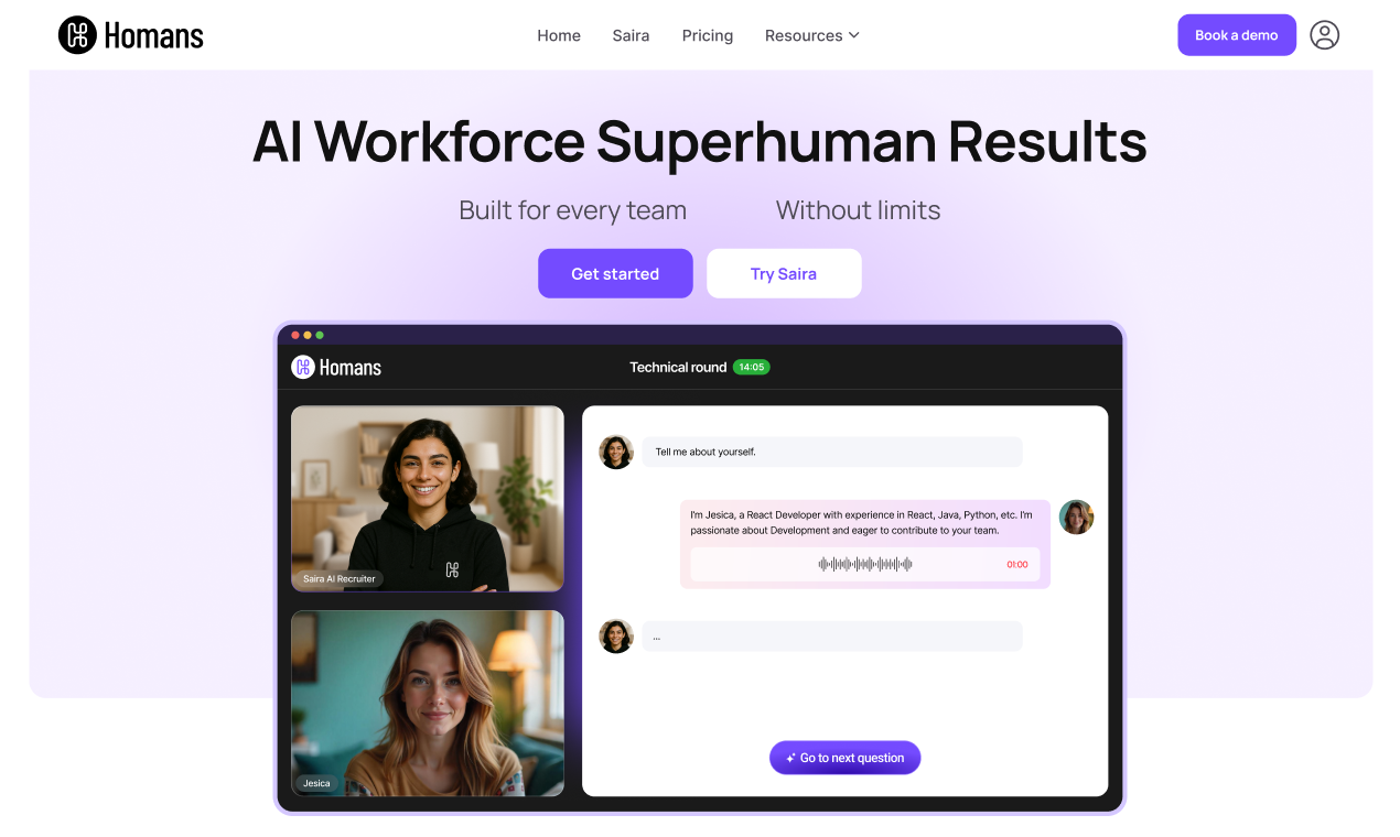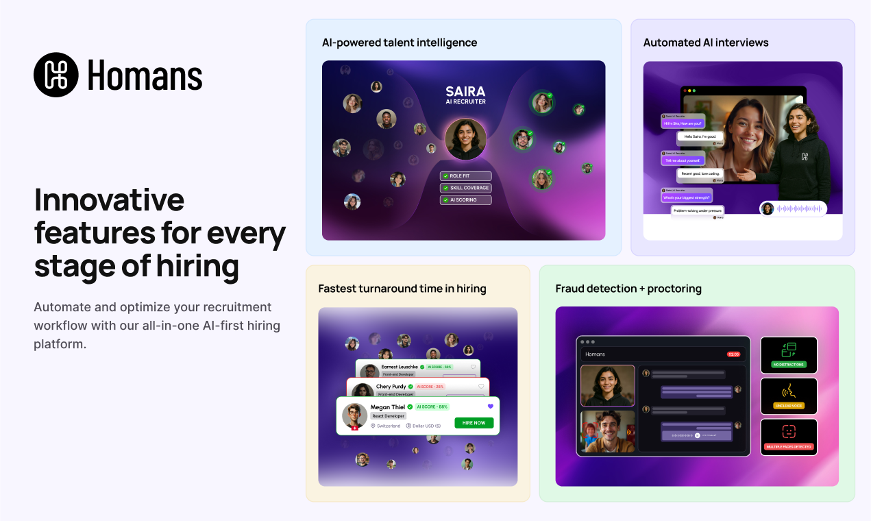 Homans.ai builds and delivers AI-powered agents that automate key business workflows. Our AI recruiter is already helping companies source, screen, and engage candidates. Coming soon: AI SDR and AI voice agent for sales and conversations.