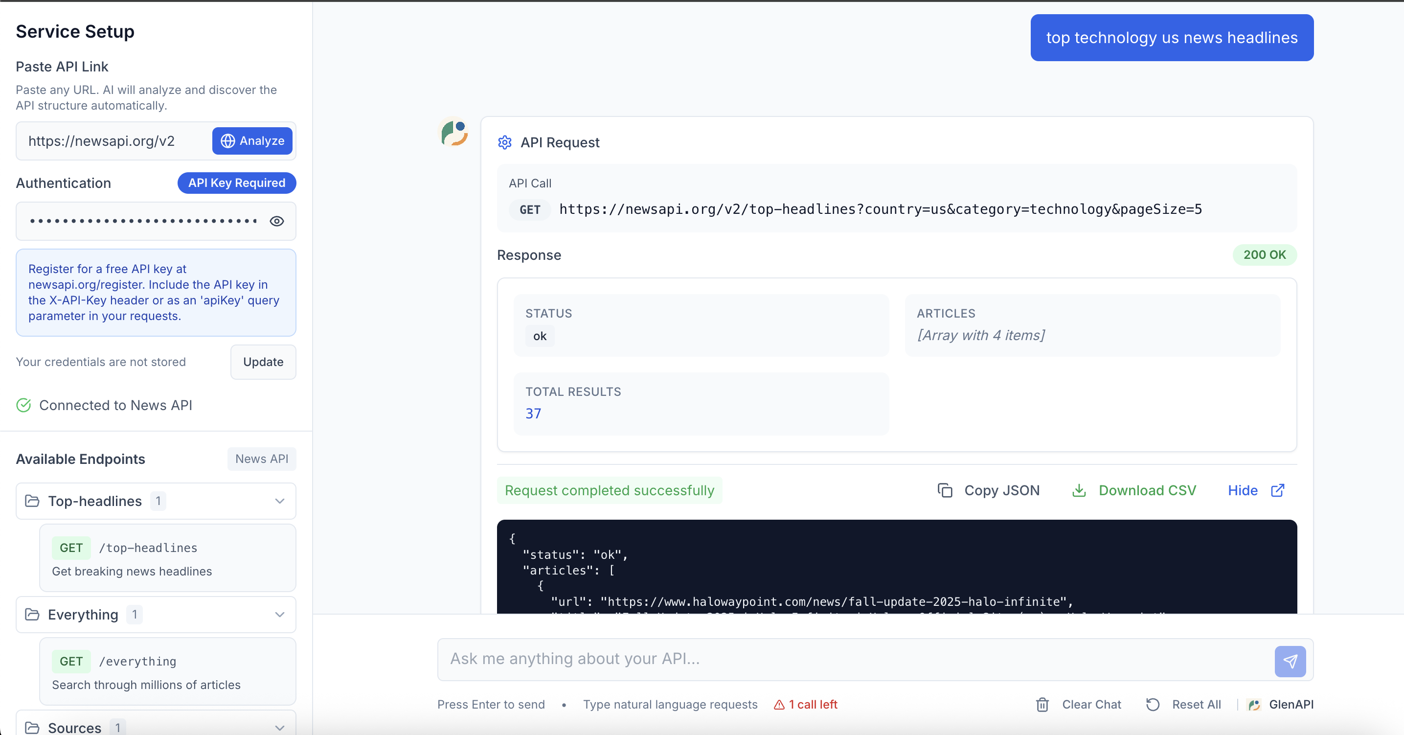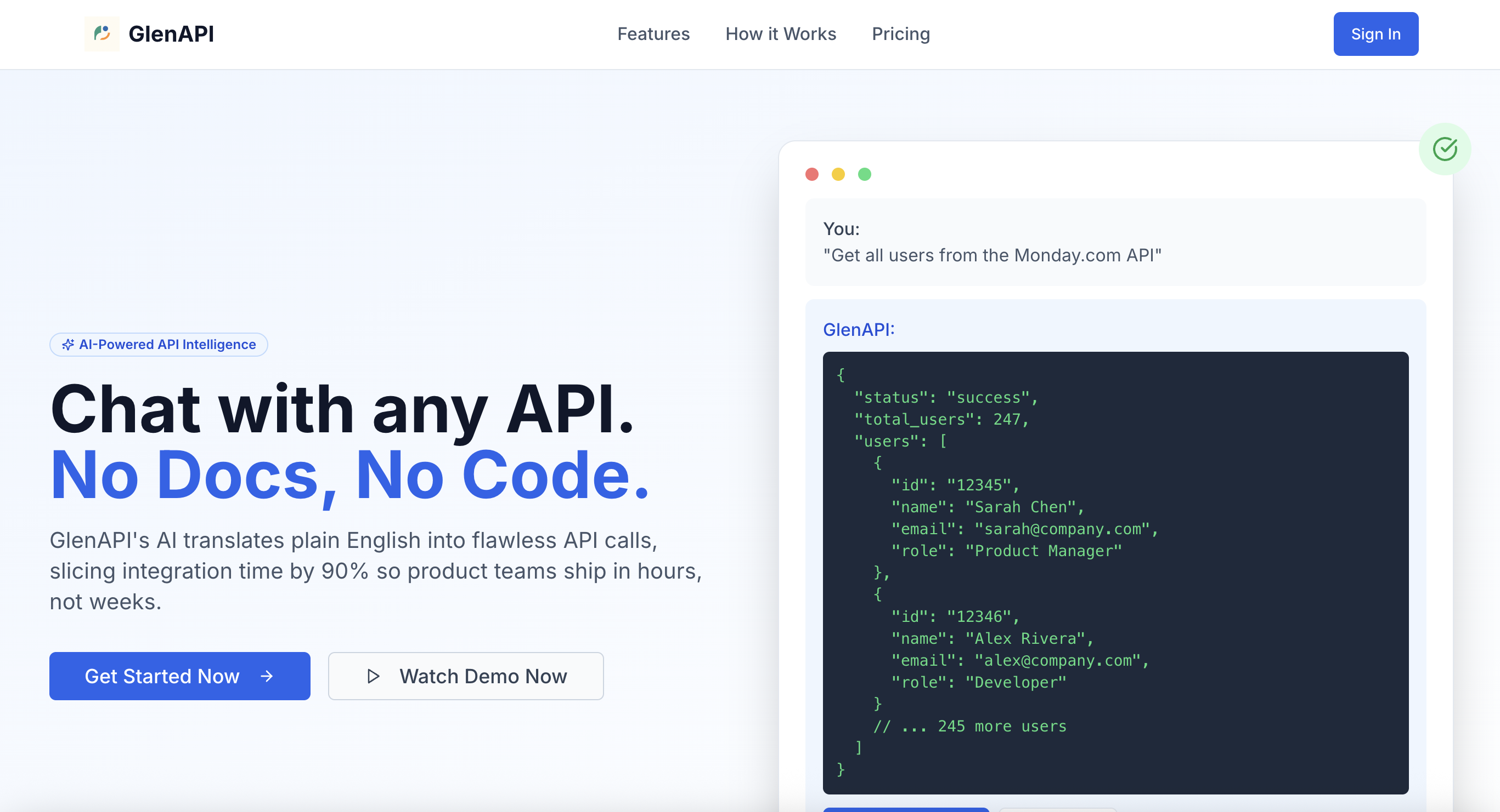 使用GlenAPI与任何API进行对话。无需文档或代码。