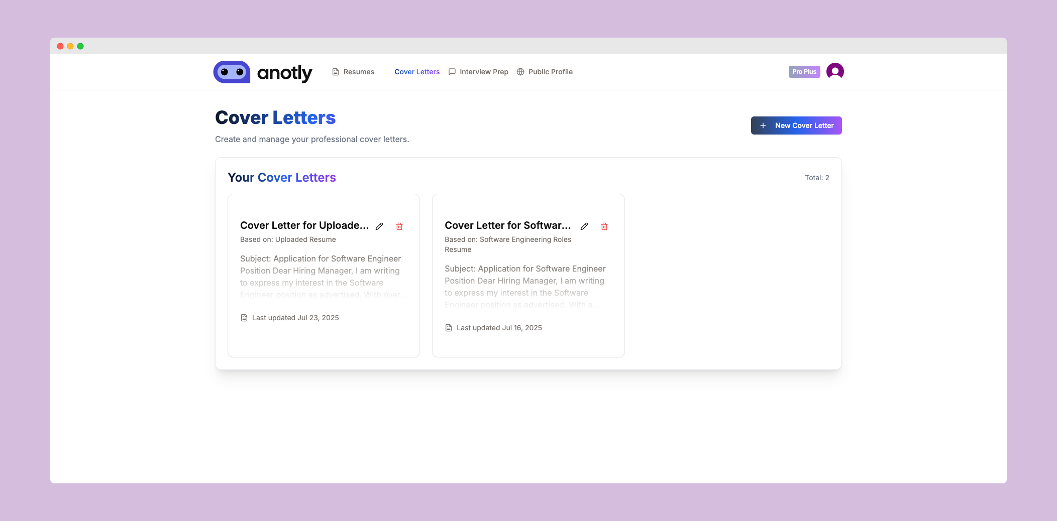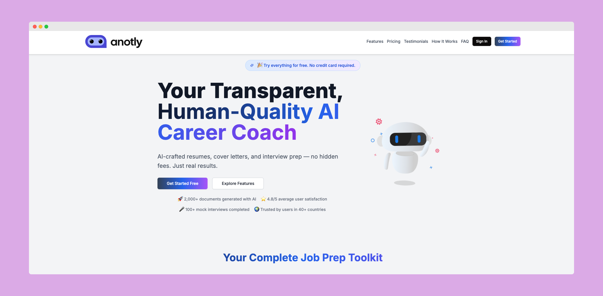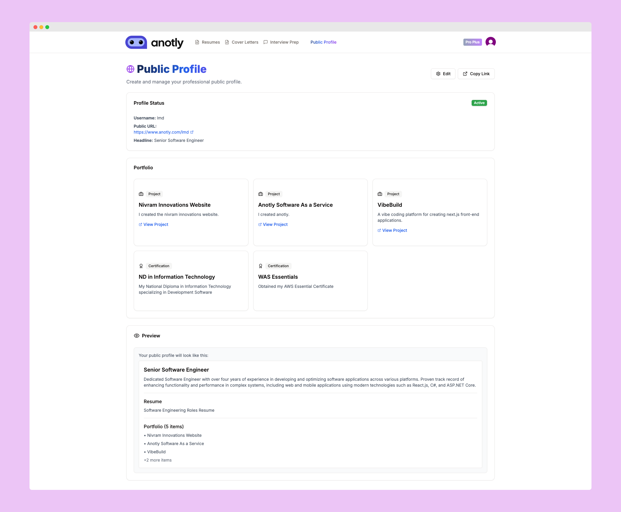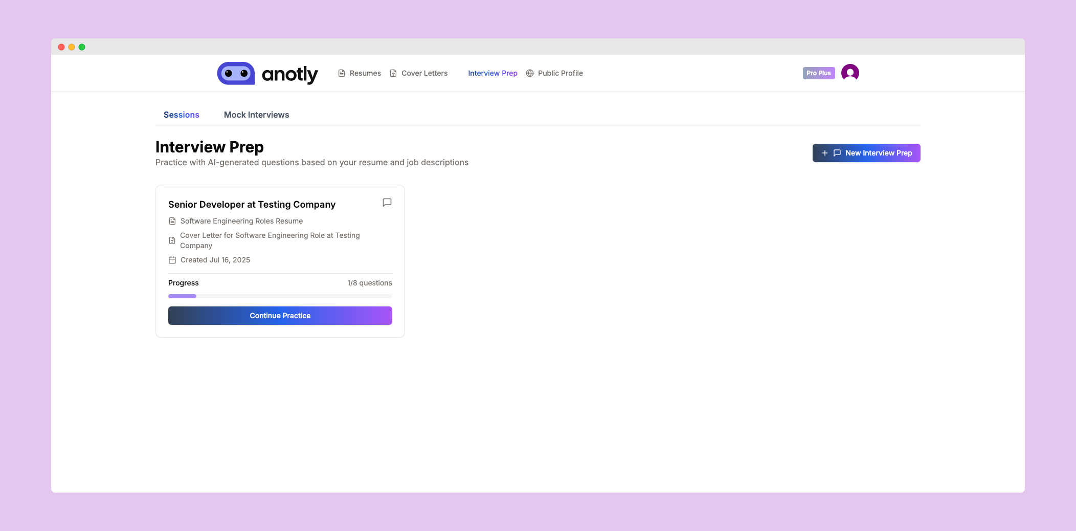 Anotly is your AI career assistant for resumes, cover letters, and mock interviews with real-time feedback. Simple, transparent pricing — no subscriptions. Plus, publish a professional public profile with no coding or hosting required.