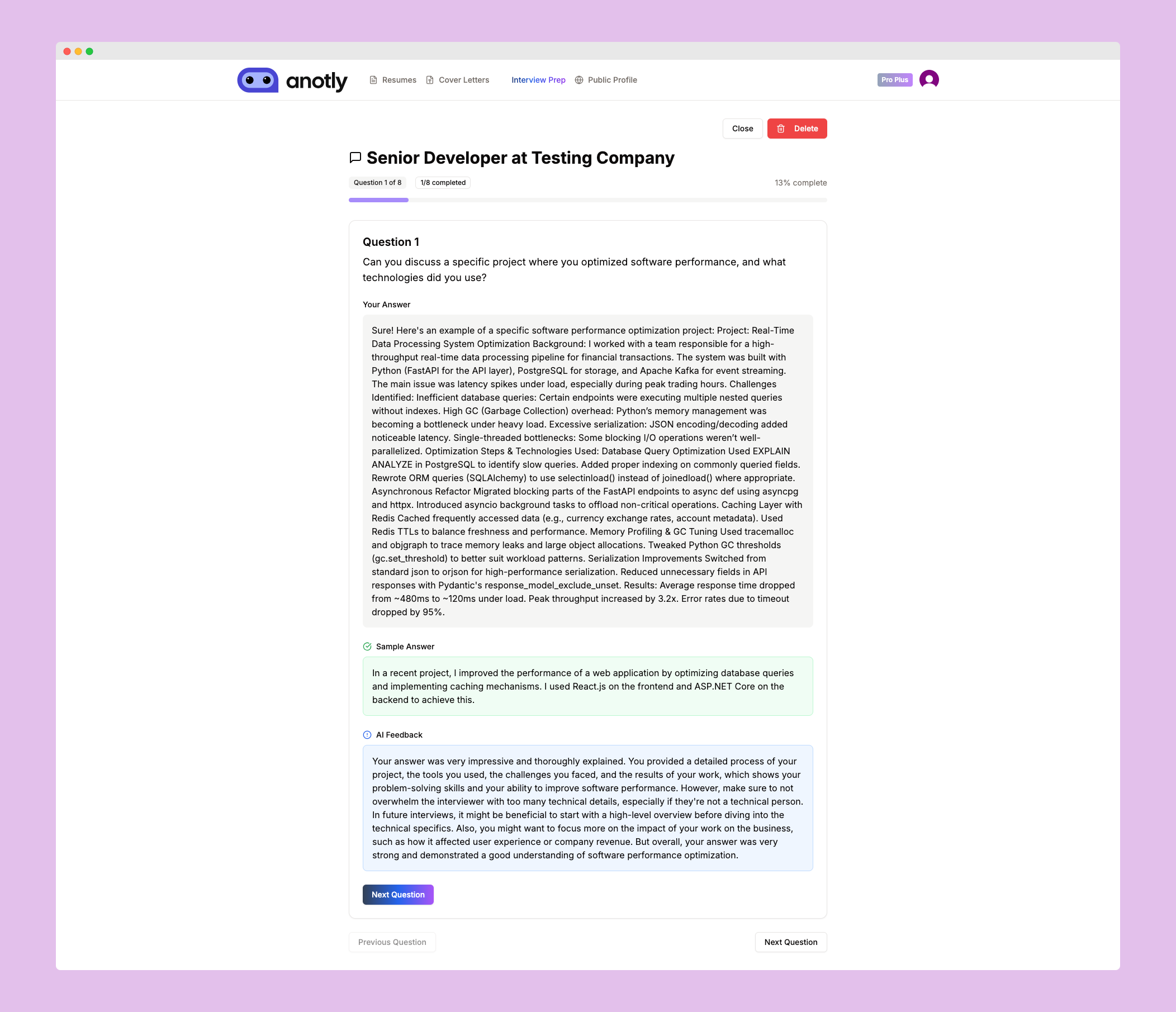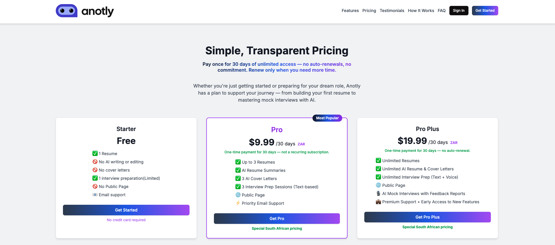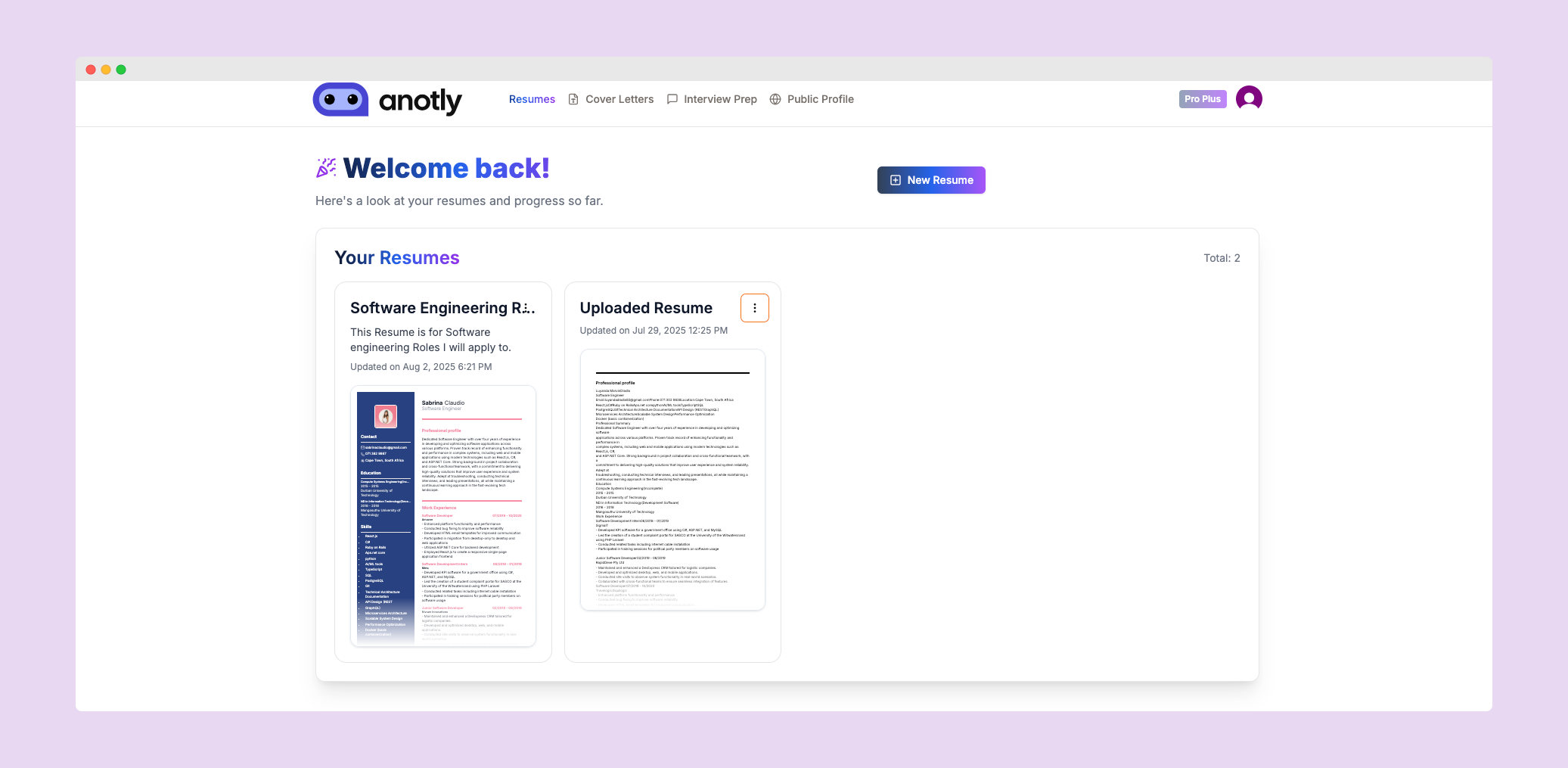 Anotly is your AI career assistant for resumes, cover letters, and mock interviews with real-time feedback. Simple, transparent pricing — no subscriptions. Plus, publish a professional public profile with no coding or hosting required.