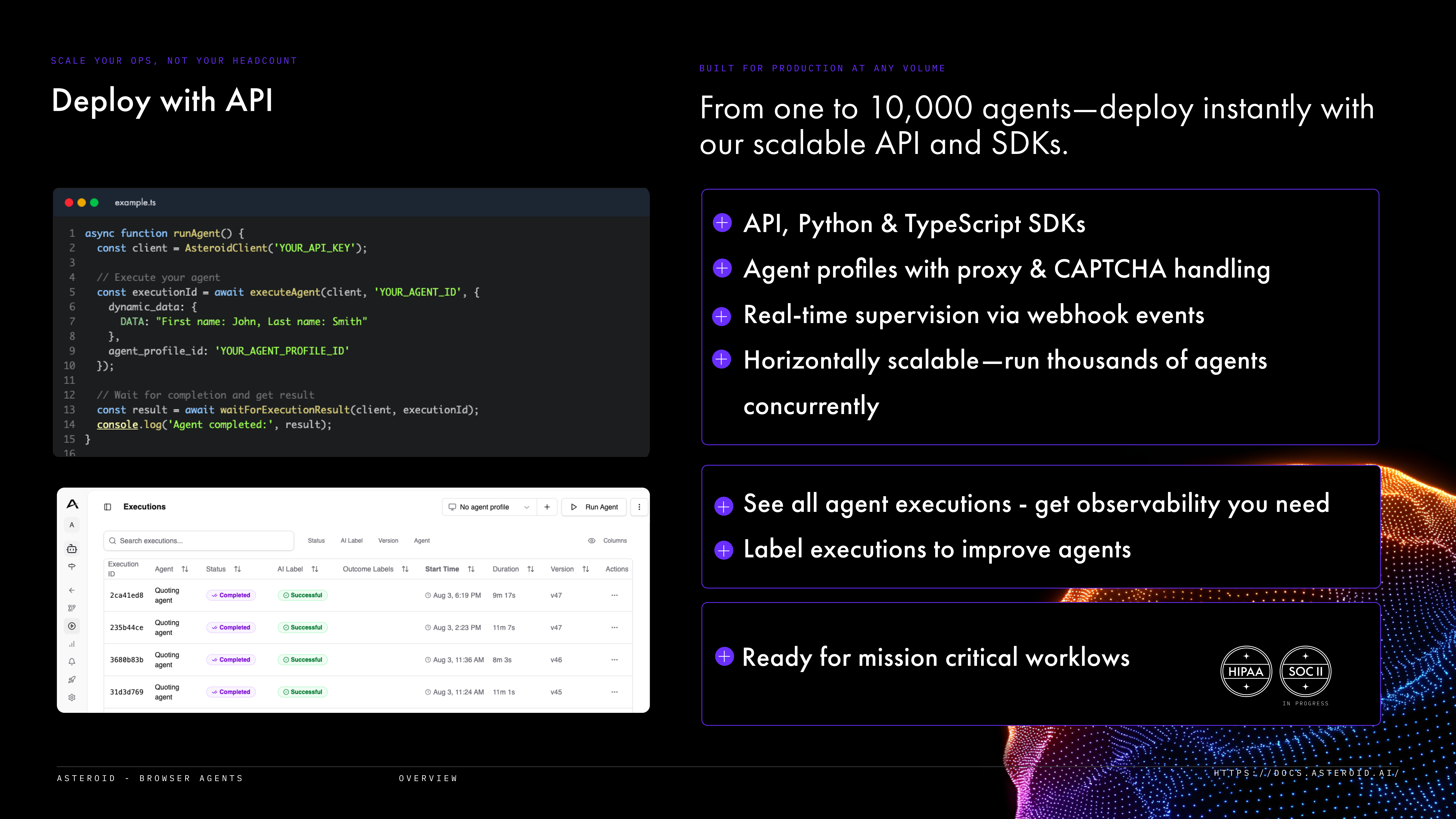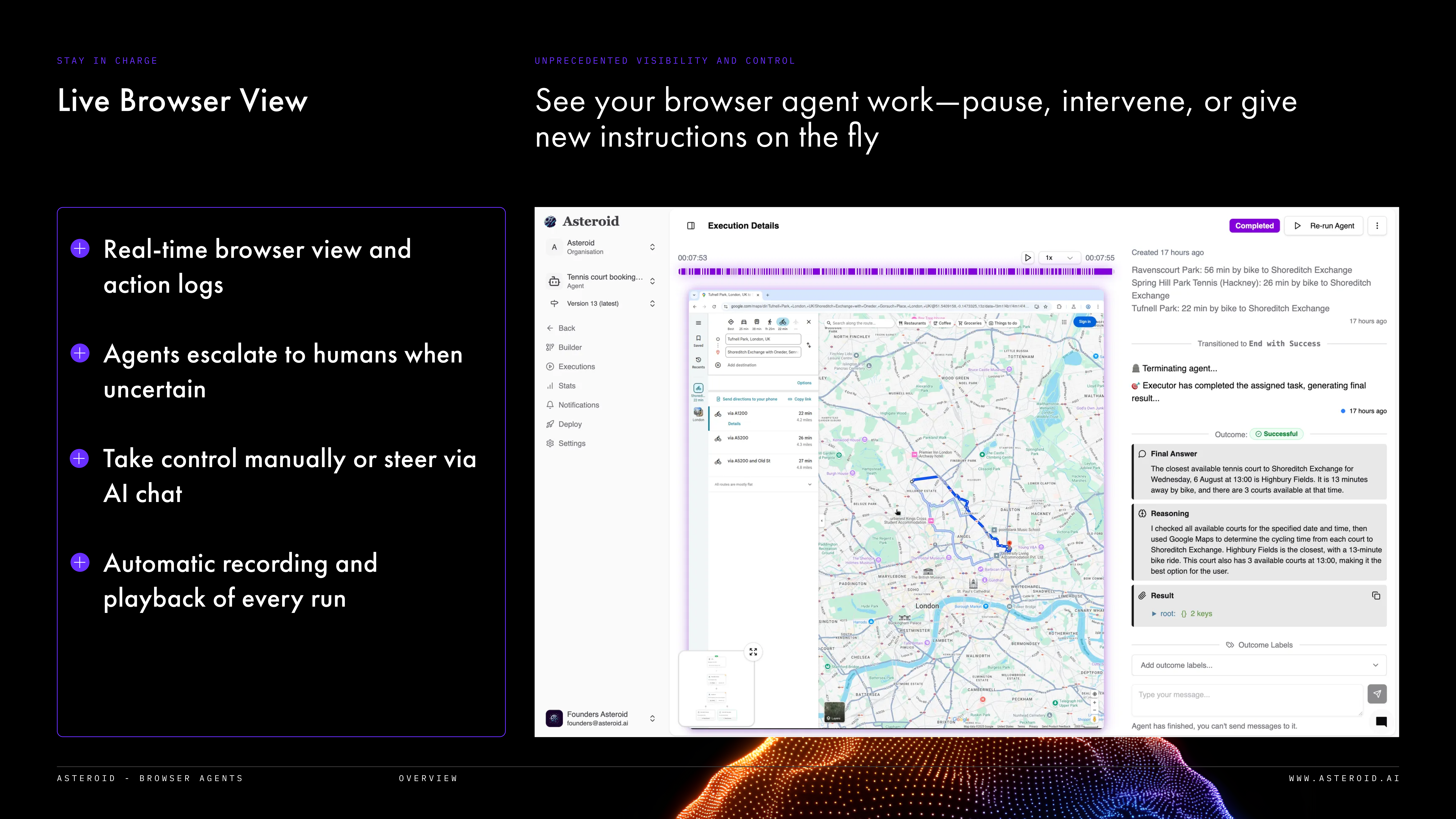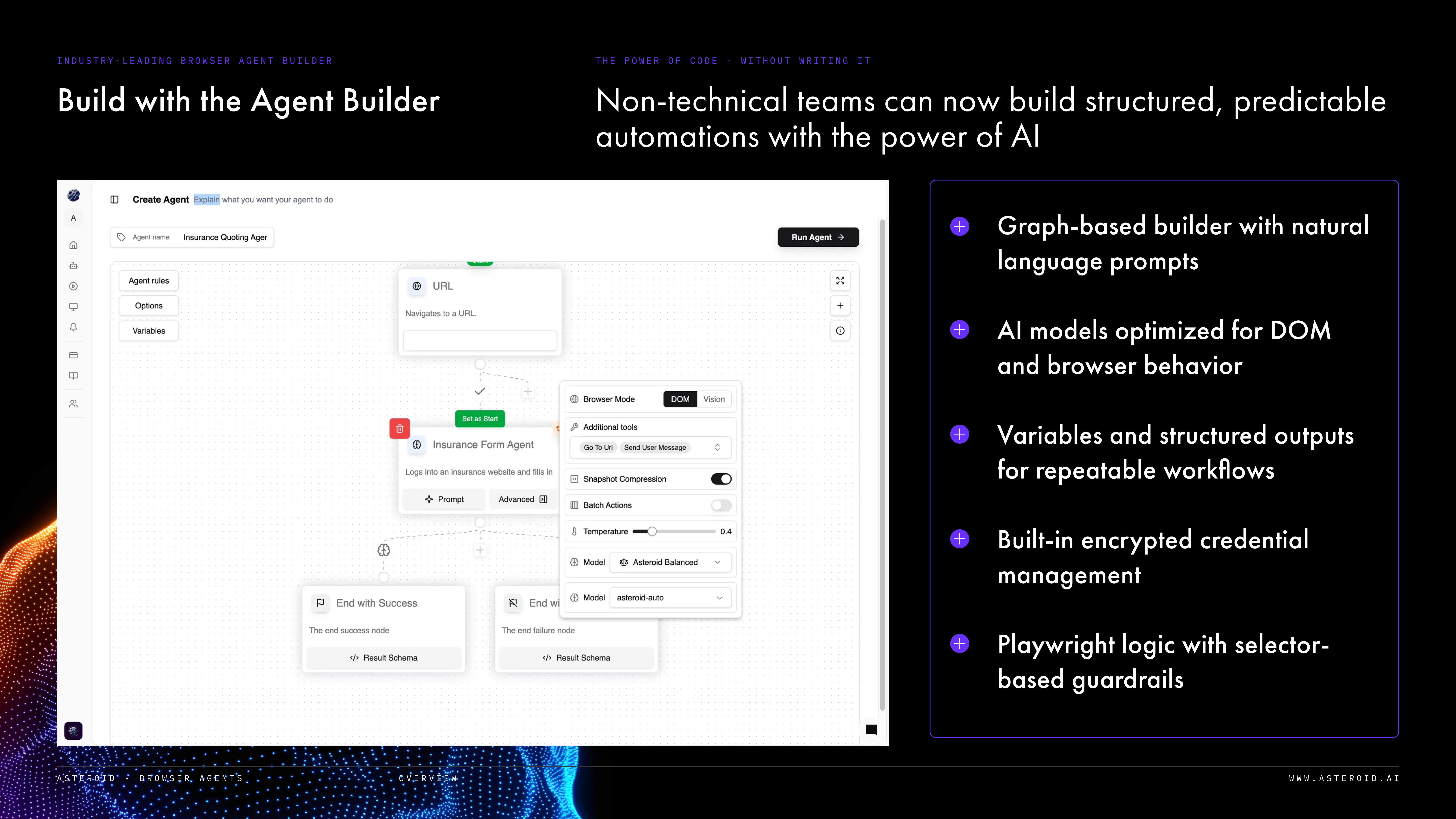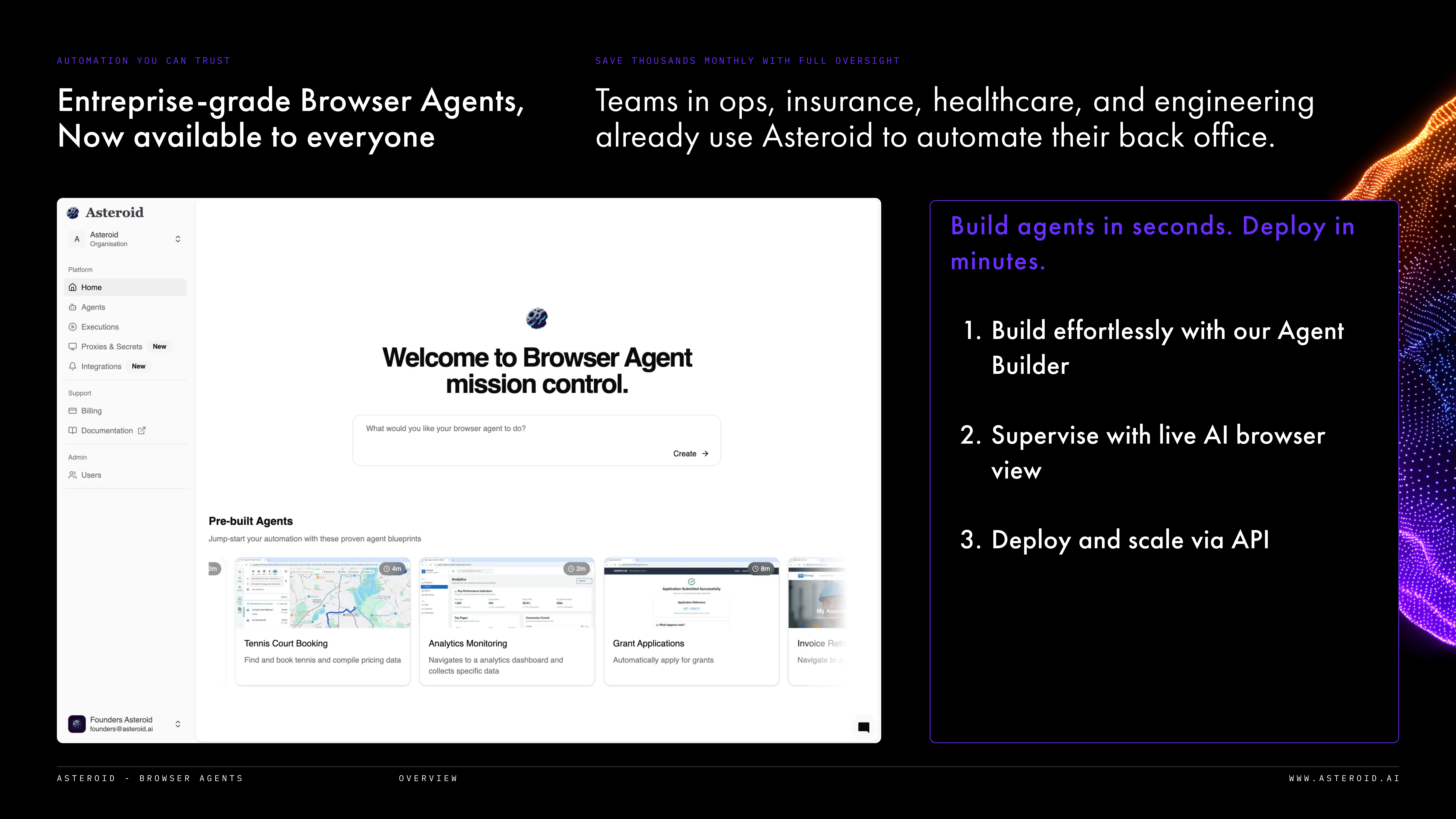 Asteroid lets anyone build highly custom, complex AI browser agents. Both non-technical users and engineers can now reliably automate back office browser tasks 20x faster with Asteroid’s web-based agent builder, API integration, and more.