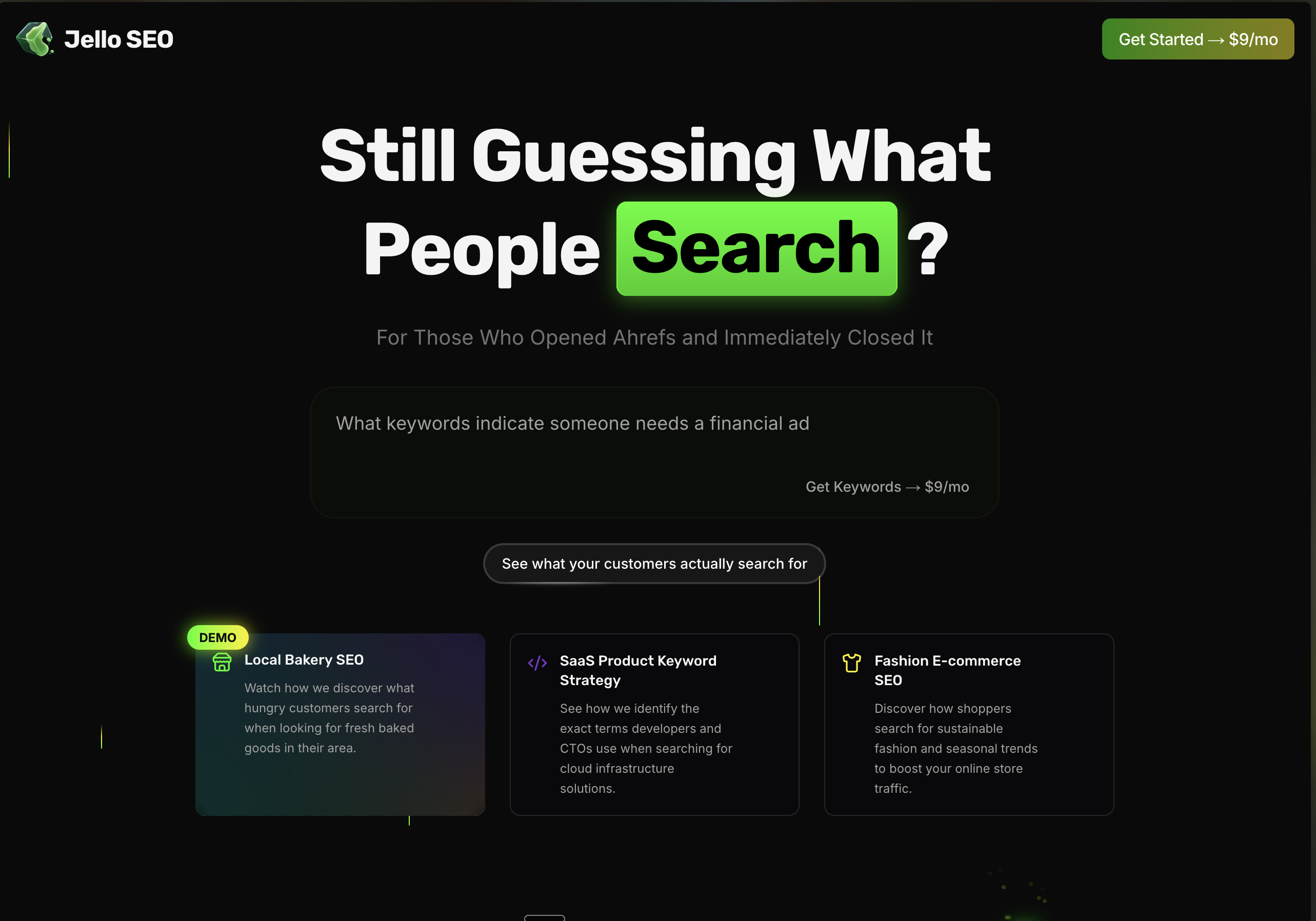 Just describe your business or goal. Jello finds what people actually search for on Google. No complex tools, no SEO jargon. Built for everyone who opened Ahrefs and immediately closed it. Real search data, explained in plain English. $9/month.