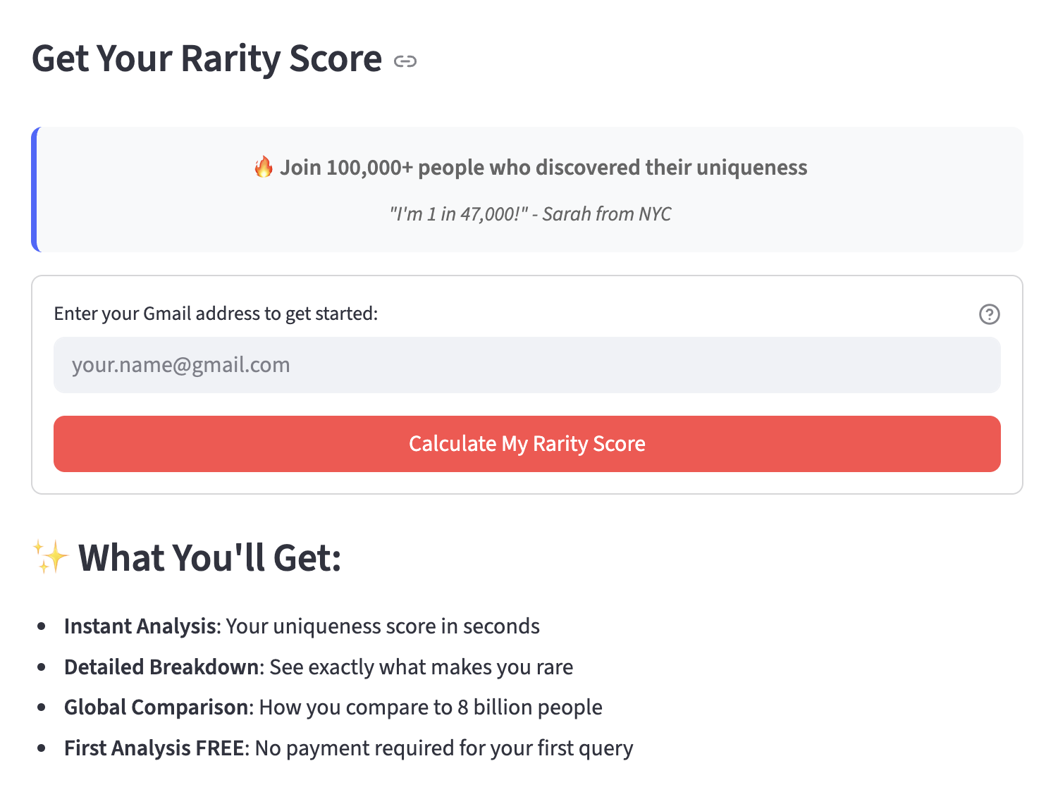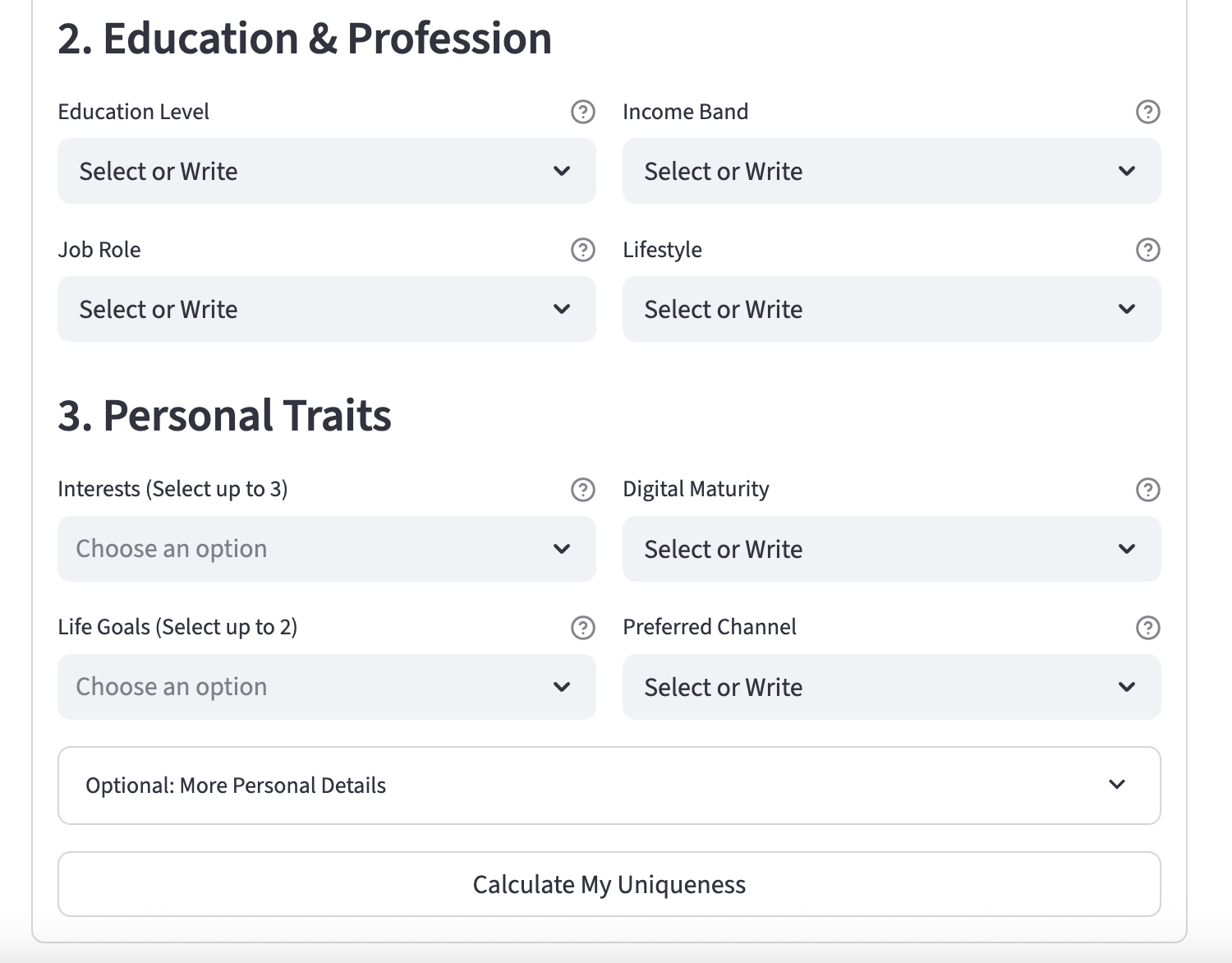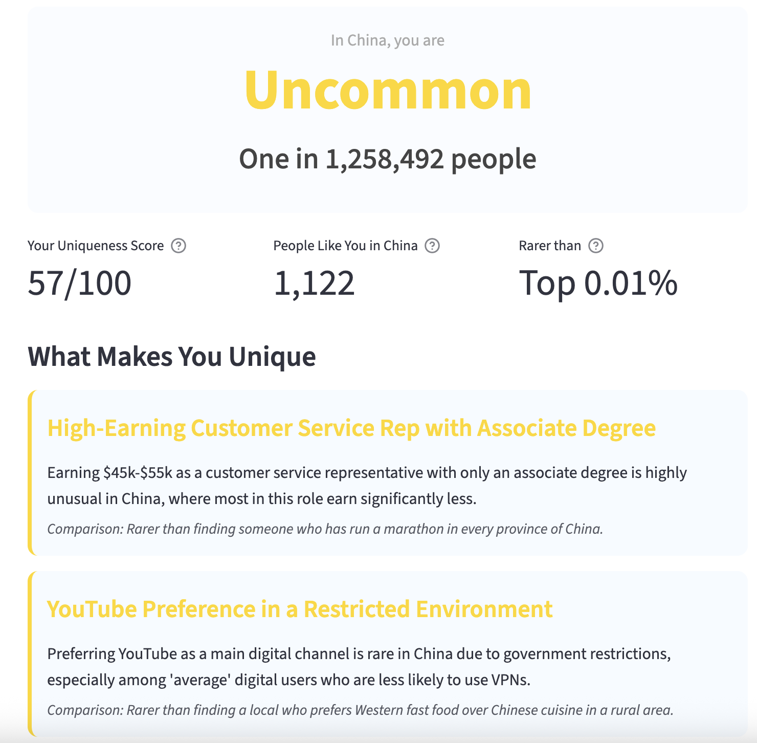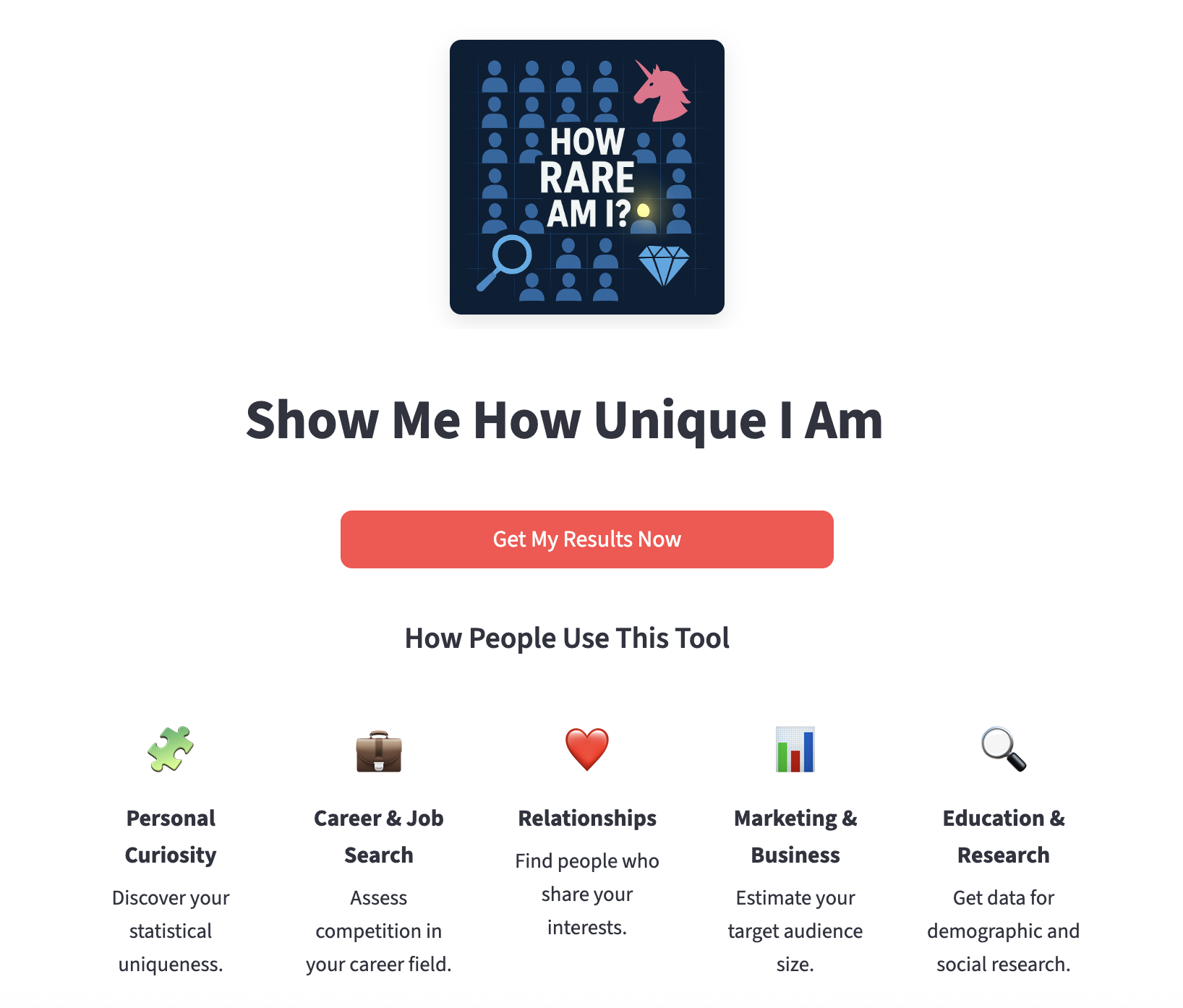 An AI agent compares your answers to a live dataset and tells you how rare (or common) your profile is. Use it to: – Measure your statistical uniqueness – Assess competition in your field – Find people like you – Estimate your audience size