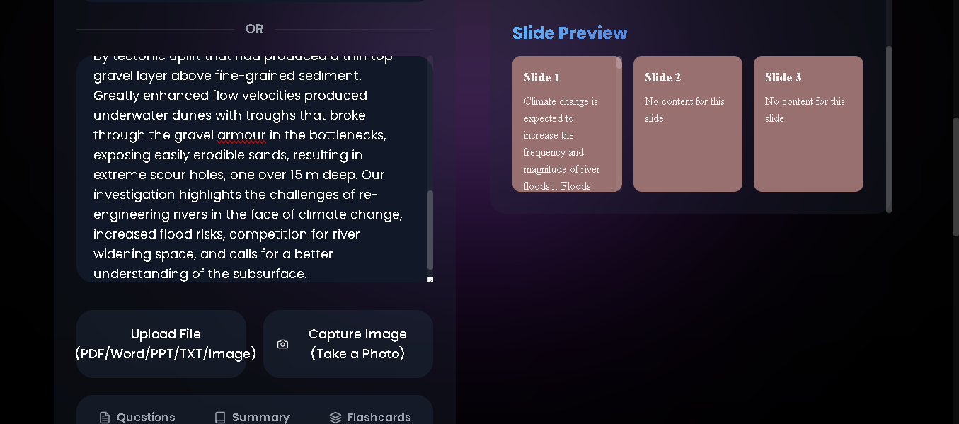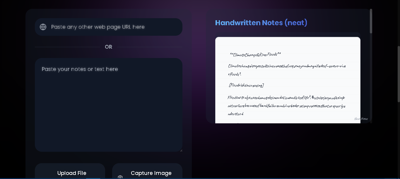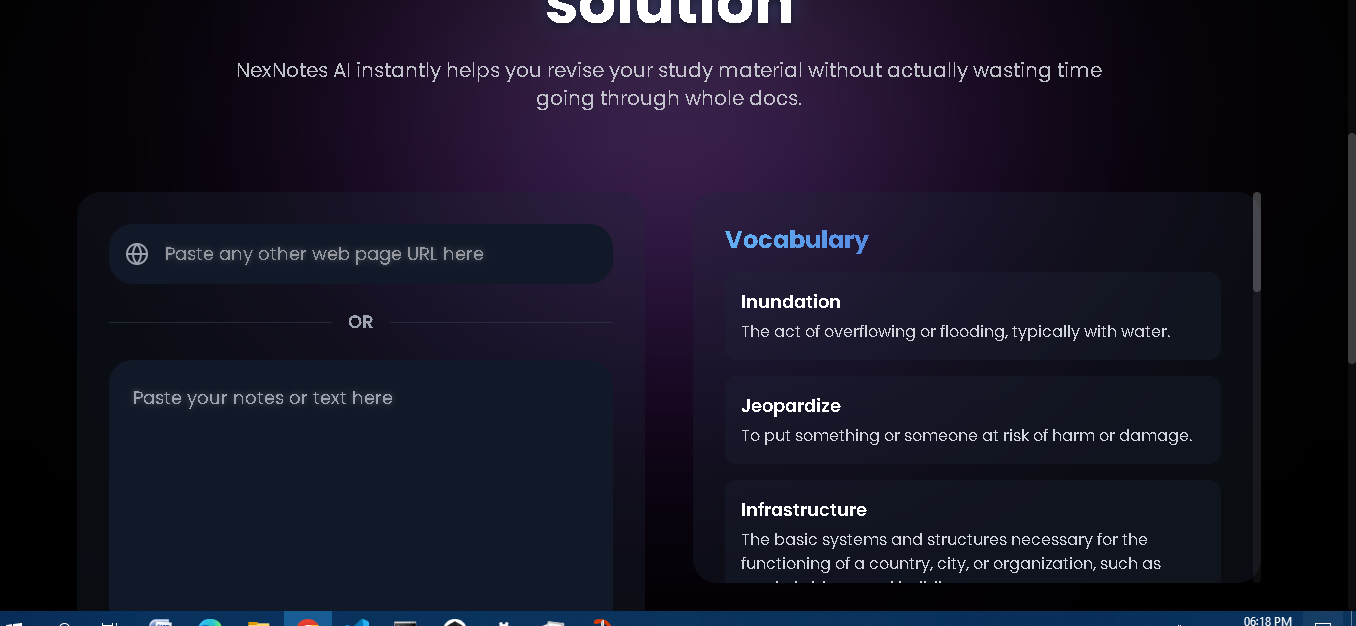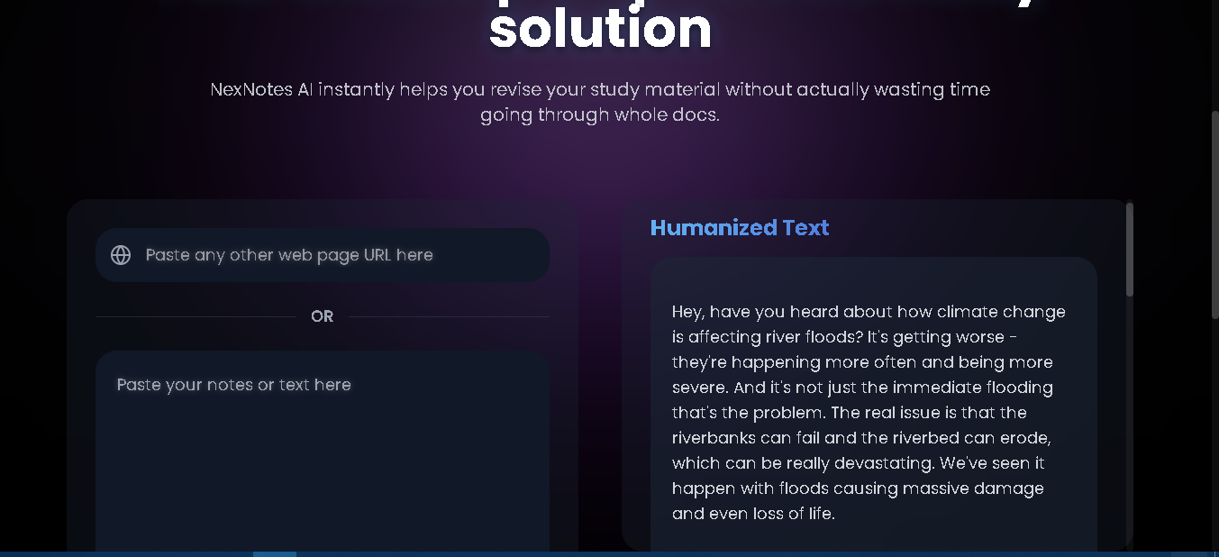 NexNotes AI is a single AI tool that replaces 10 AI tools for studying. It has several features- Generate PPTs and study plans! Mind maps and diagrams handwritten text from content Humanized content get summaries and quizzes get flashcards get vocab words Q&A