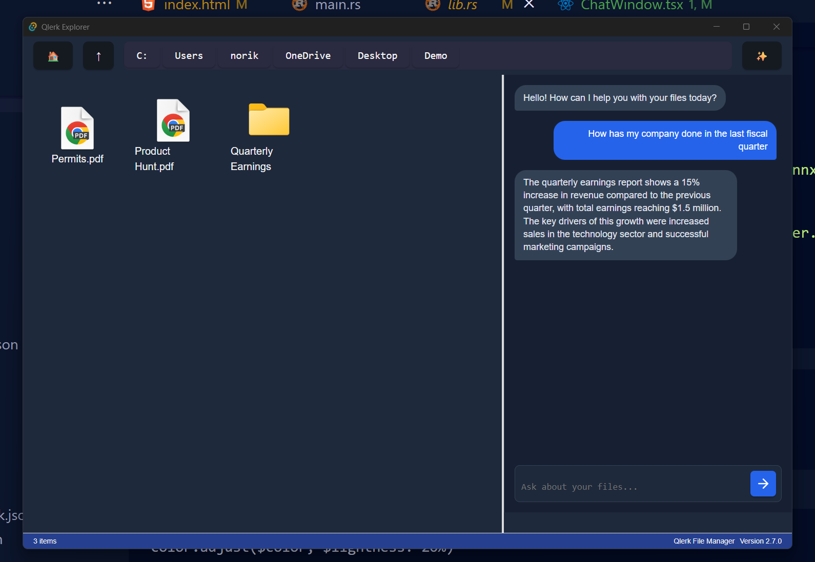 Qlerk is an AI-native file explorer that puts a chatbot on your local files. Instantly summarize, analyze, and organize documents just by asking questions. Your data never leaves your machine. Fast, secure, and 100% private. Join the waitlist for early access!