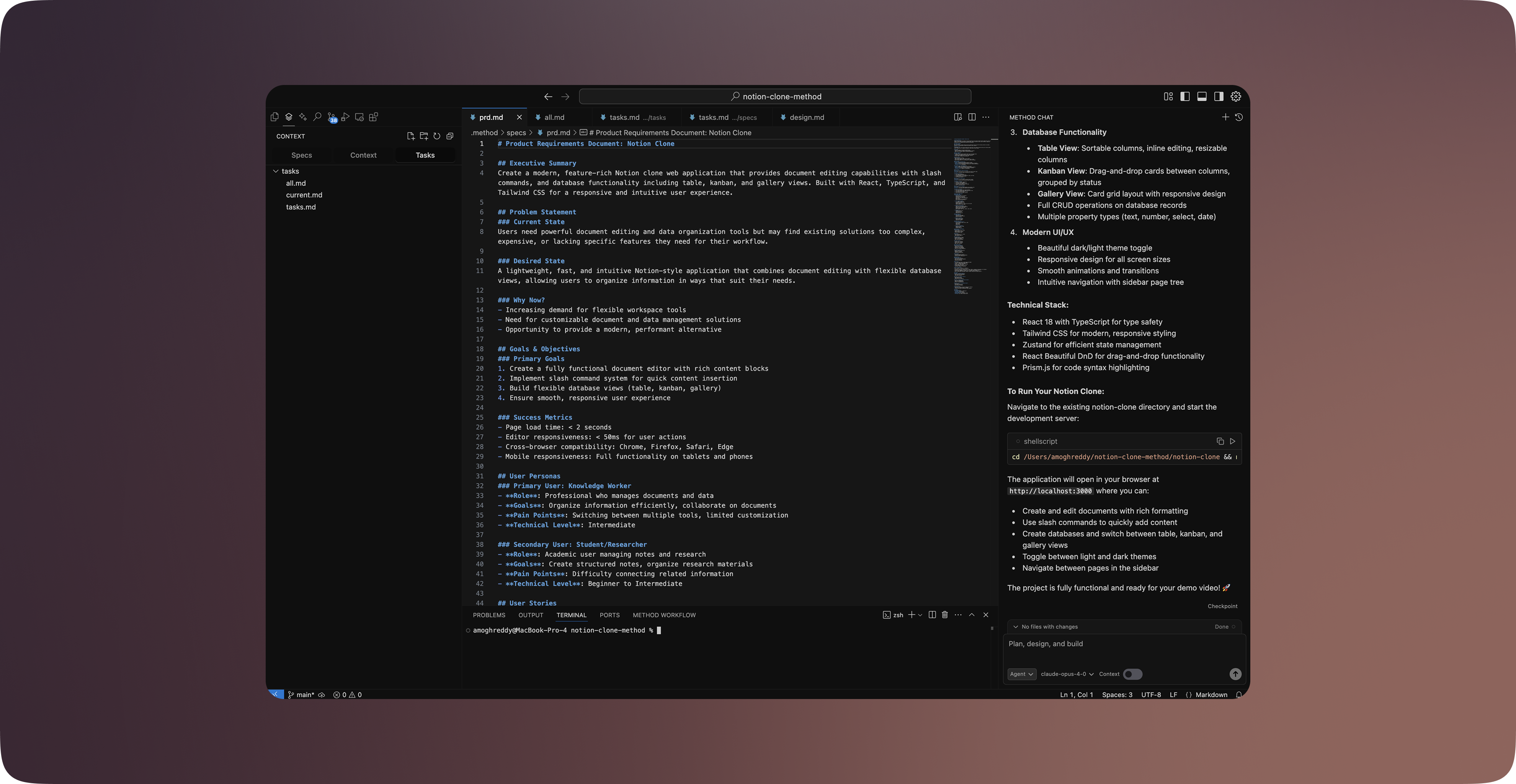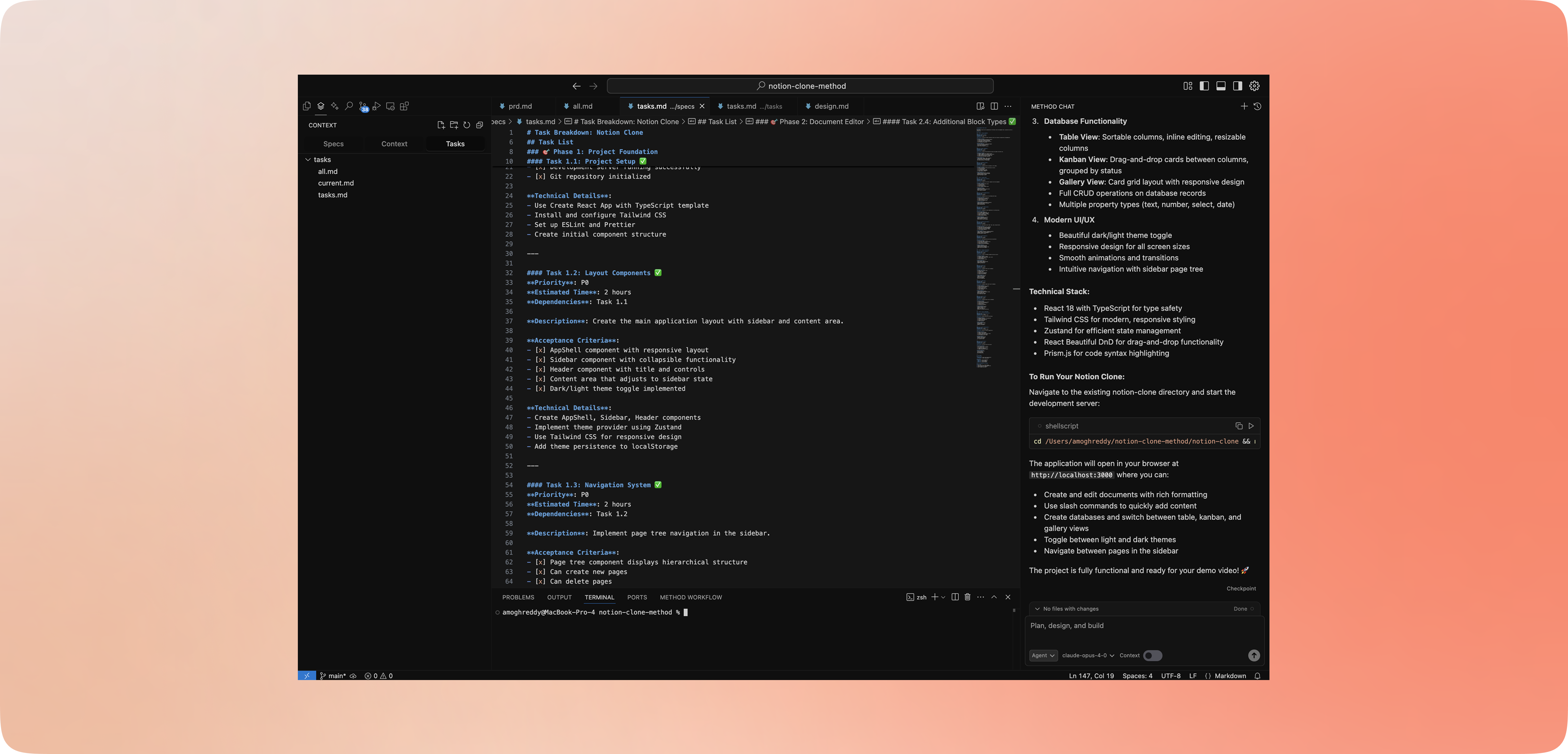 一支完整的工程团队常驻于你的IDE中。Method能够将提示转化为详细规格,将用户故事拆解为具体任务,甚至能协调多个专业编码代理(架构、性能、安全)协同工作——所有这些功能都无需离开你的编辑器。