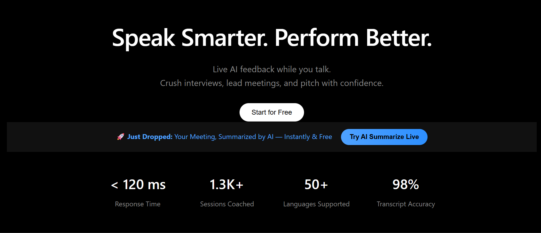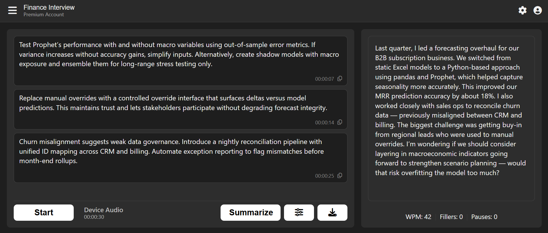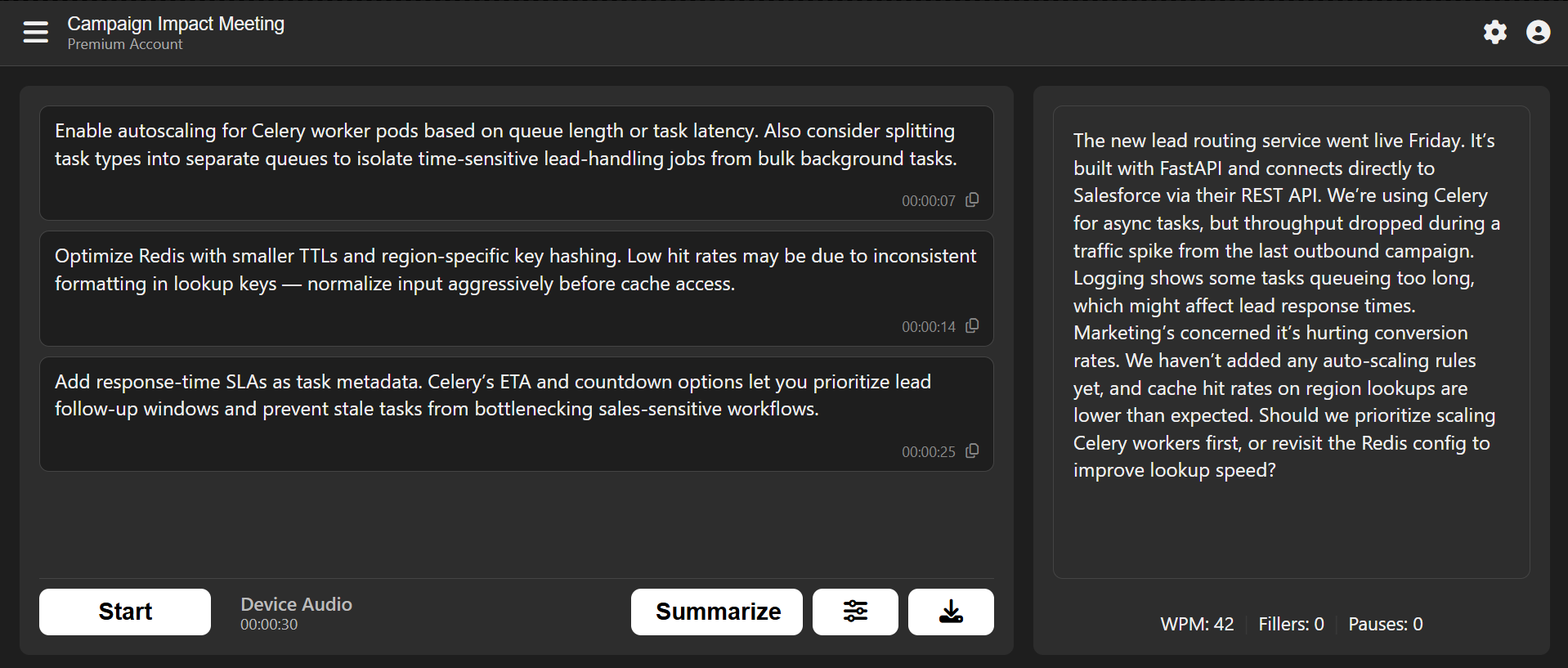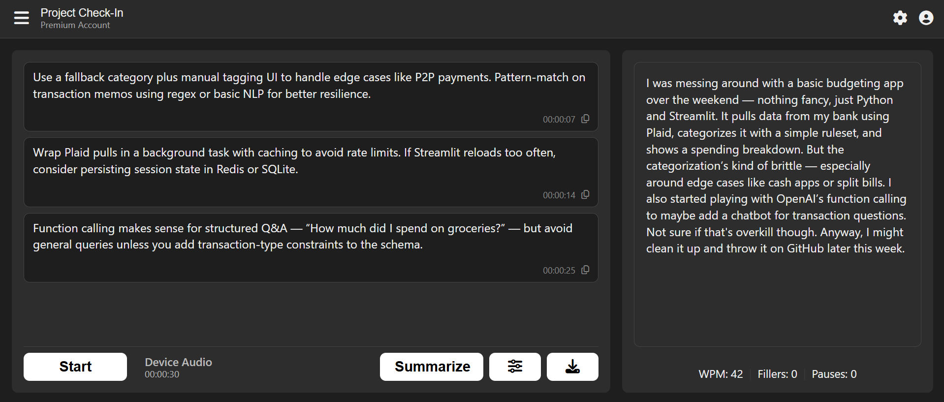 Live Transcript GPT gives you real-time AI feedback, transcription, and GPT coaching. Track filler words, pace, and clarity as you speak using GPT-5 + Whisper. Summaries are auto-generated and exportable. No subscription needed — start instantly, free.