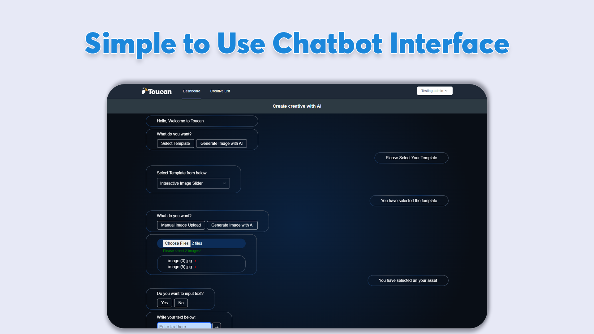 Toucan AI turns static and video assets into HTML5 interactive rich media ads—fast. Choose from stunning interactive formats, export in ad-friendly dimensions, and generate visuals with the built-in AI image tool. No design or code needed.