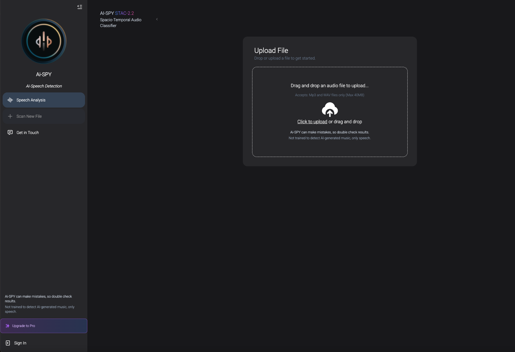 我们非常高兴向所有人推出我们的平台!提供免费版和每月4.99美元的高级版两种方案,高级版包含高级分析功能,您可以轻松上传音频,检测它是AI生成还是人声生成。Ai-SPY快速且用户友好,让您听得放心!