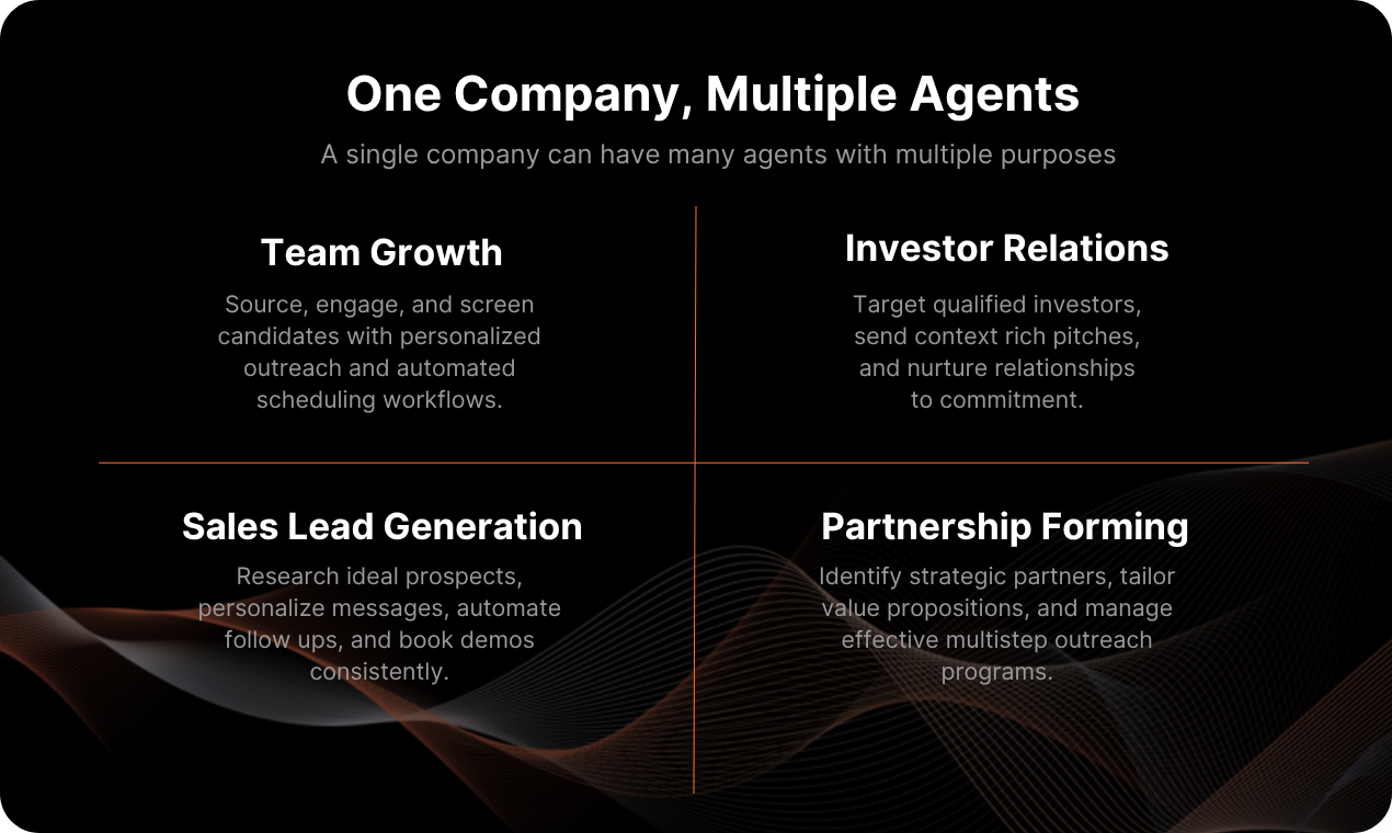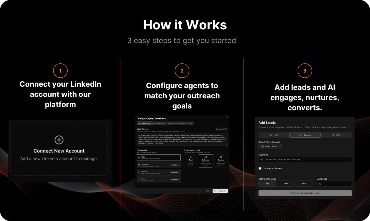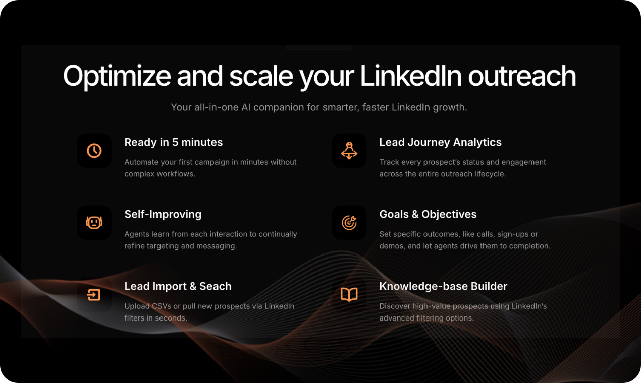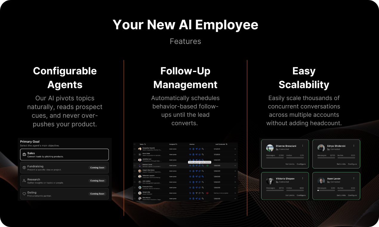 Fully automated conversational AI for LinkedIn outreach, end to end. Chases down your leads, holds indistinguishable-from-real chats, manages follow ups, and fills your calendar with the right meetings, visits, and sign ups with no manual workflows.