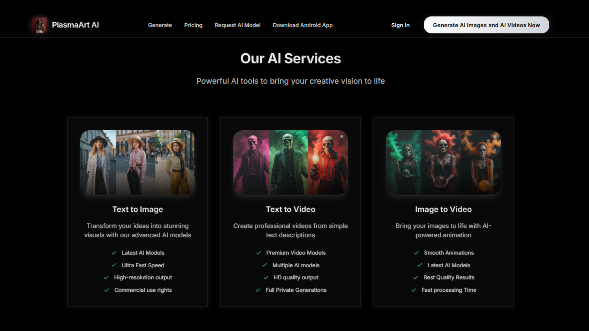 使用专业级工具,创造令人惊叹的AI生成图像和视频。PlasmaArt AI提供高质量生成,无水印,可商用。从概念到杰作——PlasmaArt AI以闪电般的速度生成专业品质的图像和视频。