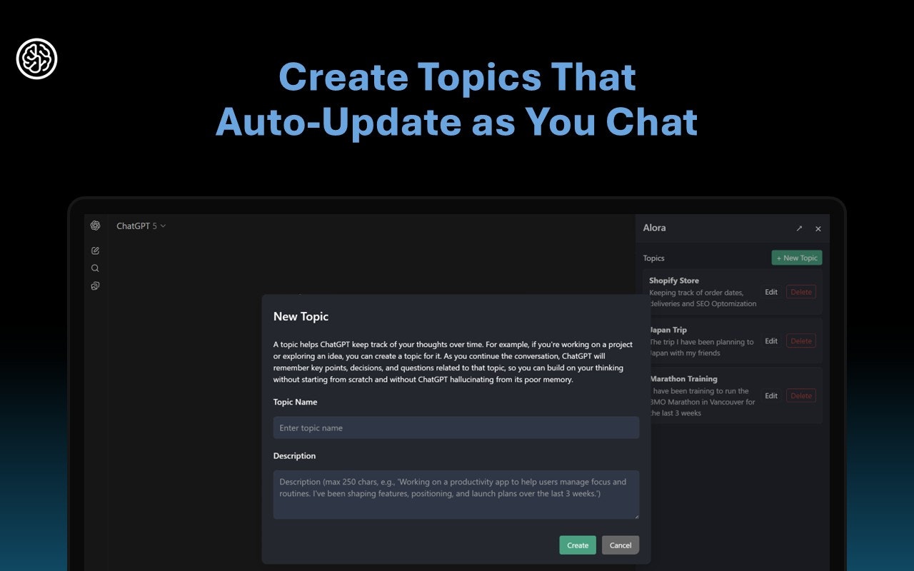 Alora为您提供跨AI工具的用户可控记忆功能。您可以创建能够学习并在聊天过程中自动更新的主题,然后将正确的上下文注入任何对话。无需反复解释——每次都能获得更快速、更准确的回答。